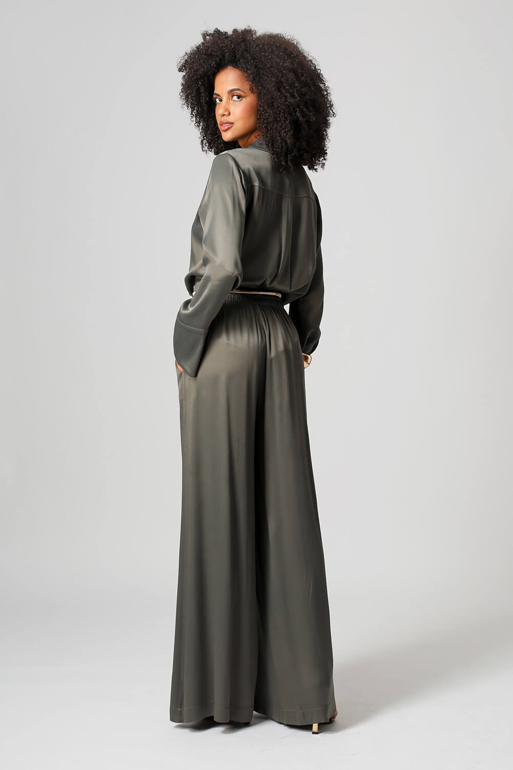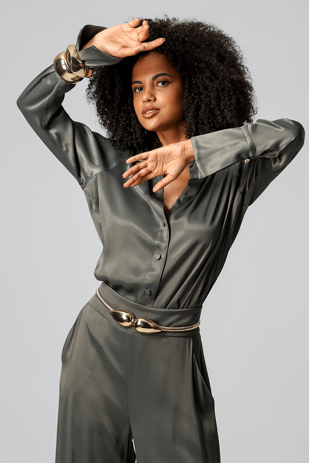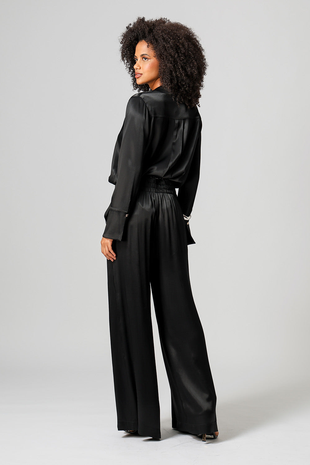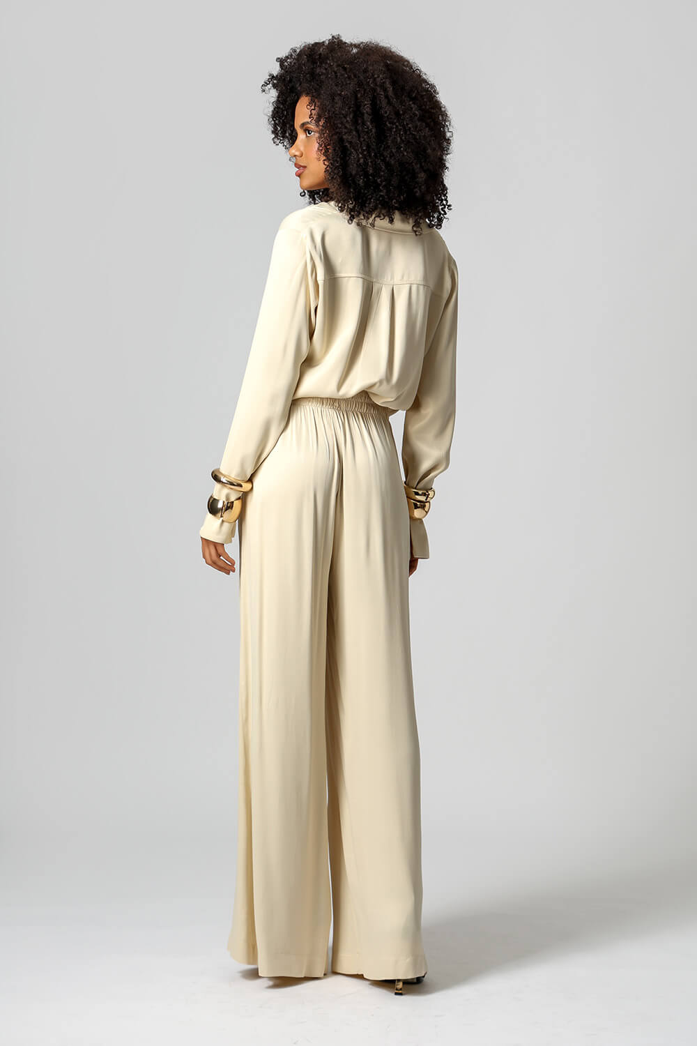 Elegante e sofisticada, a camisa em cetim premium possui punhos largos com fechamento por botão e design clássico que valoriza qualquer produção