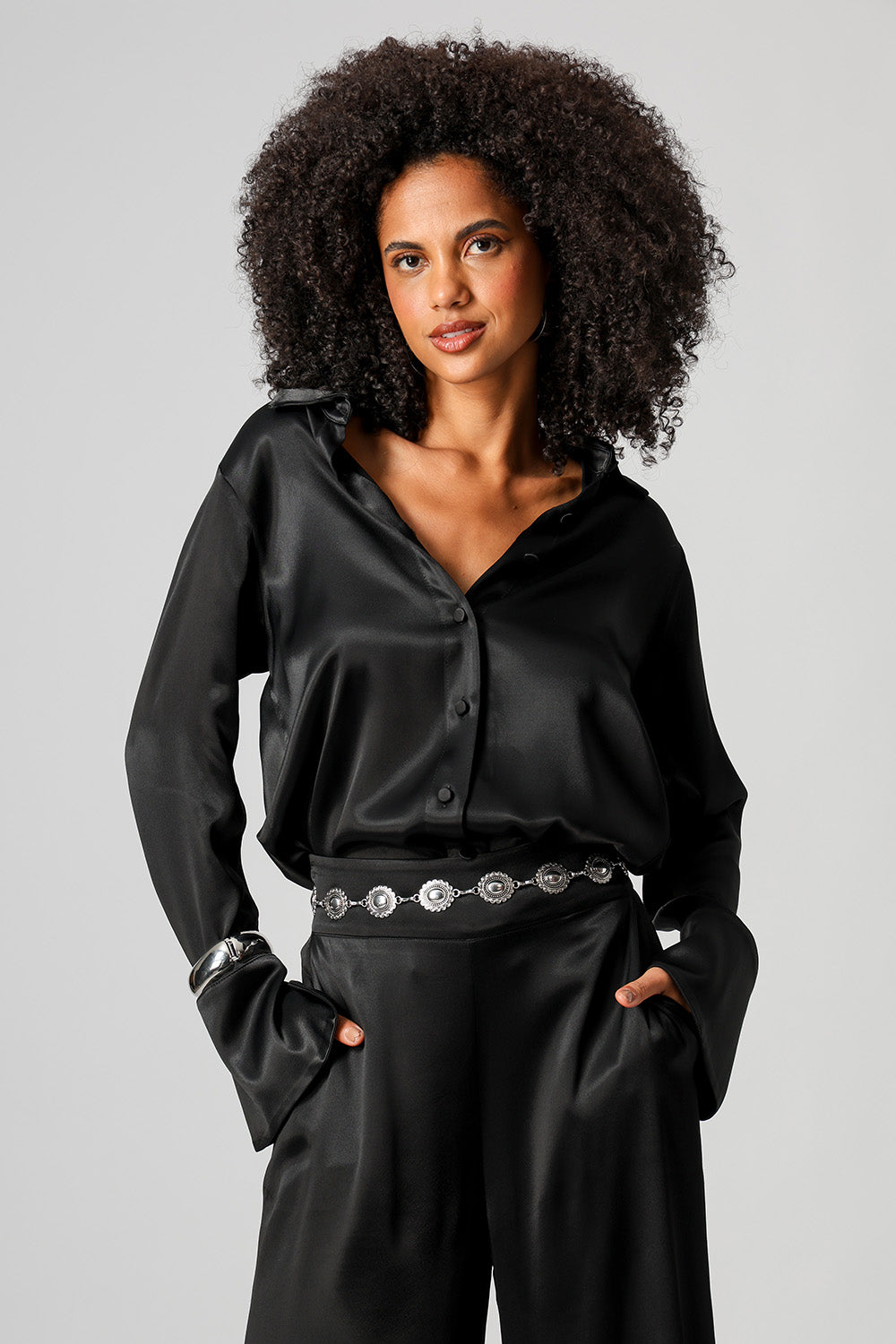 Elegante e sofisticada, a camisa em cetim premium possui punhos largos com fechamento por botão e design clássico que valoriza qualquer produção