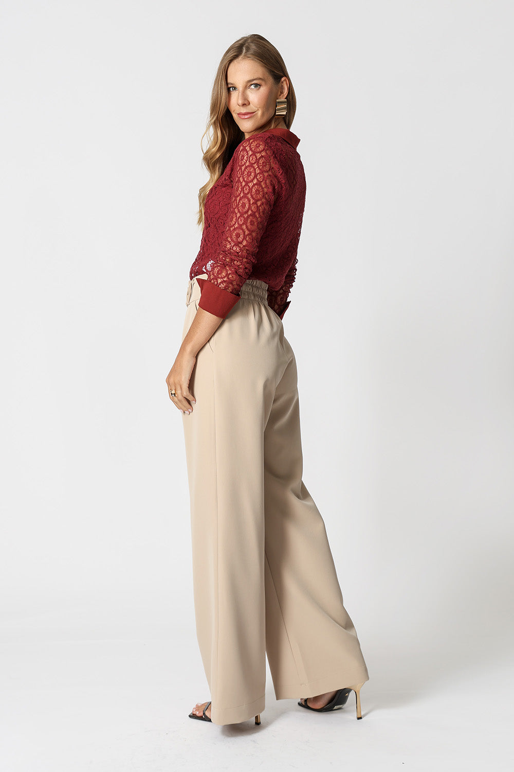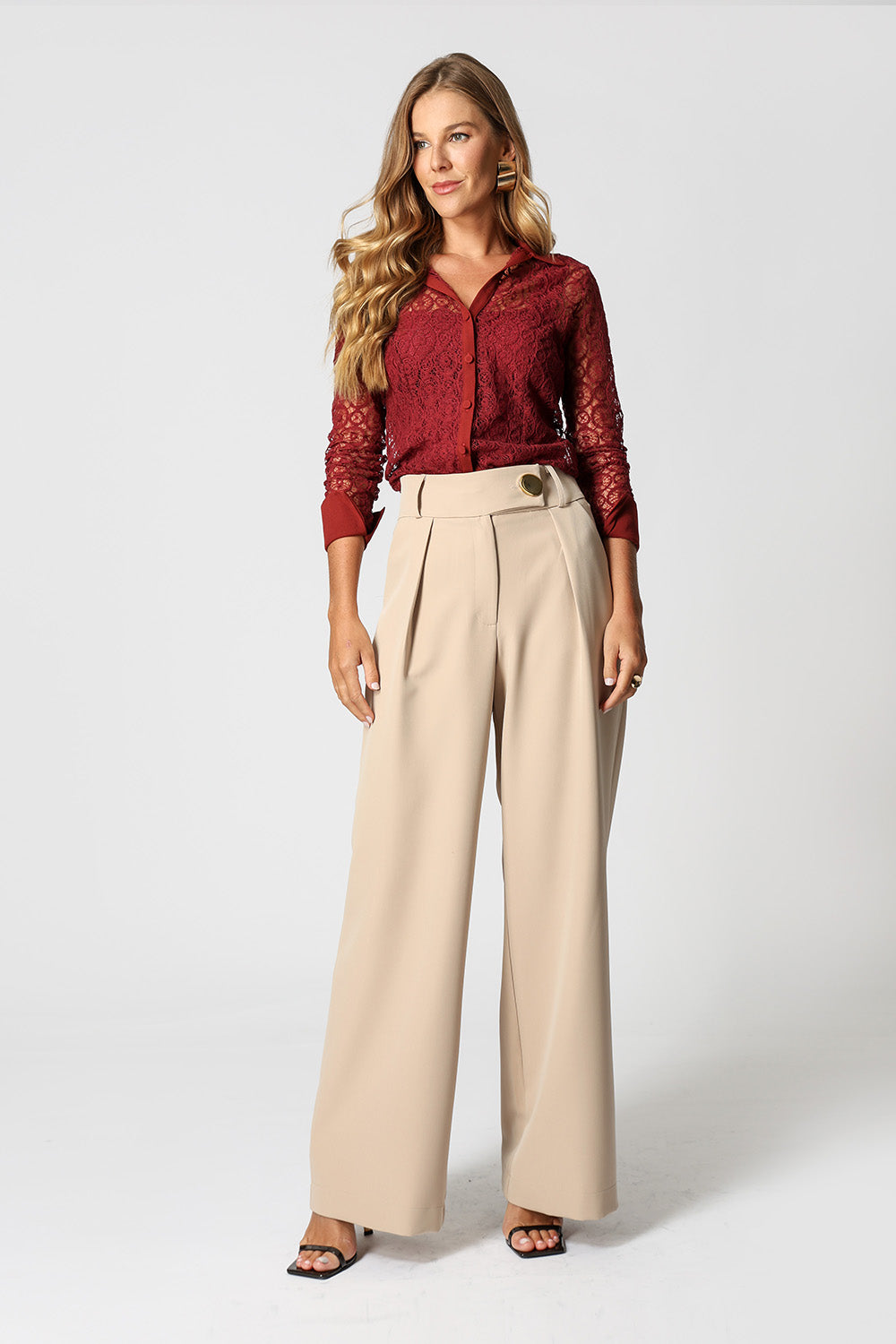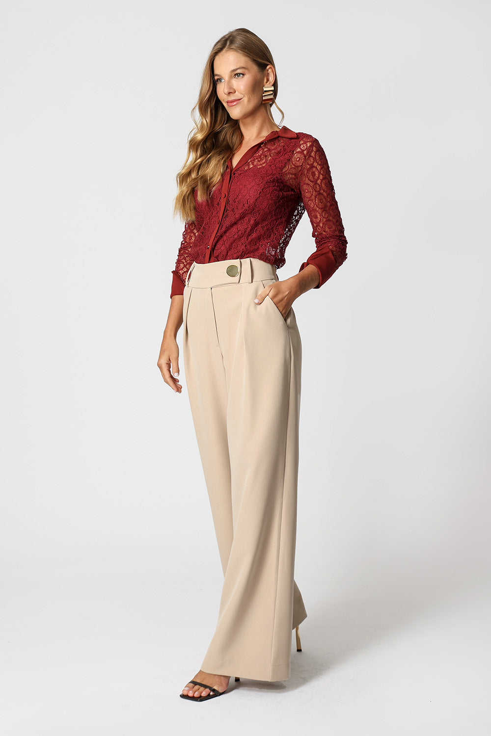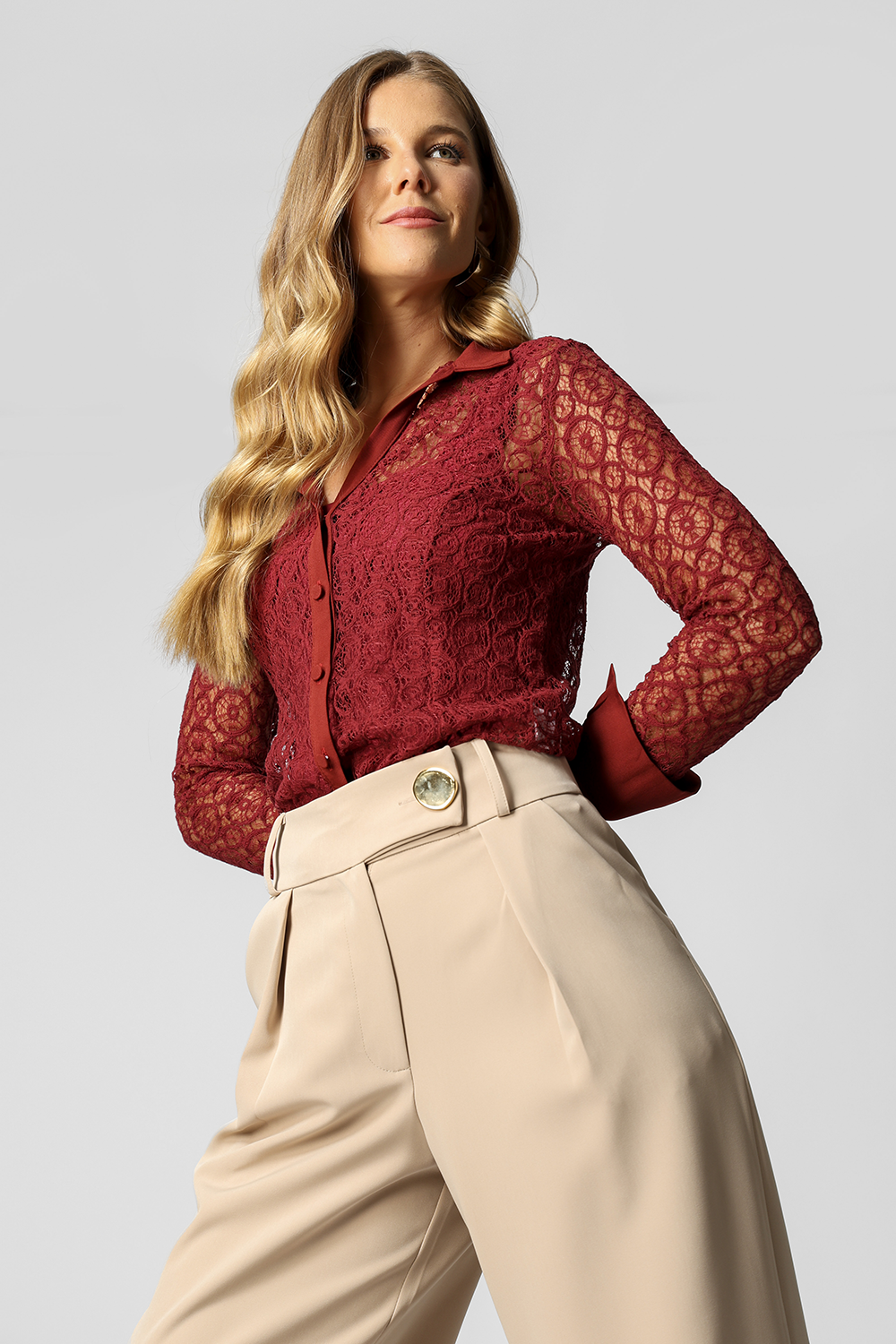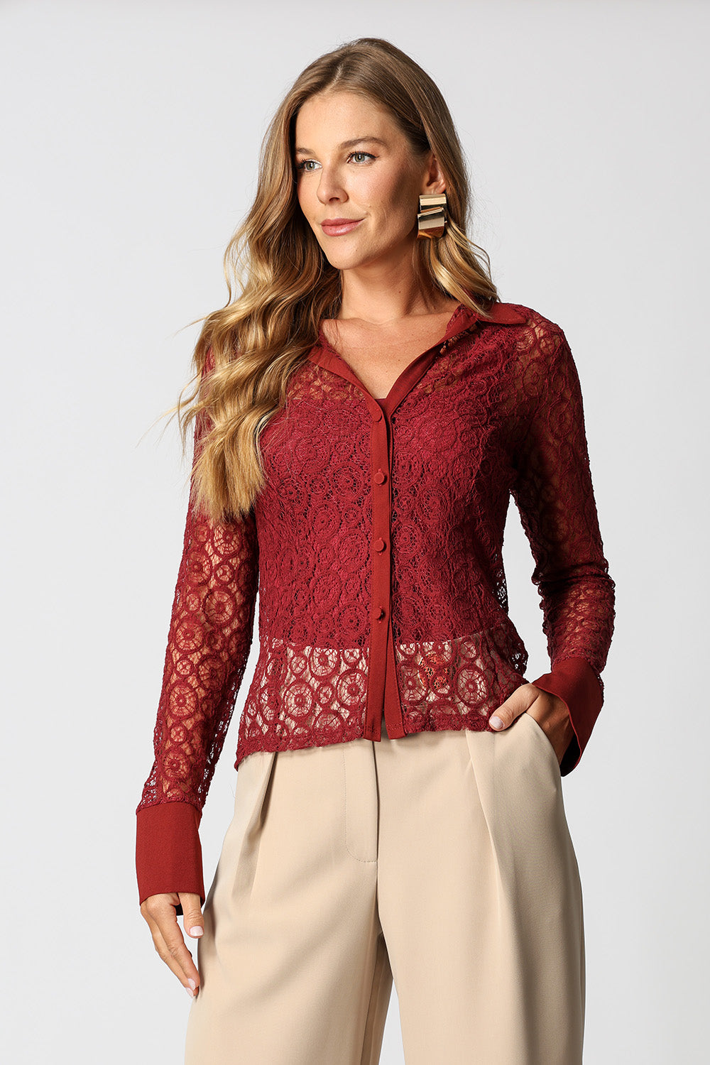 Camisa de renda transparente elegante e sofisticada. Confeccionada com um tecido delicado e detalhado, ela valoriza qualquer look com um toque romântico e moderno.
