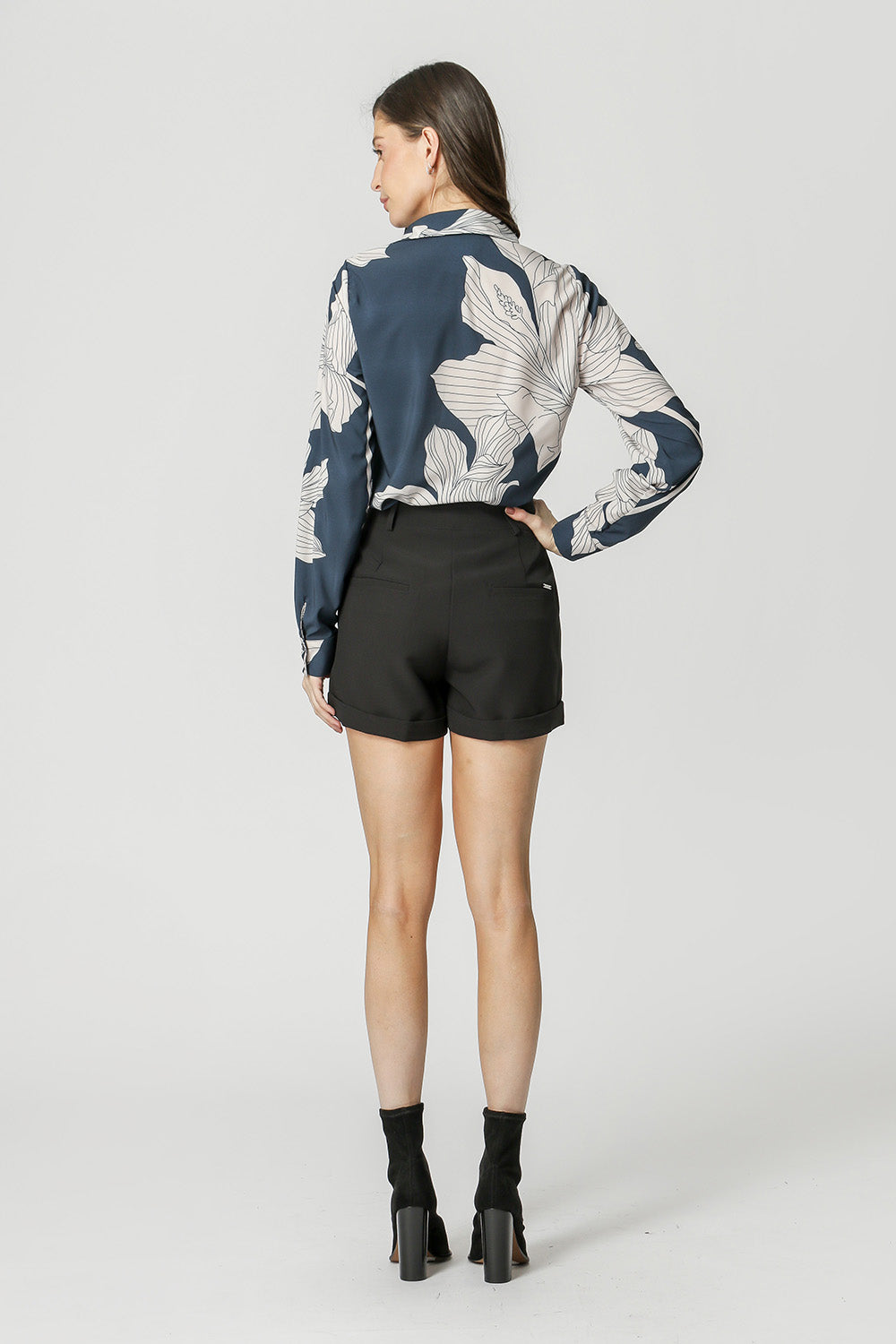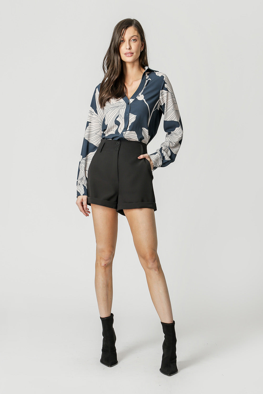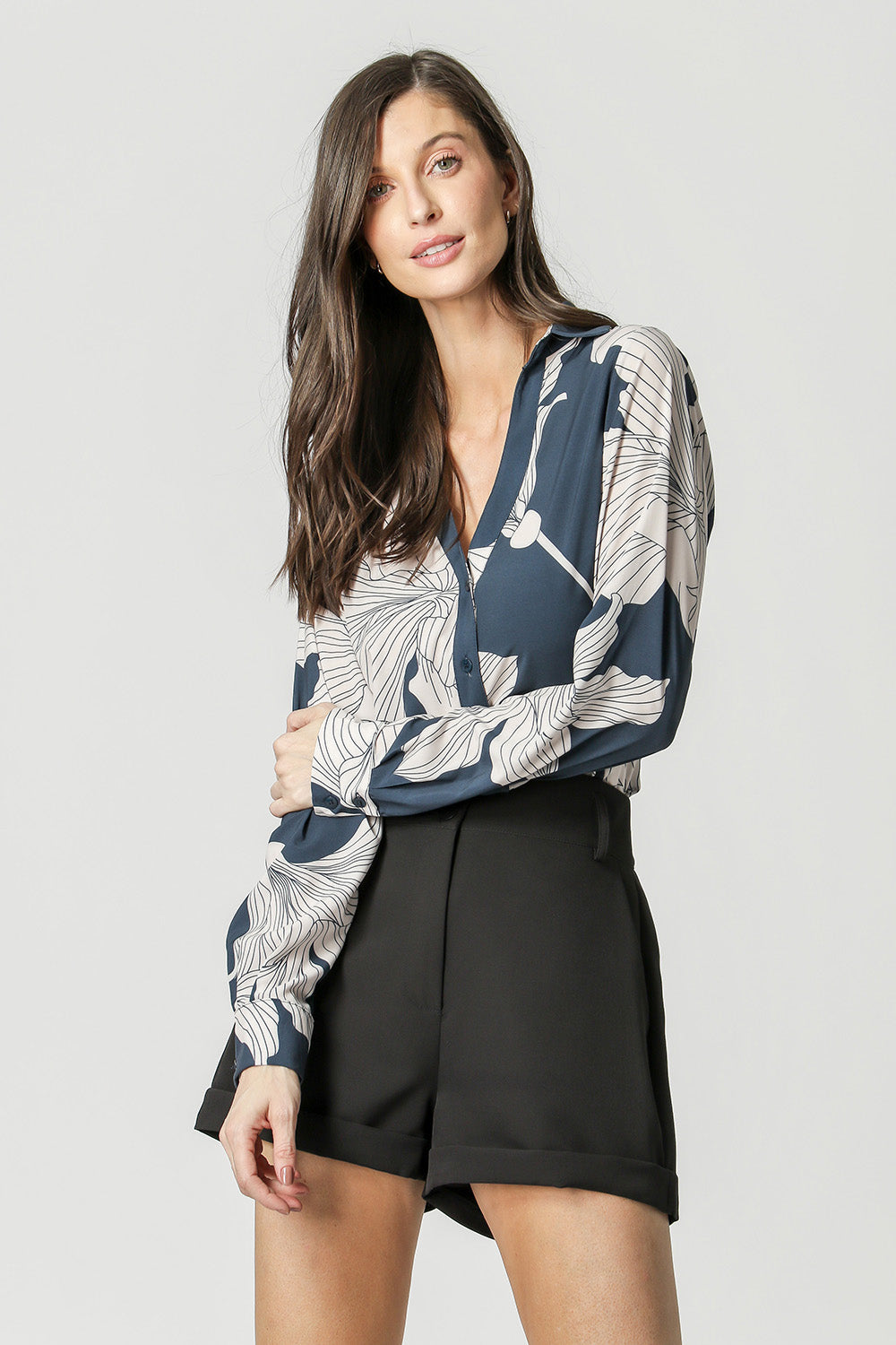 Camisa manga longa, decote V e fechamento frontal por botões. Feita em tecido leve e com estampas exclusivas. É o clássico que você precisa!