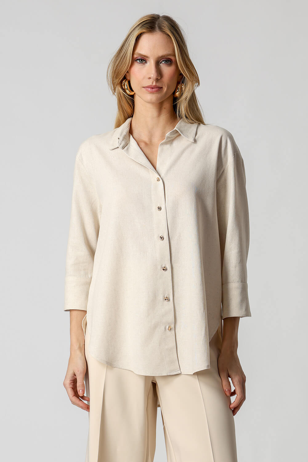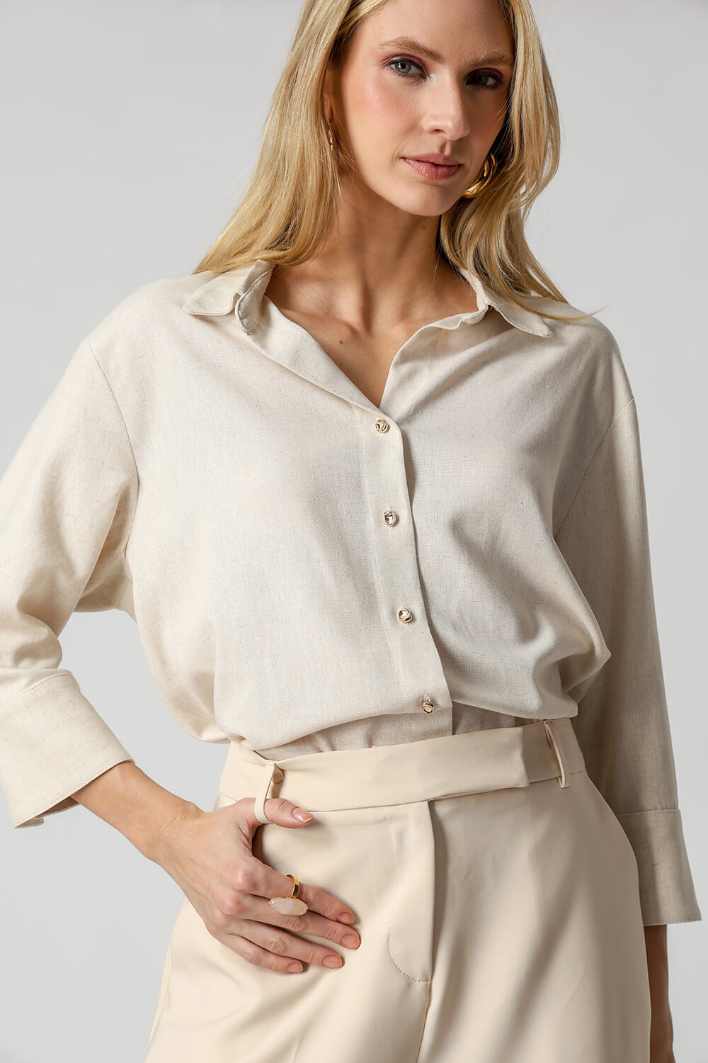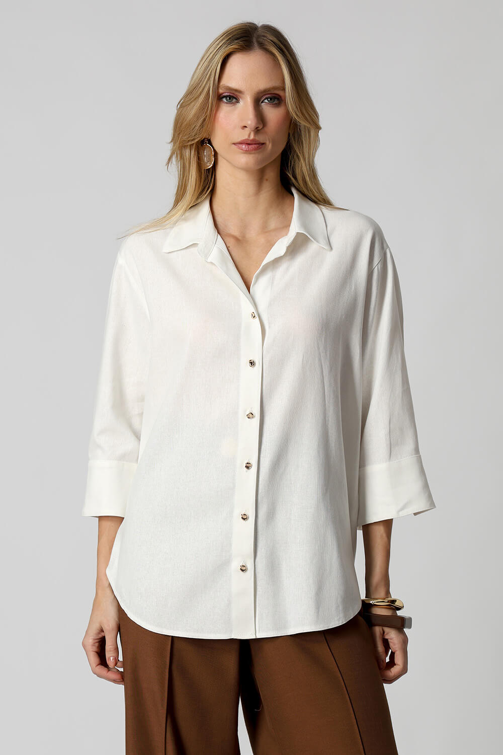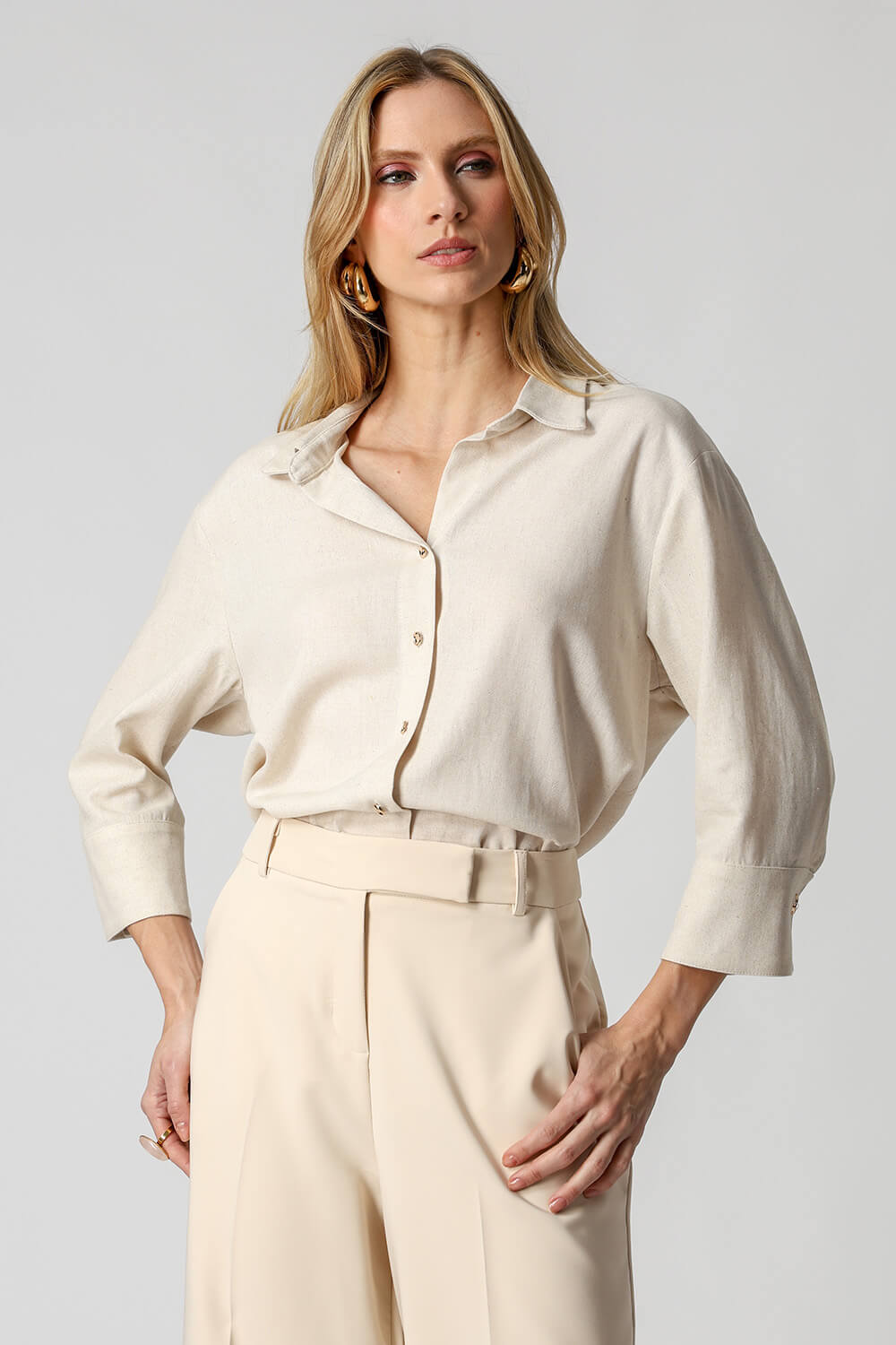 Camisa de manga 3/4 confeccionada em tecido de linho com viscose, apresentando barra abaulada e caimento leve. Ideal para um visual sofisticado e confortável.