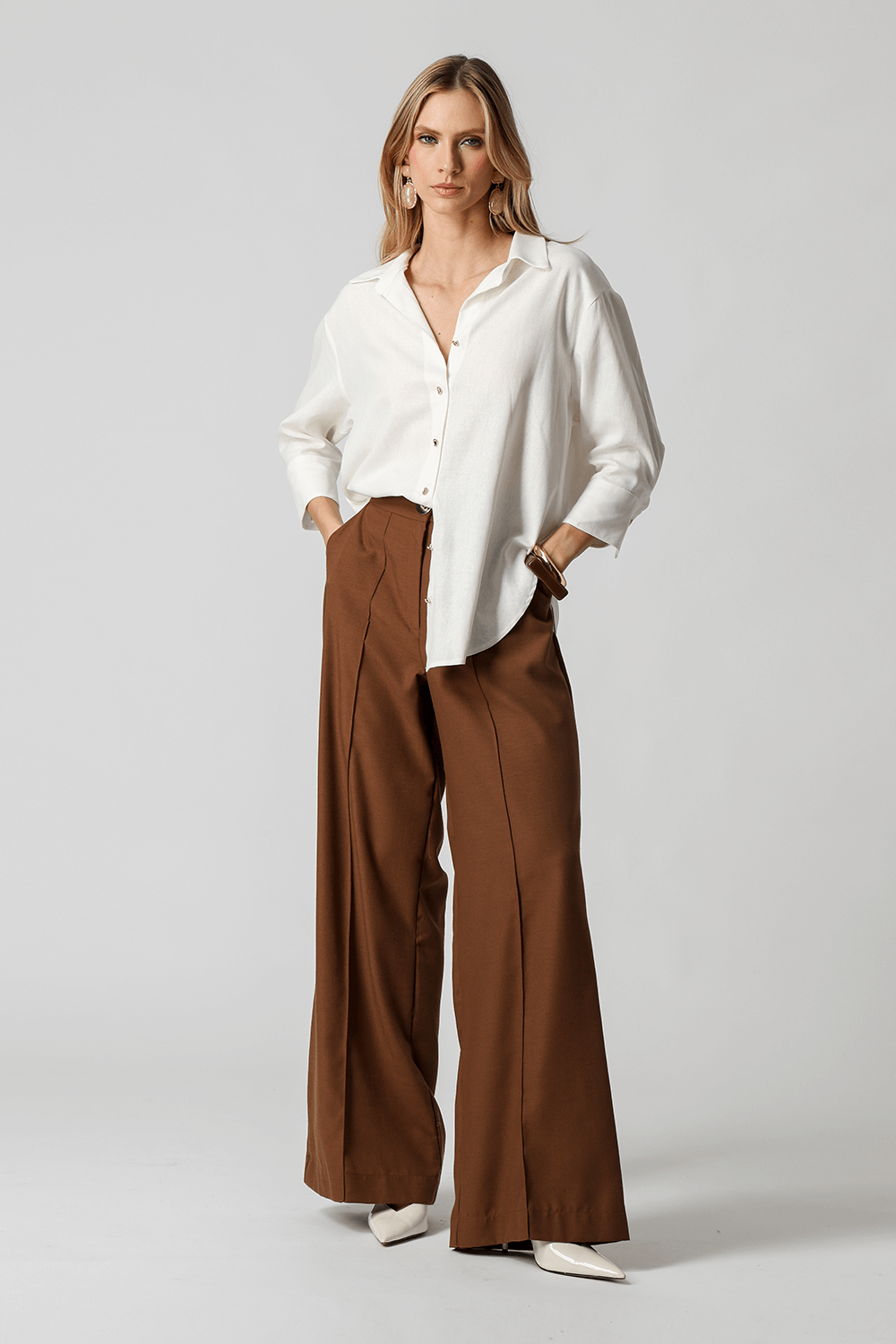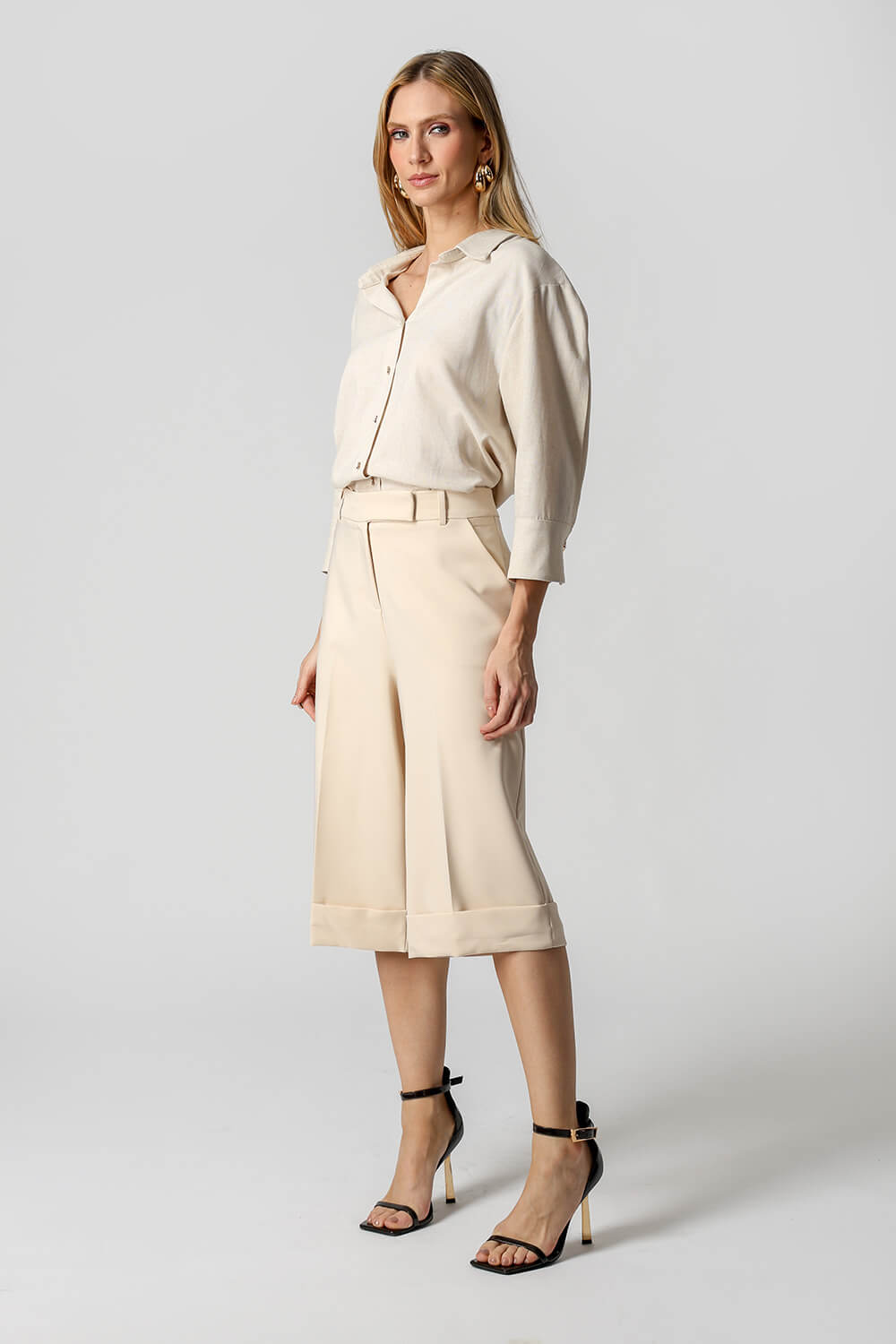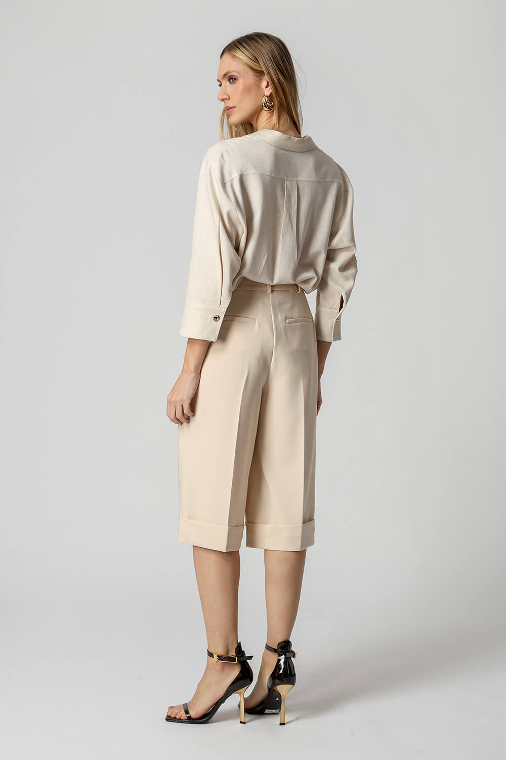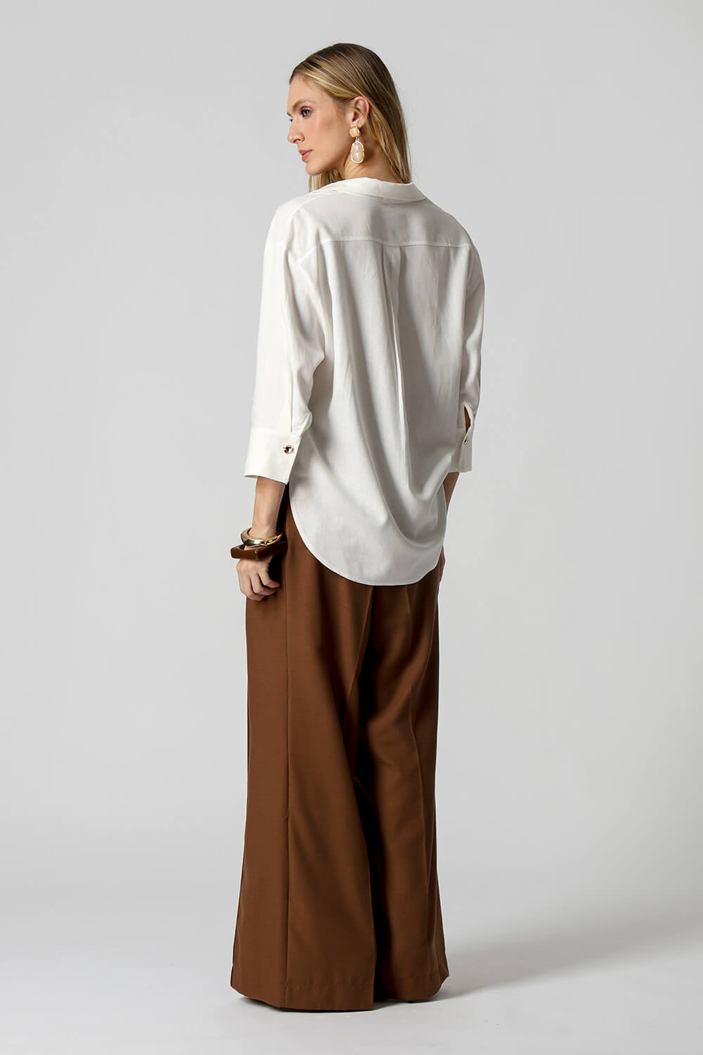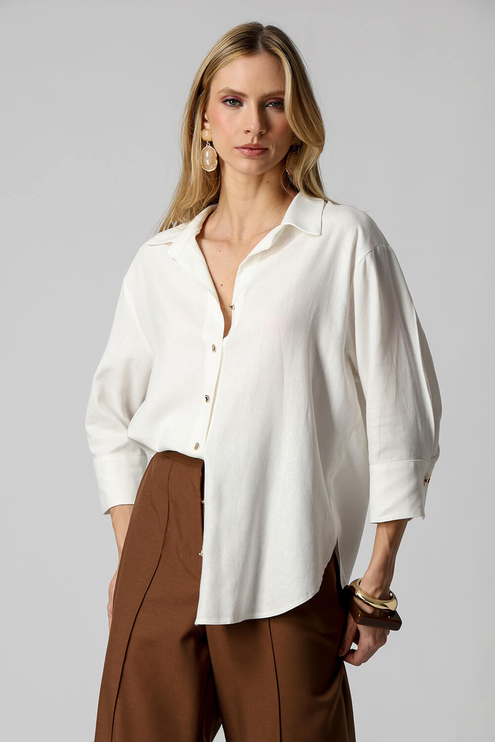 Camisa de manga 3/4 confeccionada em tecido de linho com viscose, apresentando barra abaulada e caimento leve. Ideal para um visual sofisticado e confortável.