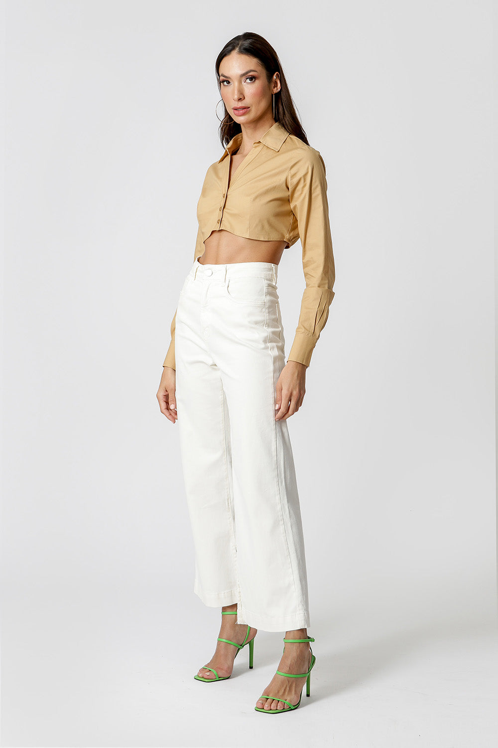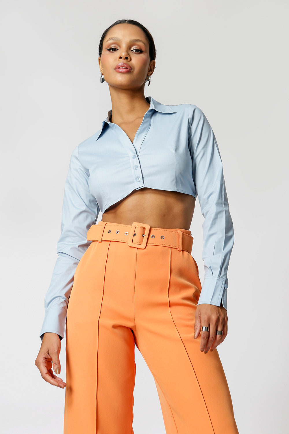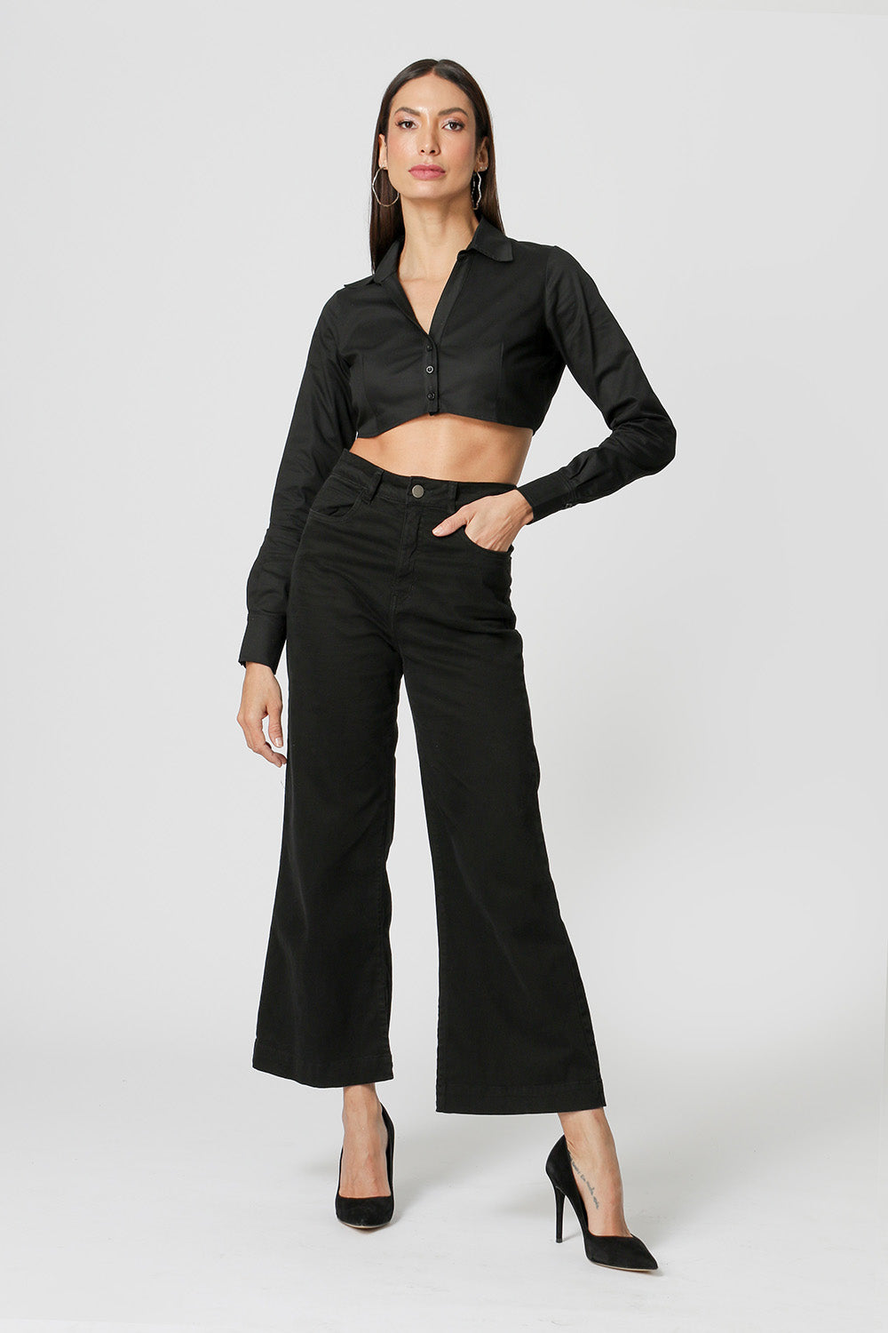 Camisa com shape cropped, manga longa e detalhe no punho. Peça feita em tricoline. Peça fashionista, que vai dar um UP no seu look.