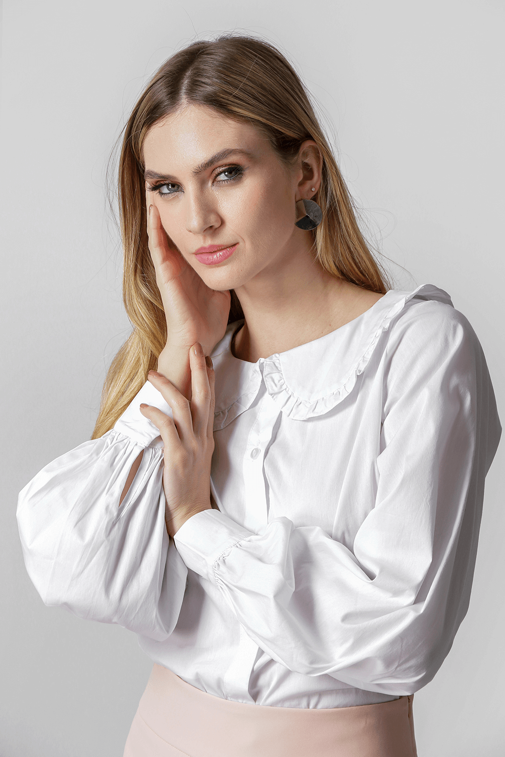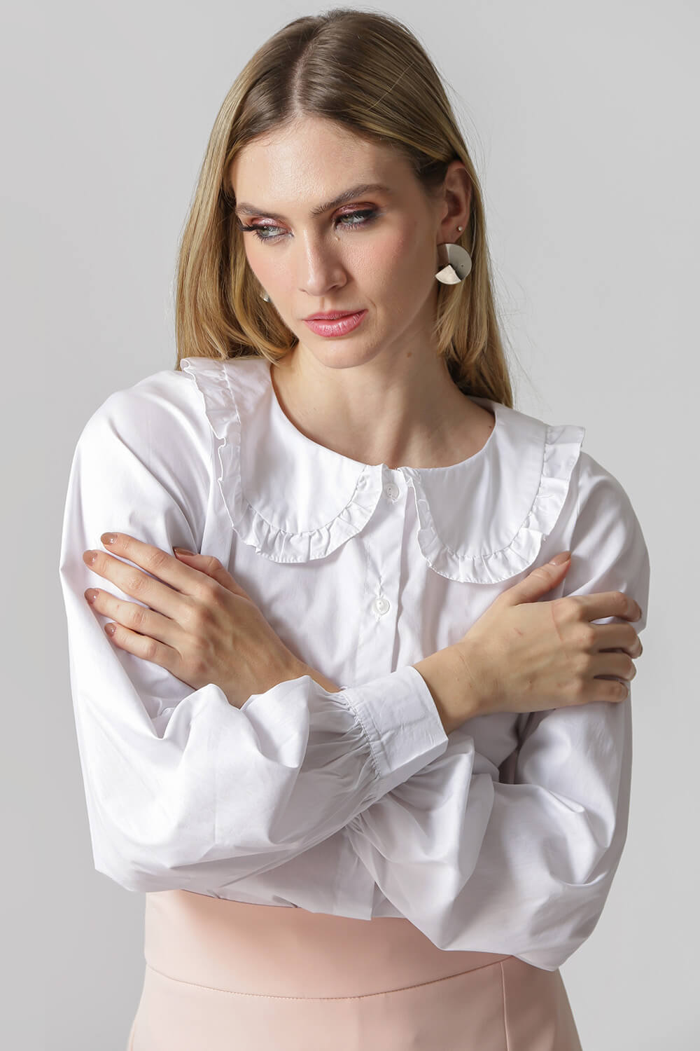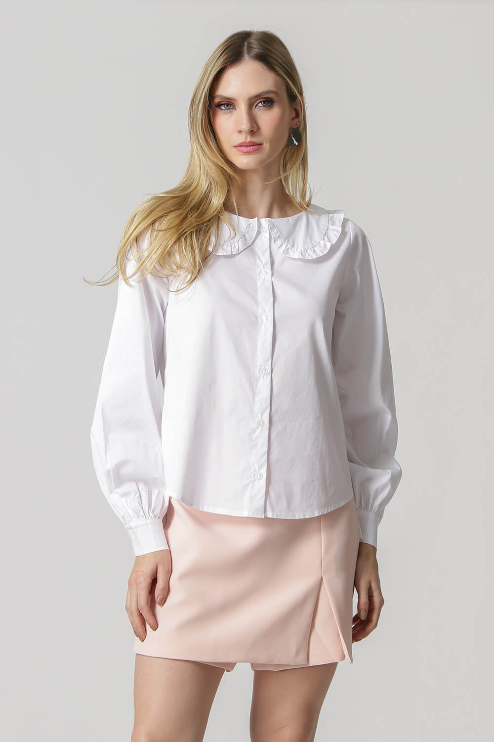 Camisa com shape mais solto, feita em tricoline. Possui manga bufante e detalhe de babado na gola. Peça feminina, ideal para ocasiões especiais.