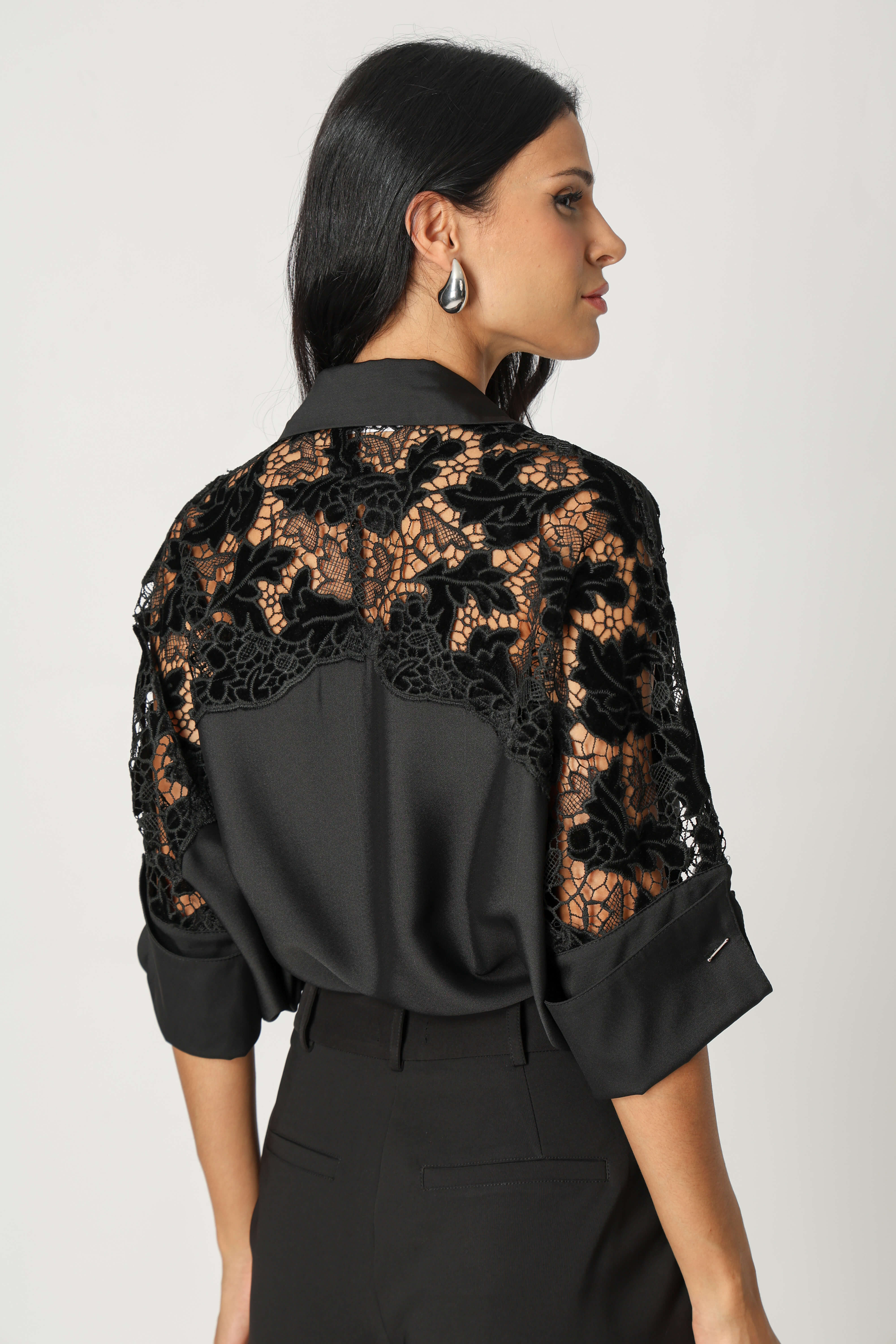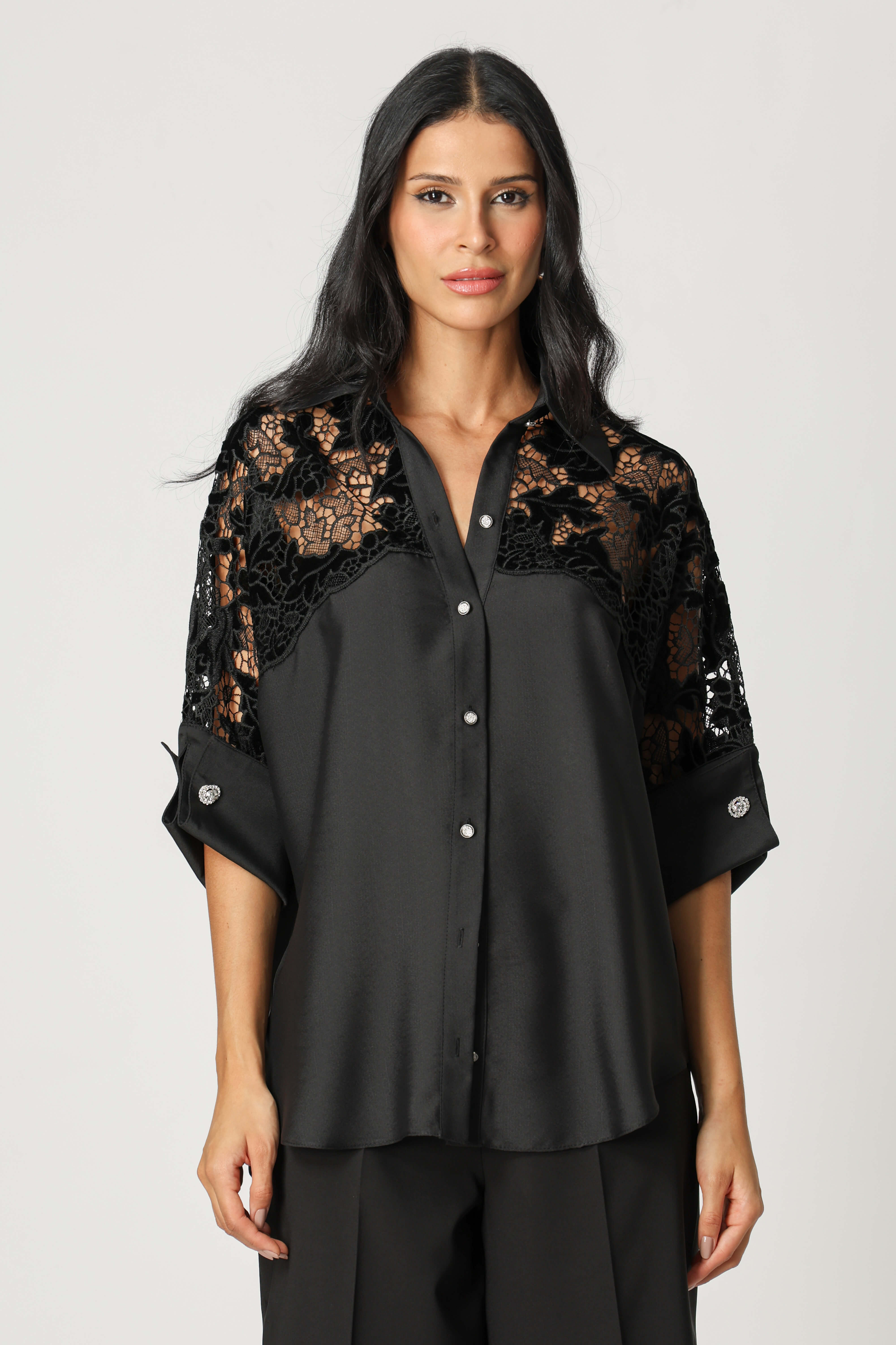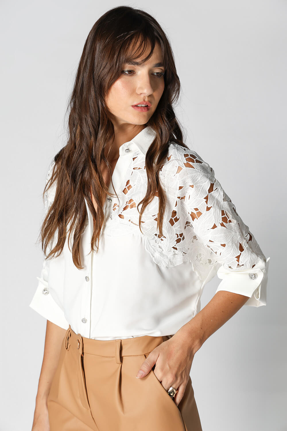 Confortável e elegante, esta camisa traz um toque de sofisticação com seu detalhe em guipir e punhos com abotoadura, ideal para looks sofisticados.