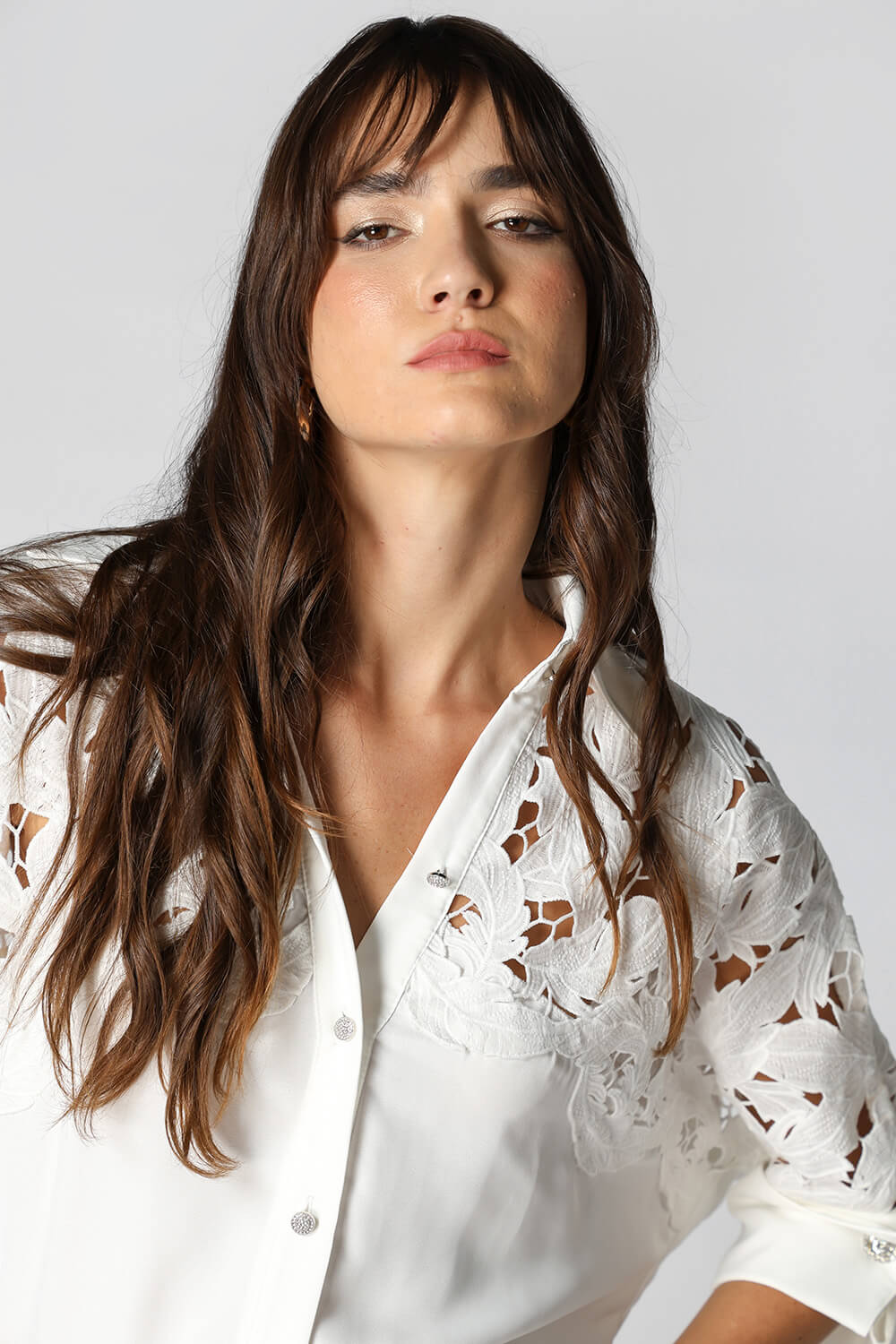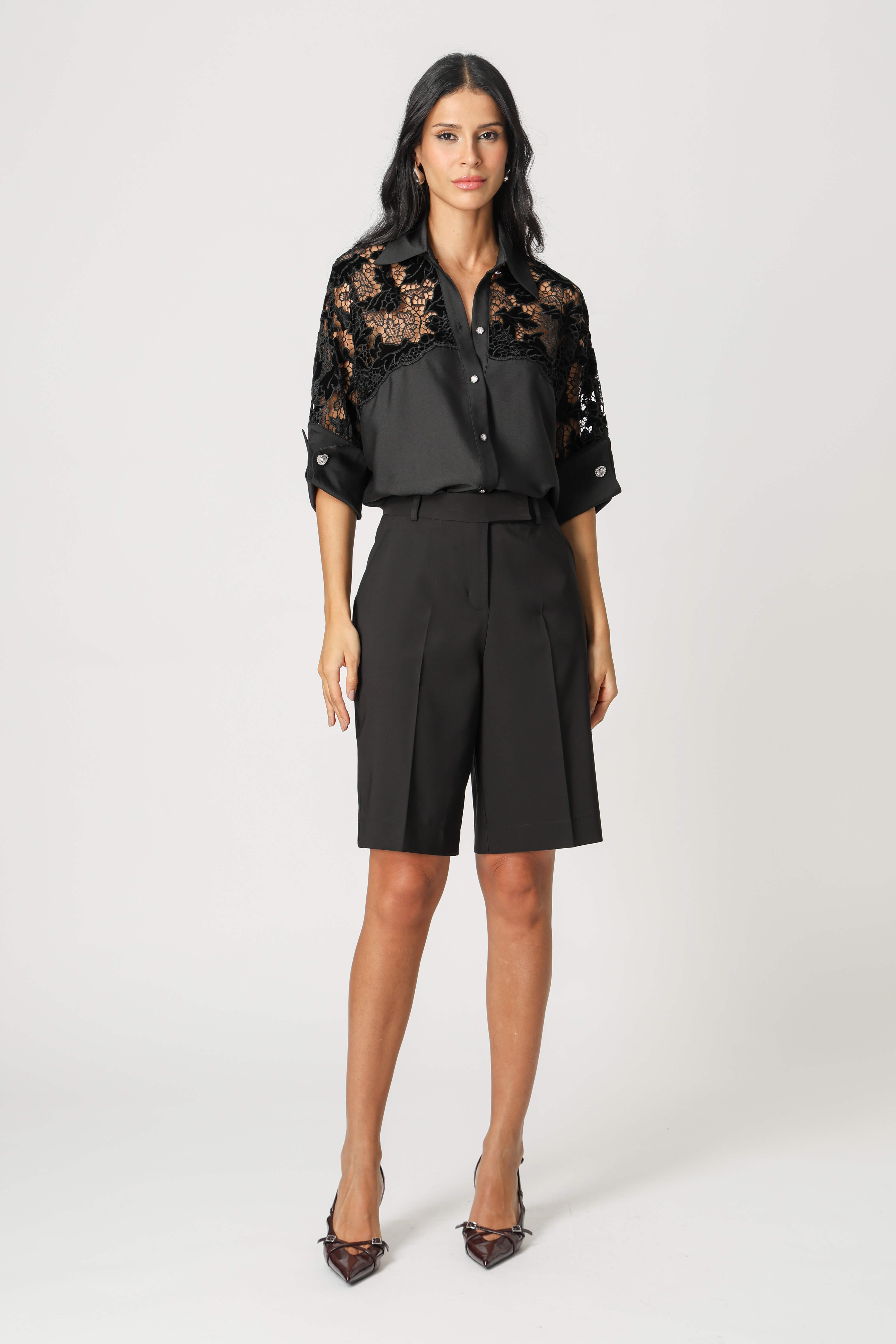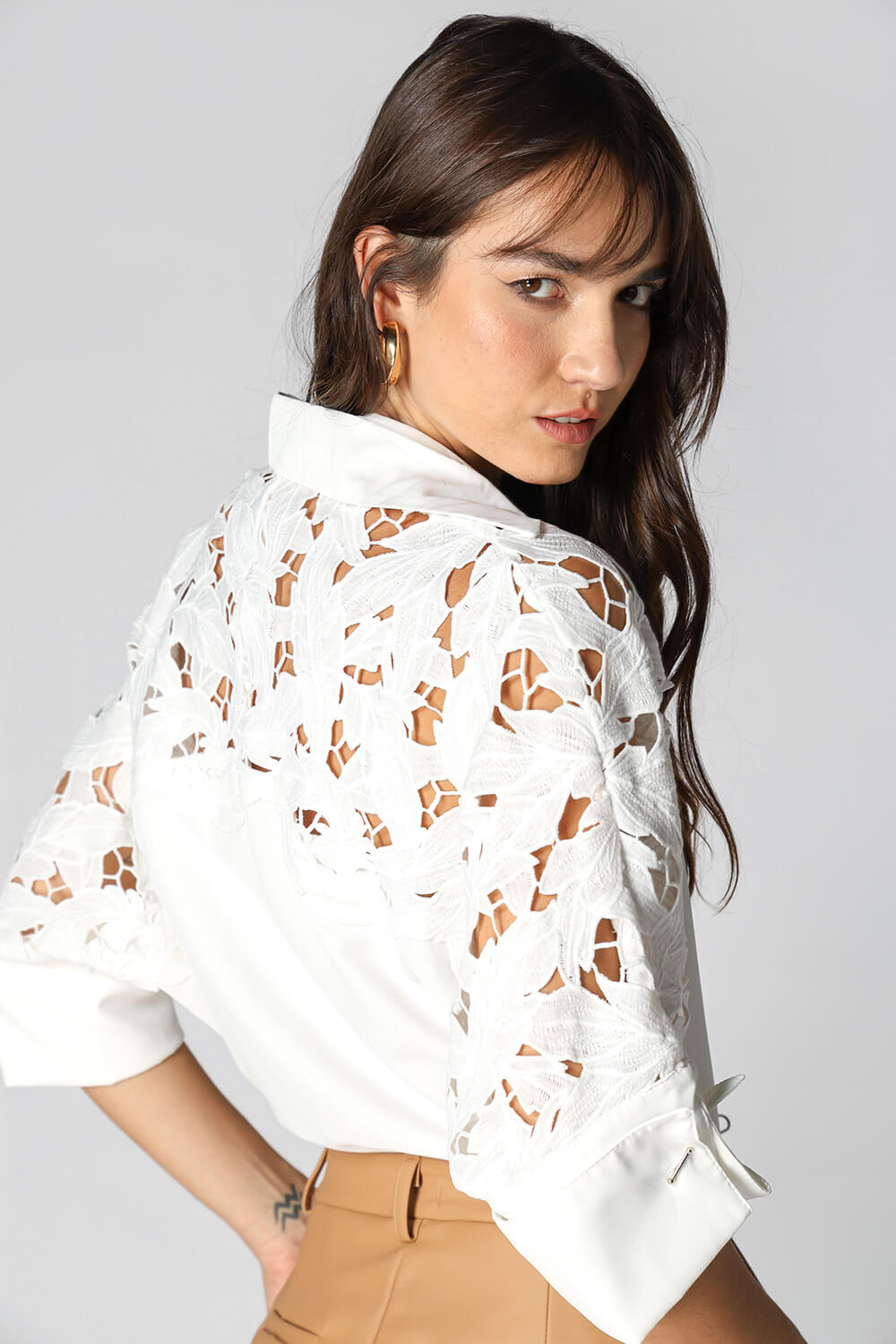 Confortável e elegante, esta camisa traz um toque de sofisticação com seu detalhe em guipir e punhos com abotoadura, ideal para looks sofisticados.