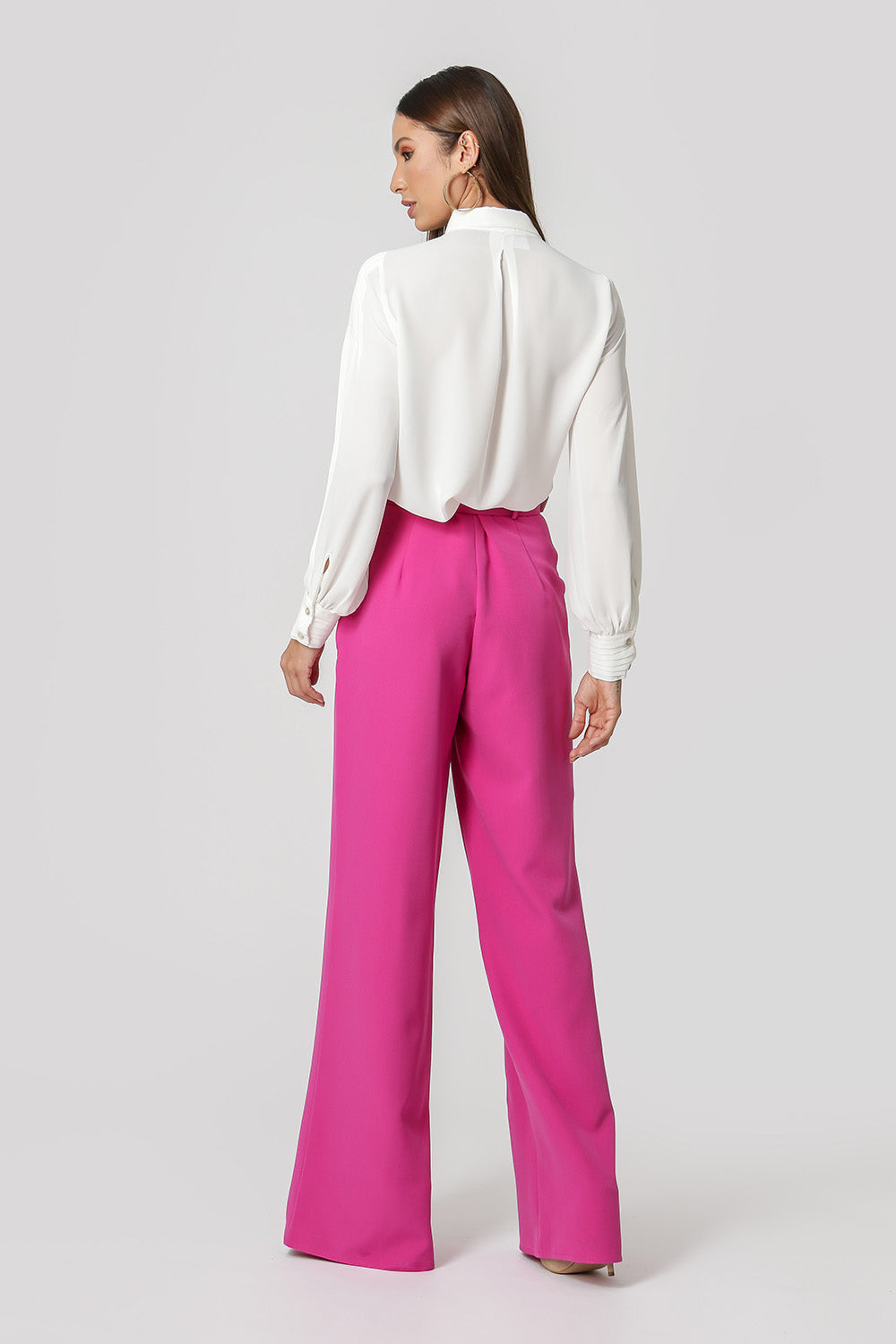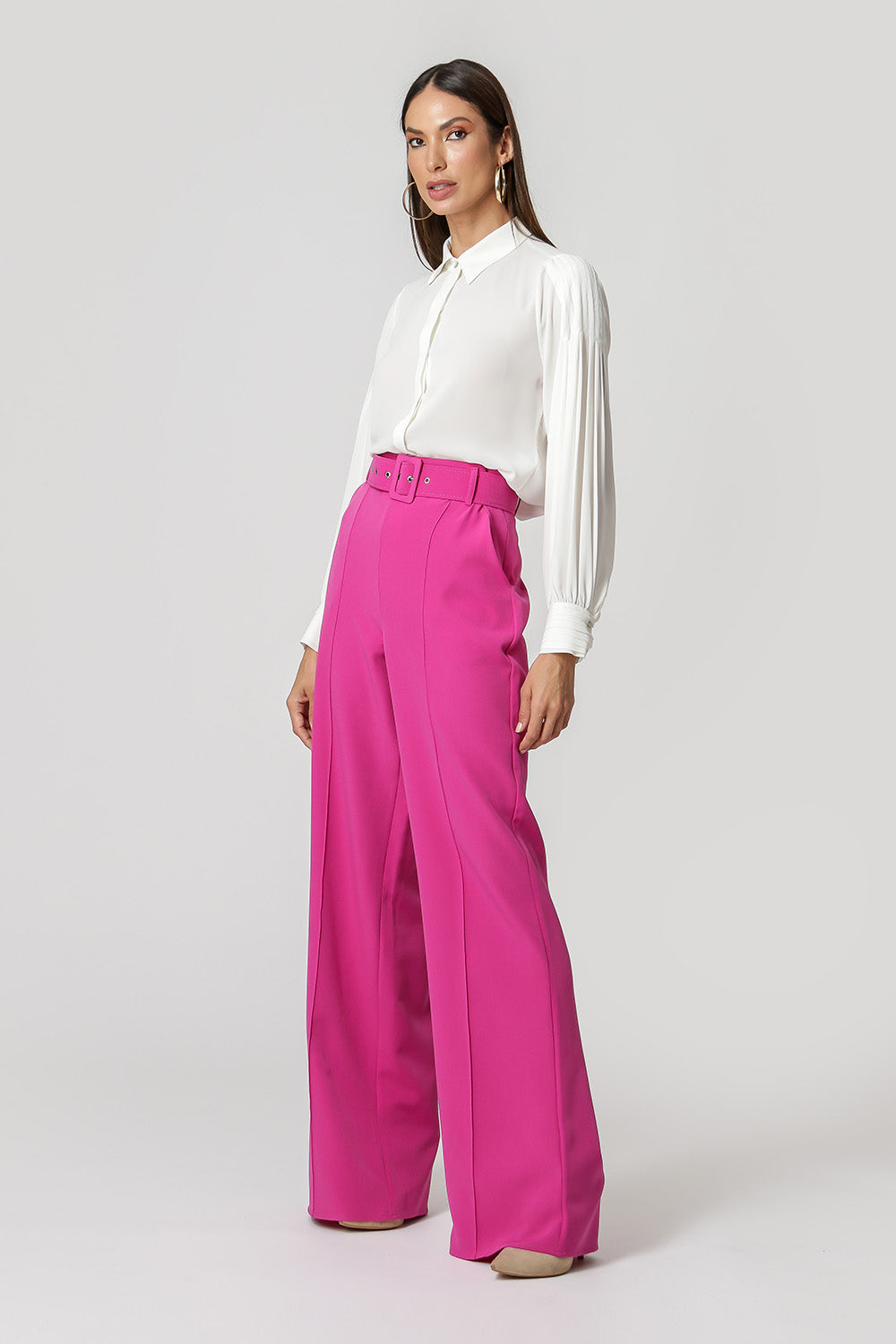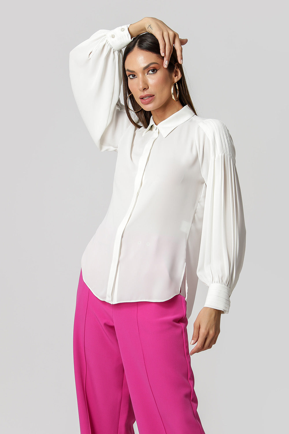 Camisa com shape mais solto, feita em crepe fluído. Possuí detalhes de pregas nas mangas e punhos. Peça clássica e feminina, ideal para looks mais formais.