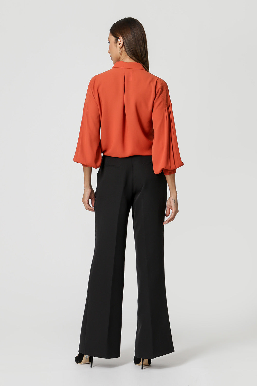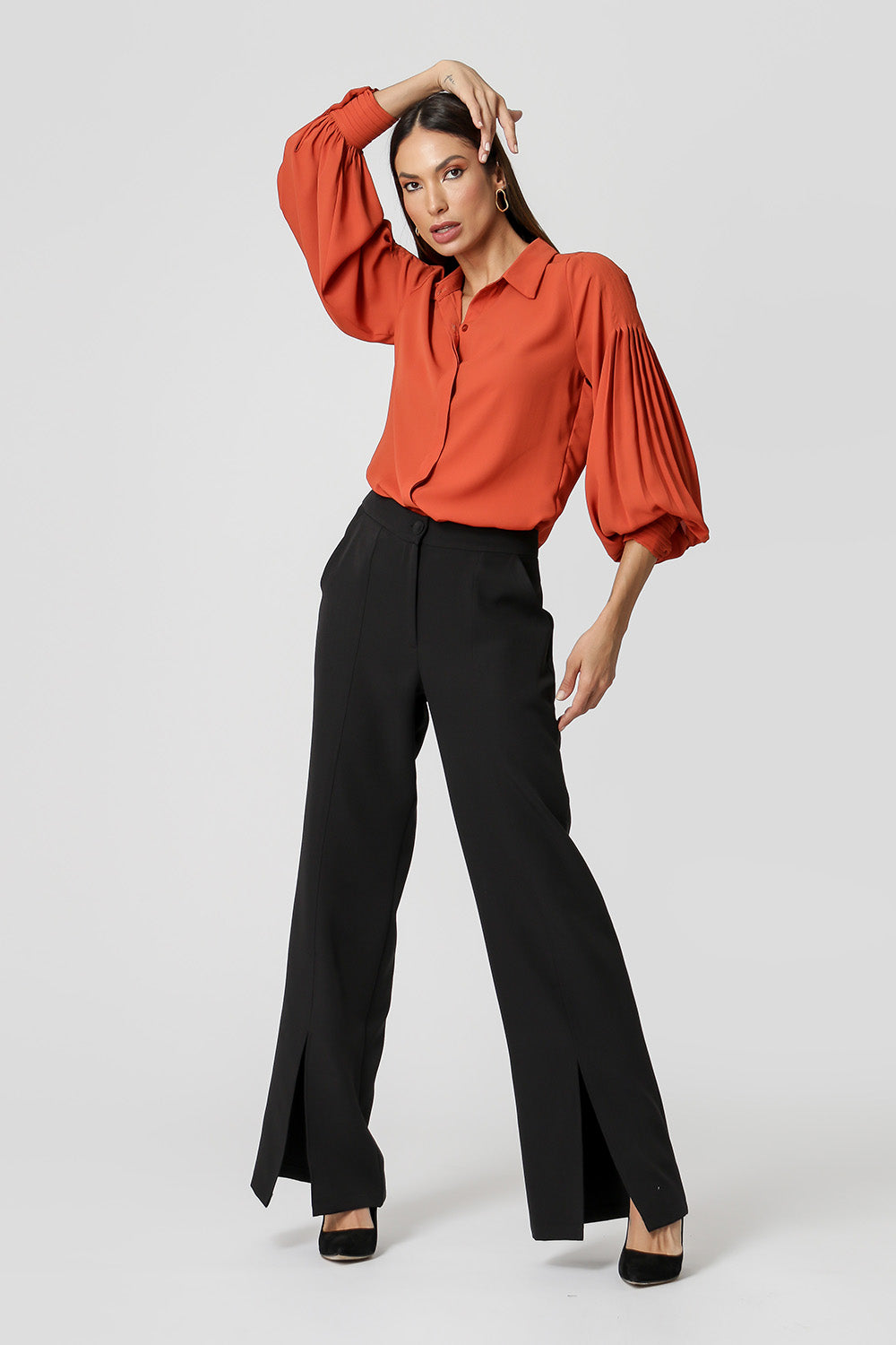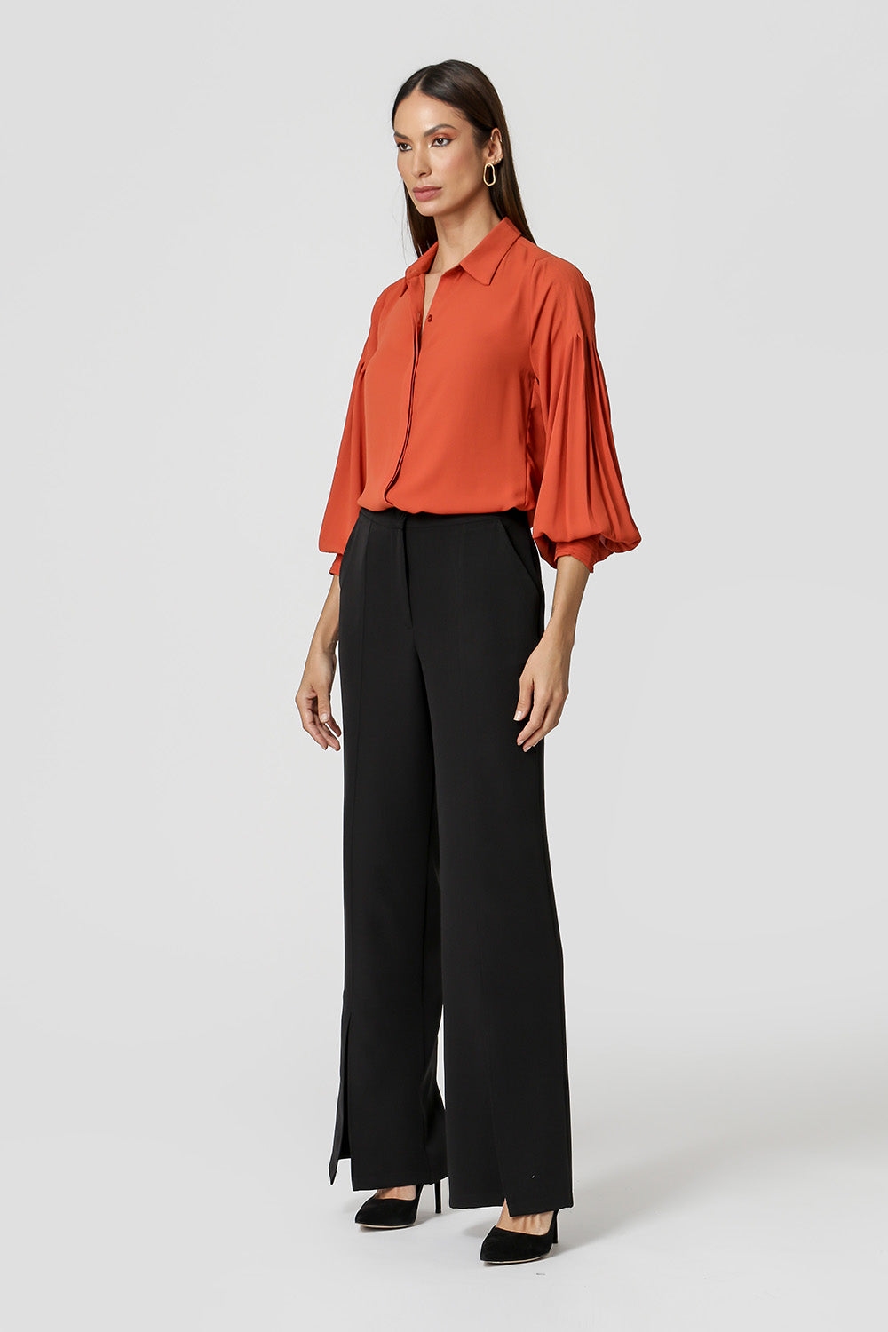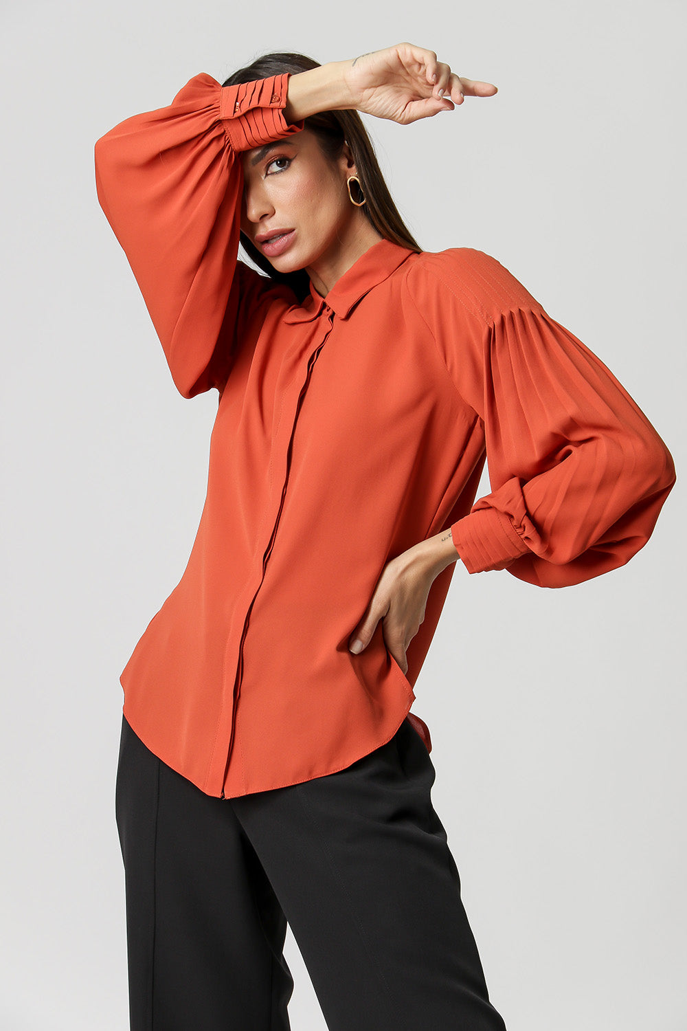 Camisa com shape mais solto, feita em crepe fluído. Possuí detalhes de pregas nas mangas e punhos. Peça clássica e feminina, ideal para looks mais formais.