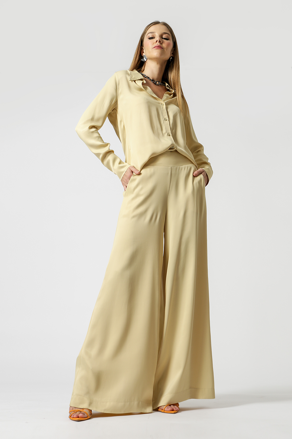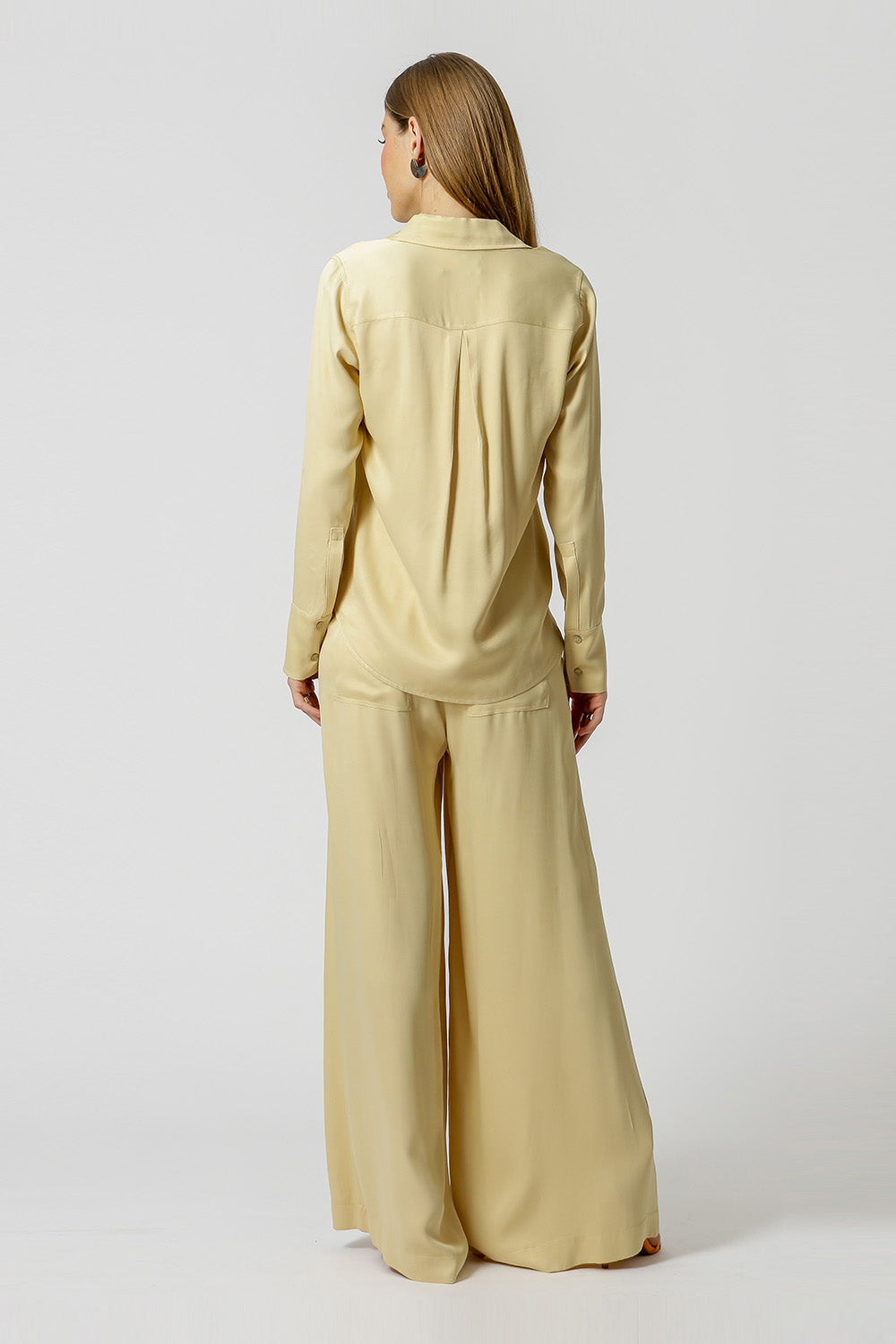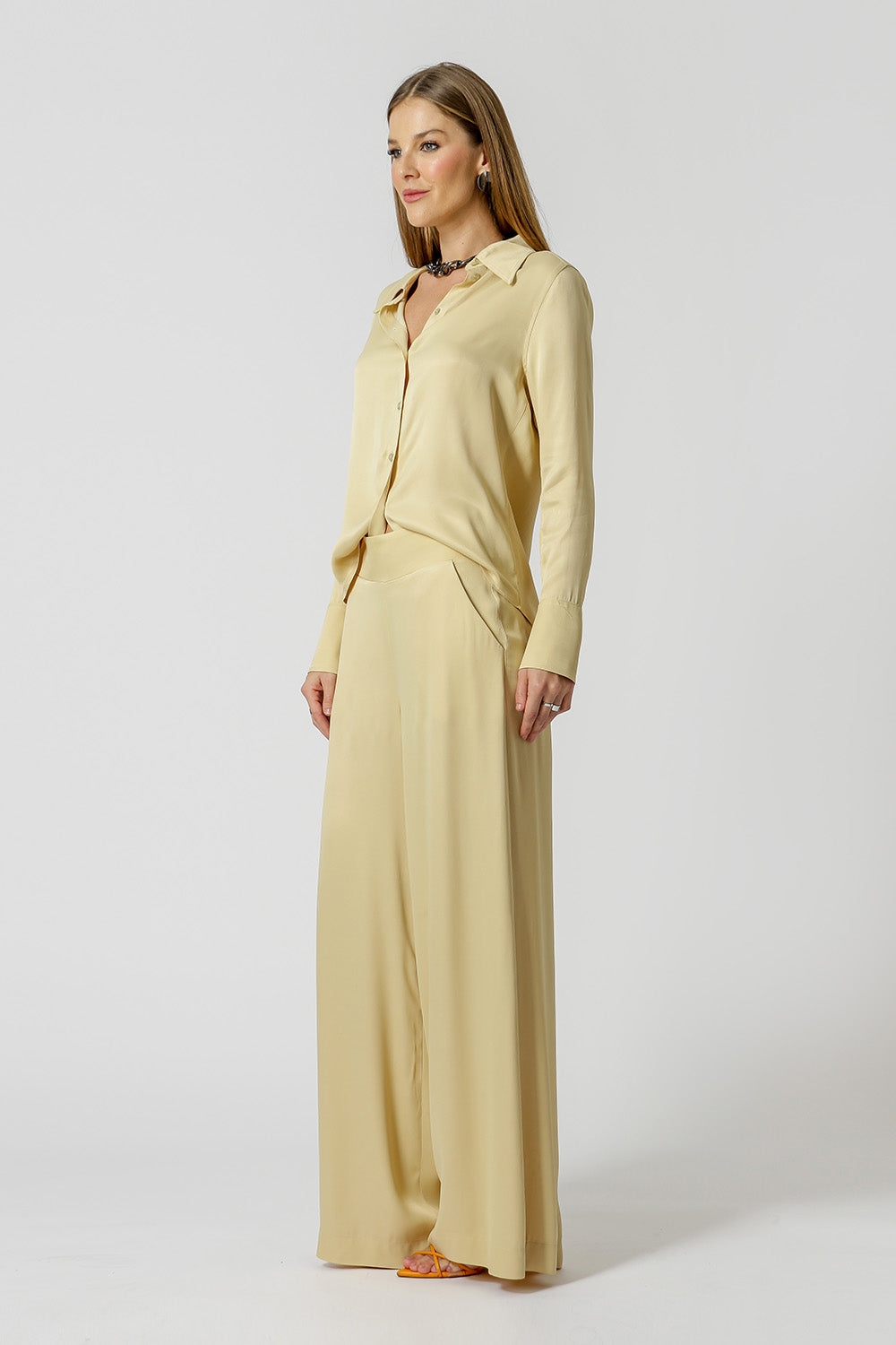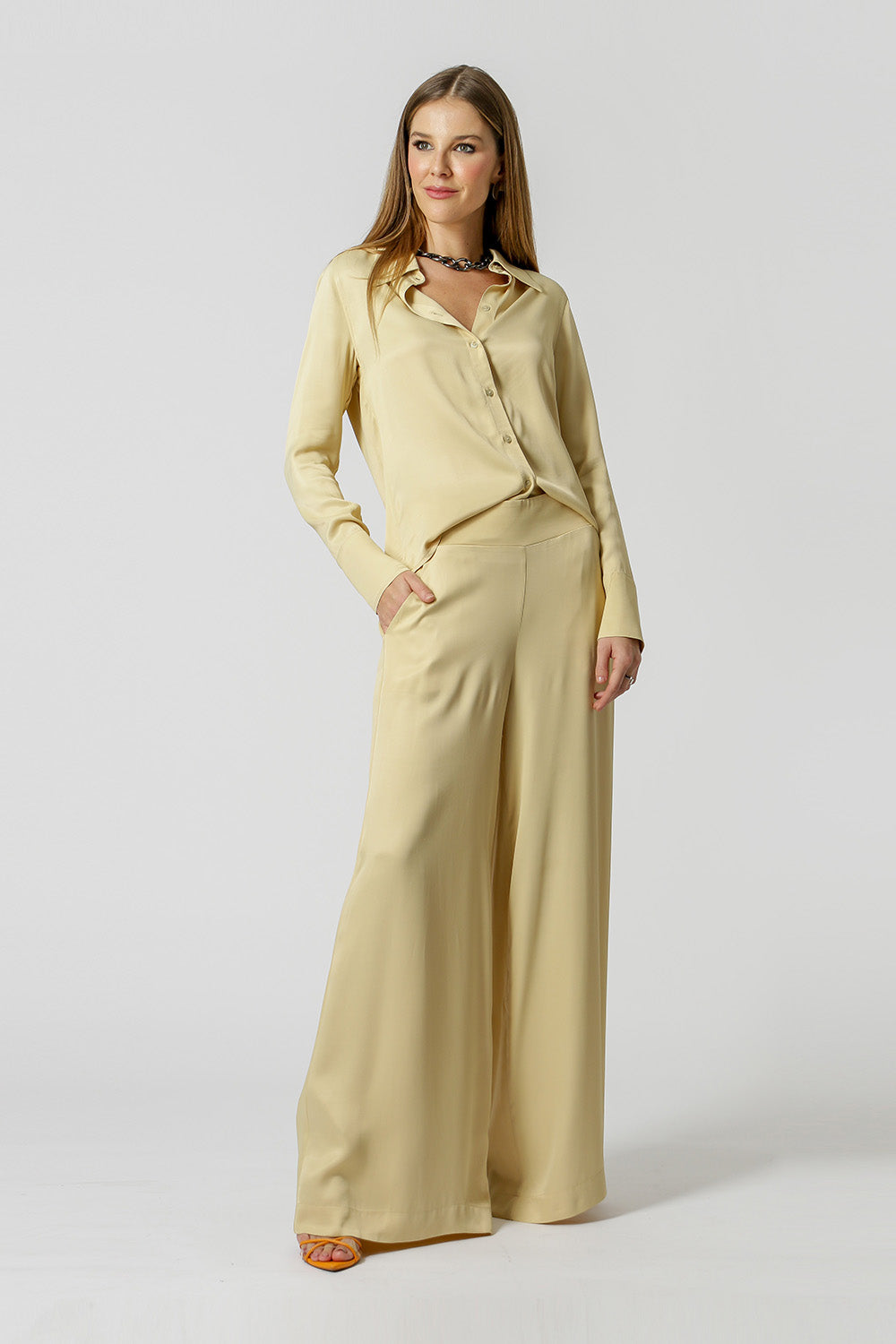 Camisa manga longa confeccionada em cetim leve com toque macio, detalhe de pespontos duplos e fechamento frontal por botões. Um dos itens must have da estação!