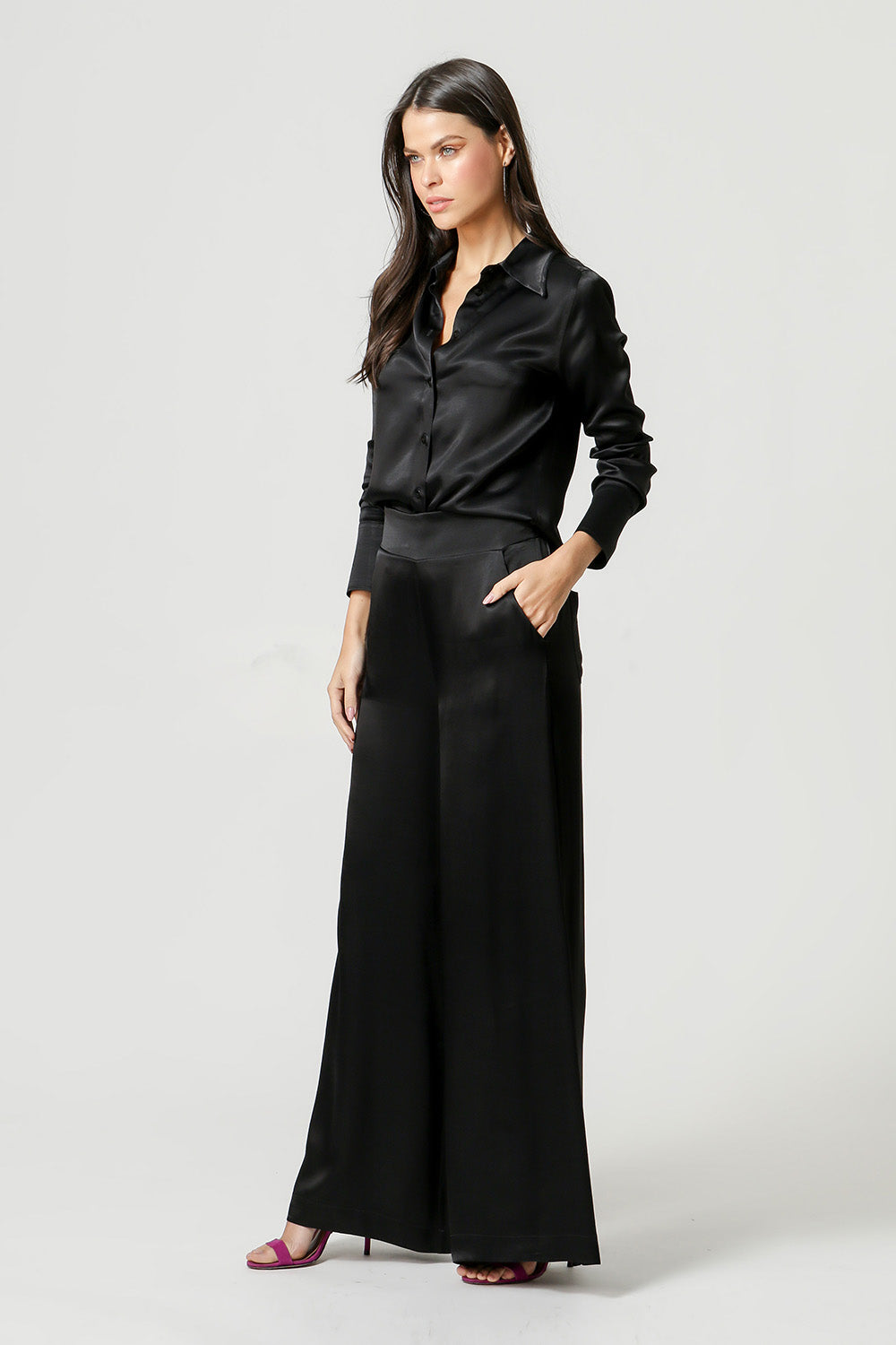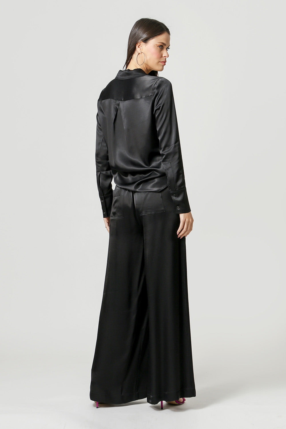 Camisa manga longa confeccionada em cetim leve com toque macio, detalhe de pespontos duplos e fechamento frontal por botões. Um dos itens must have da estação!