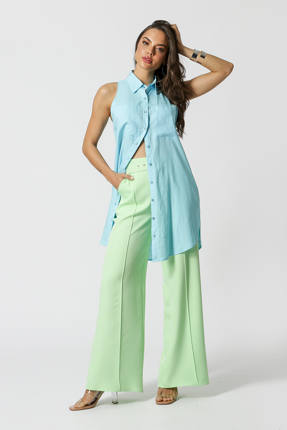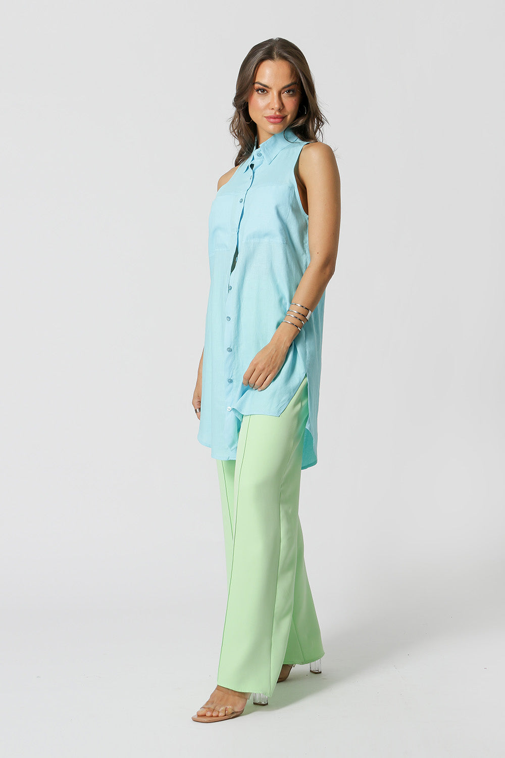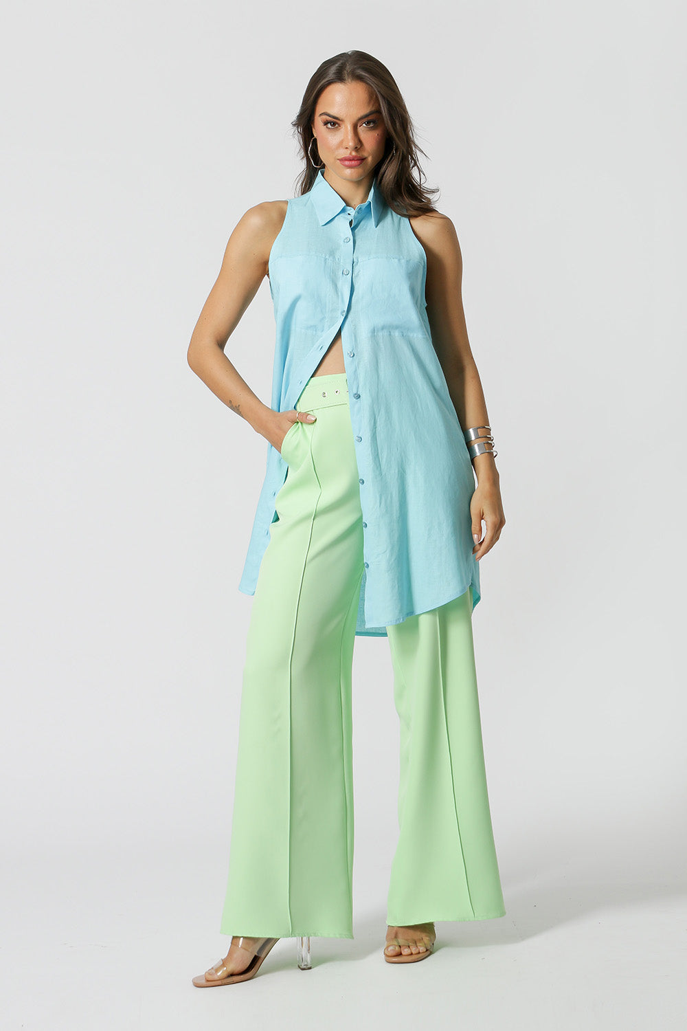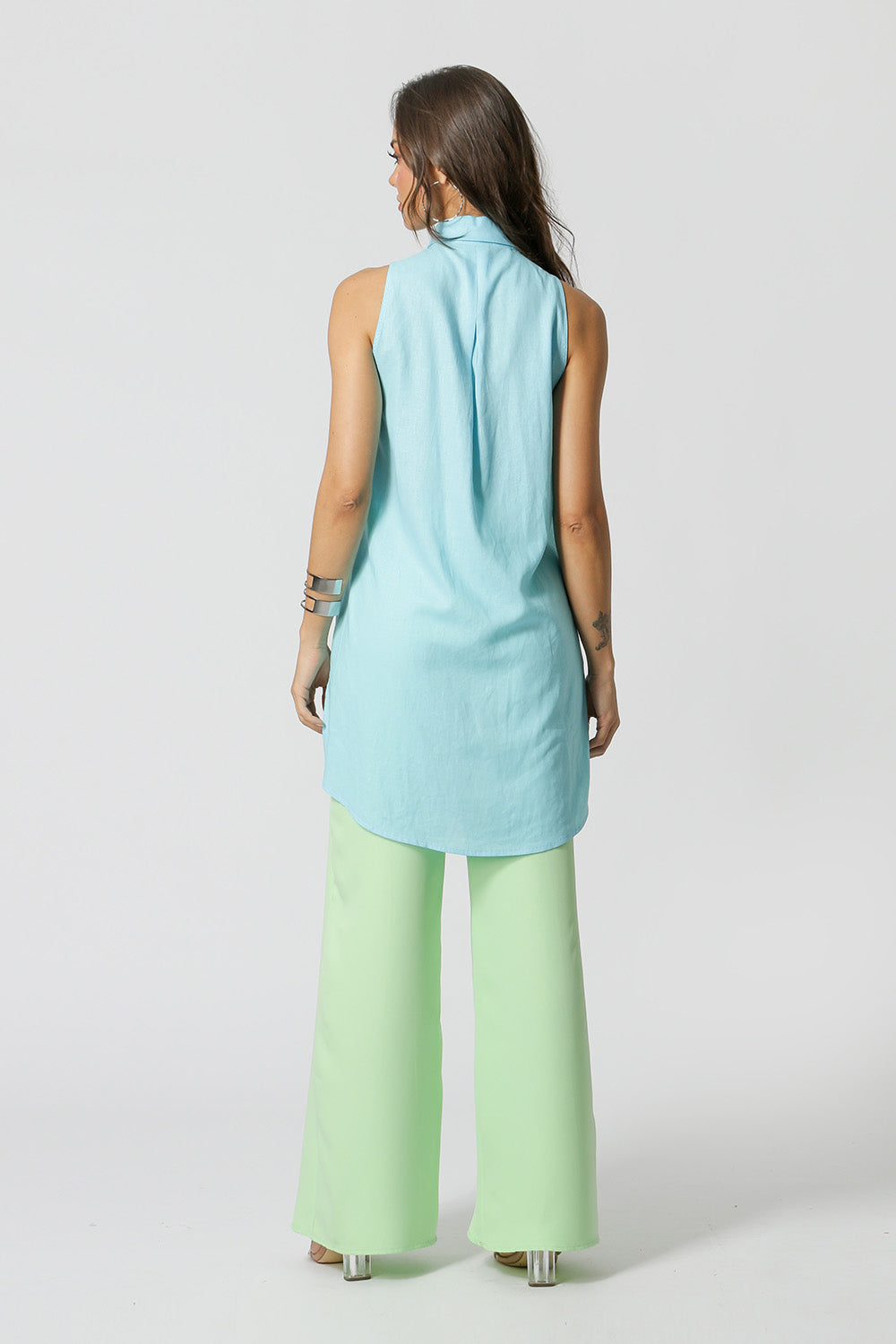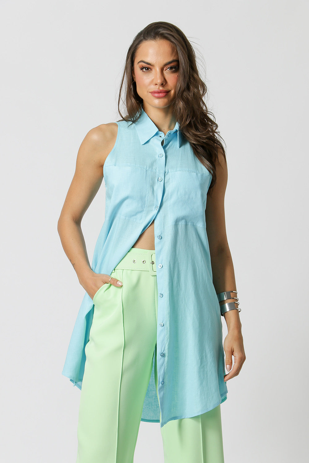 Camisa regata comprimento long, shape mais amplo, bolsos frente embutidos e abotoamento frontal. Feita em linho com viscose. Peça trendy que vai dar um up no seu look de verão.