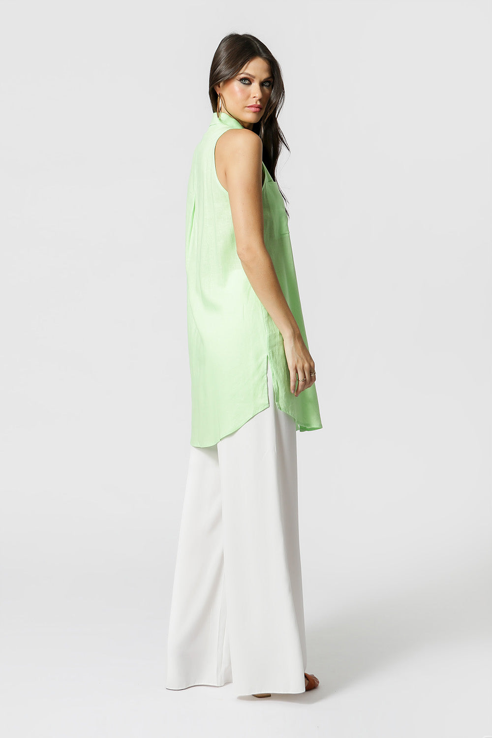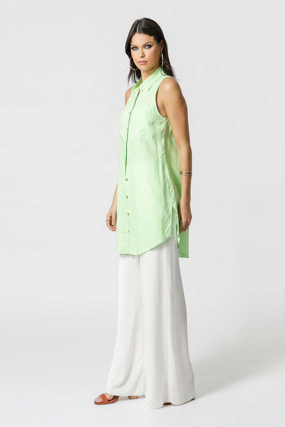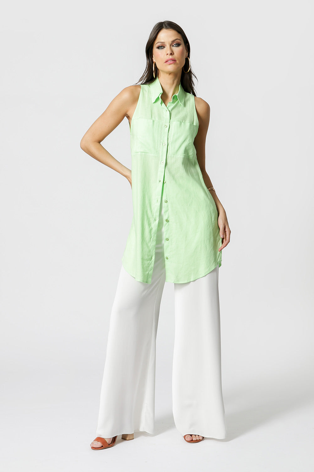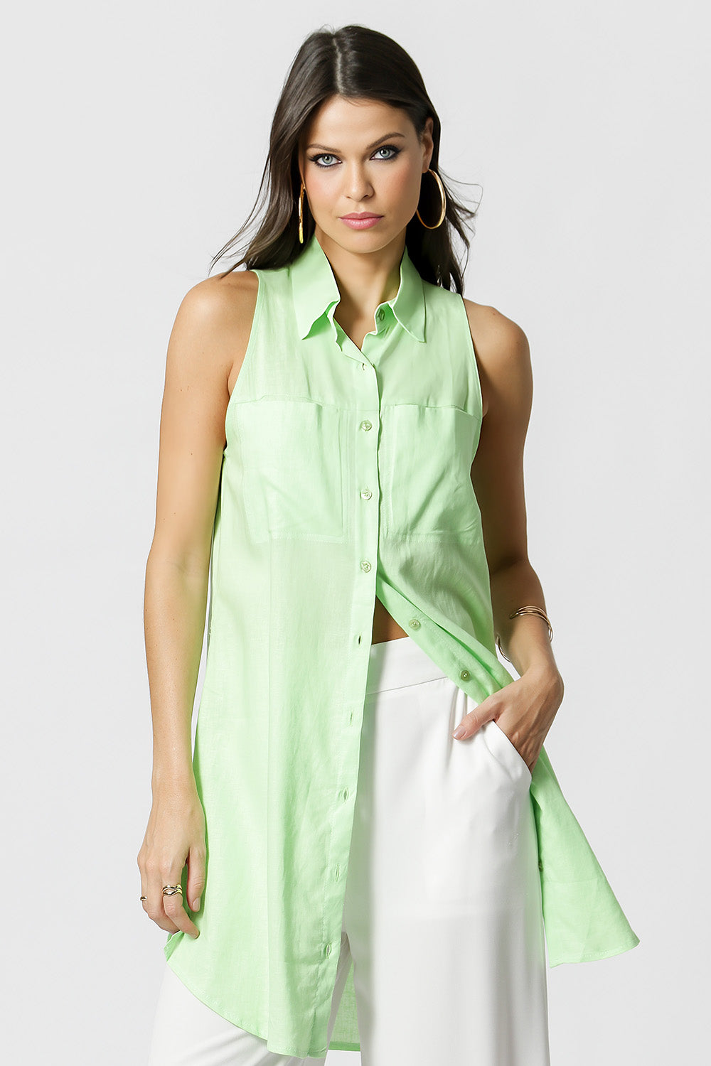 Camisa regata comprimento long, shape mais amplo, bolsos frente embutidos e abotoamento frontal. Feita em linho com viscose. Peça trendy que vai dar um up no seu look de verão.