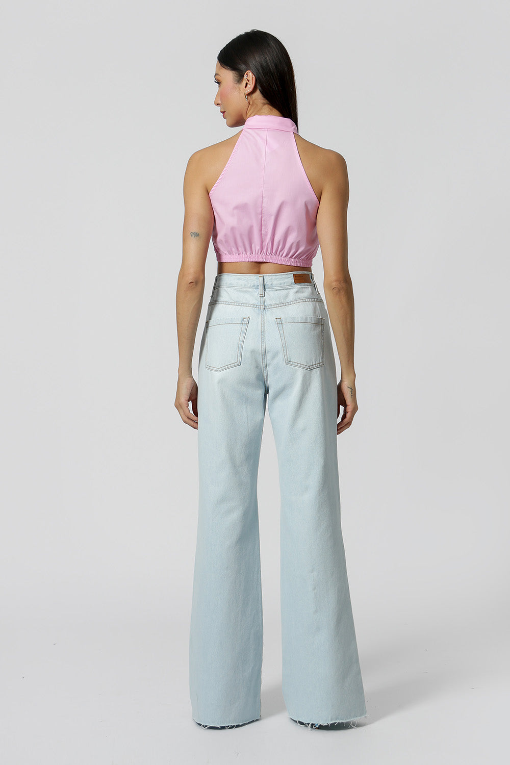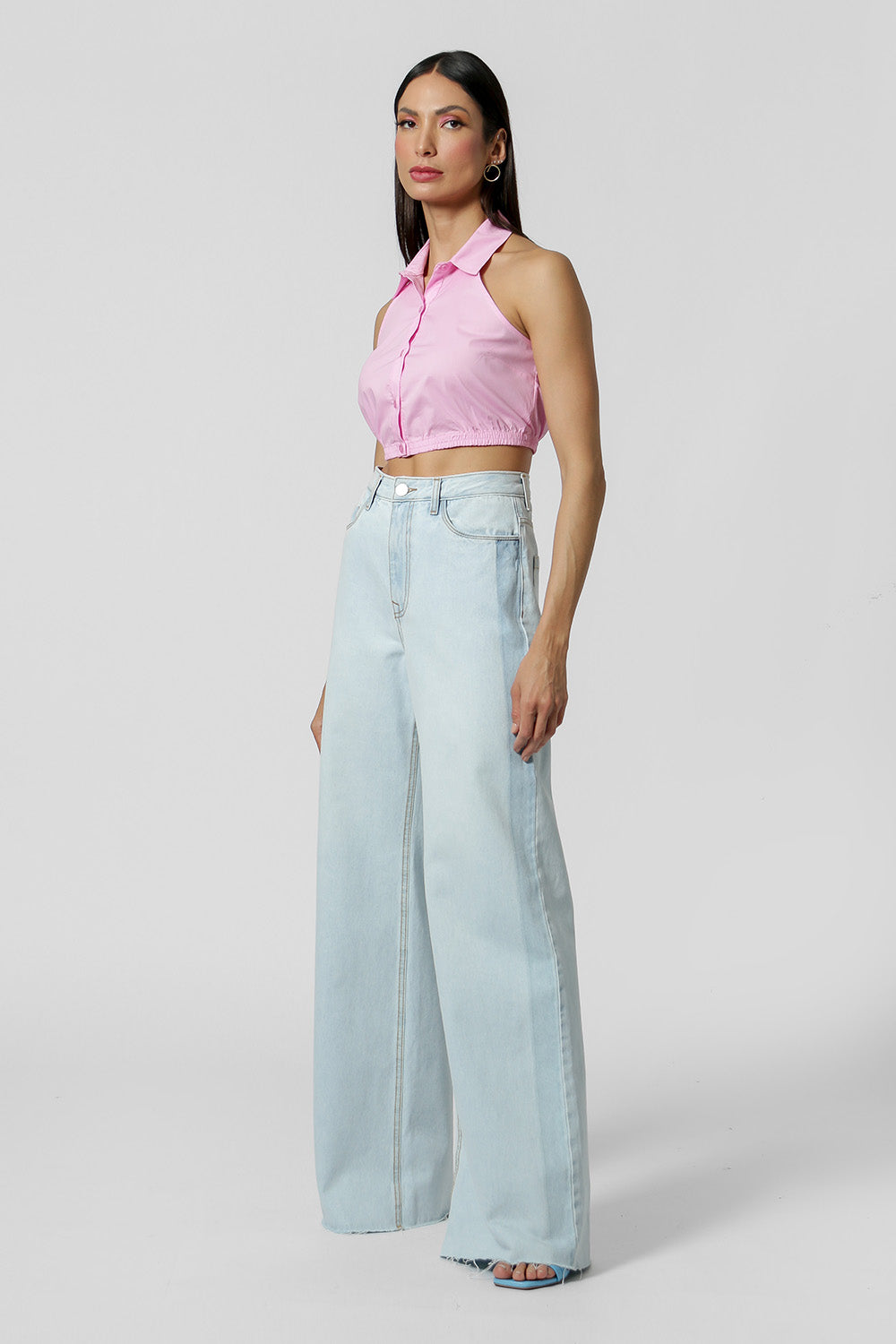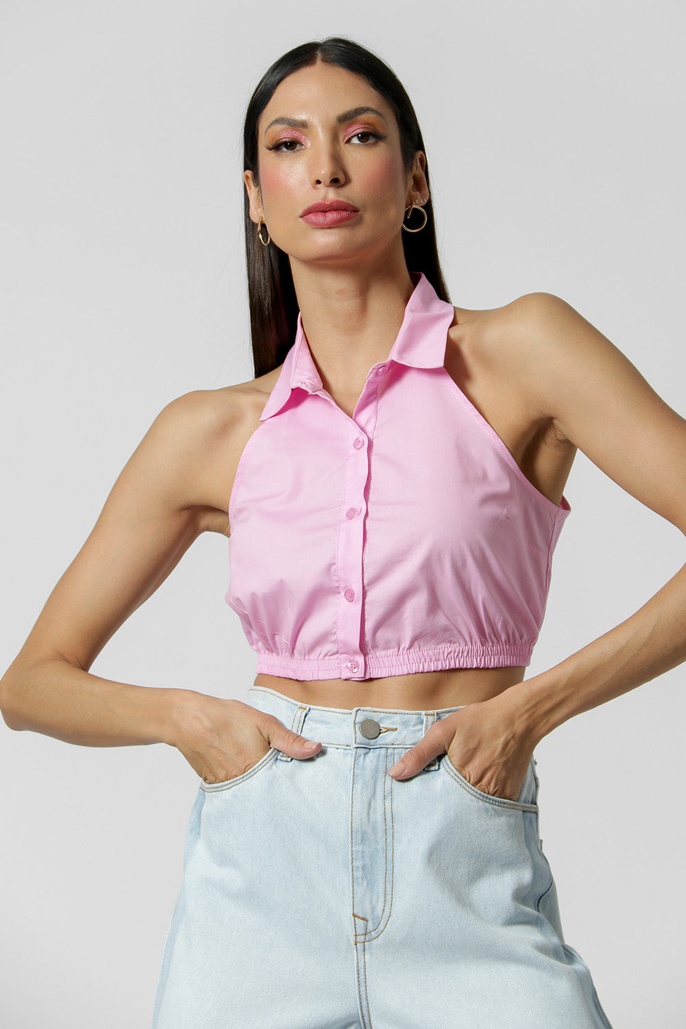 Camisa regata com comprimento cropped e detalhe de elástico na barra. Abotoamento frontal. Peça feita em tricoline. Peça fashionista, que vai dar um UP no seu look!