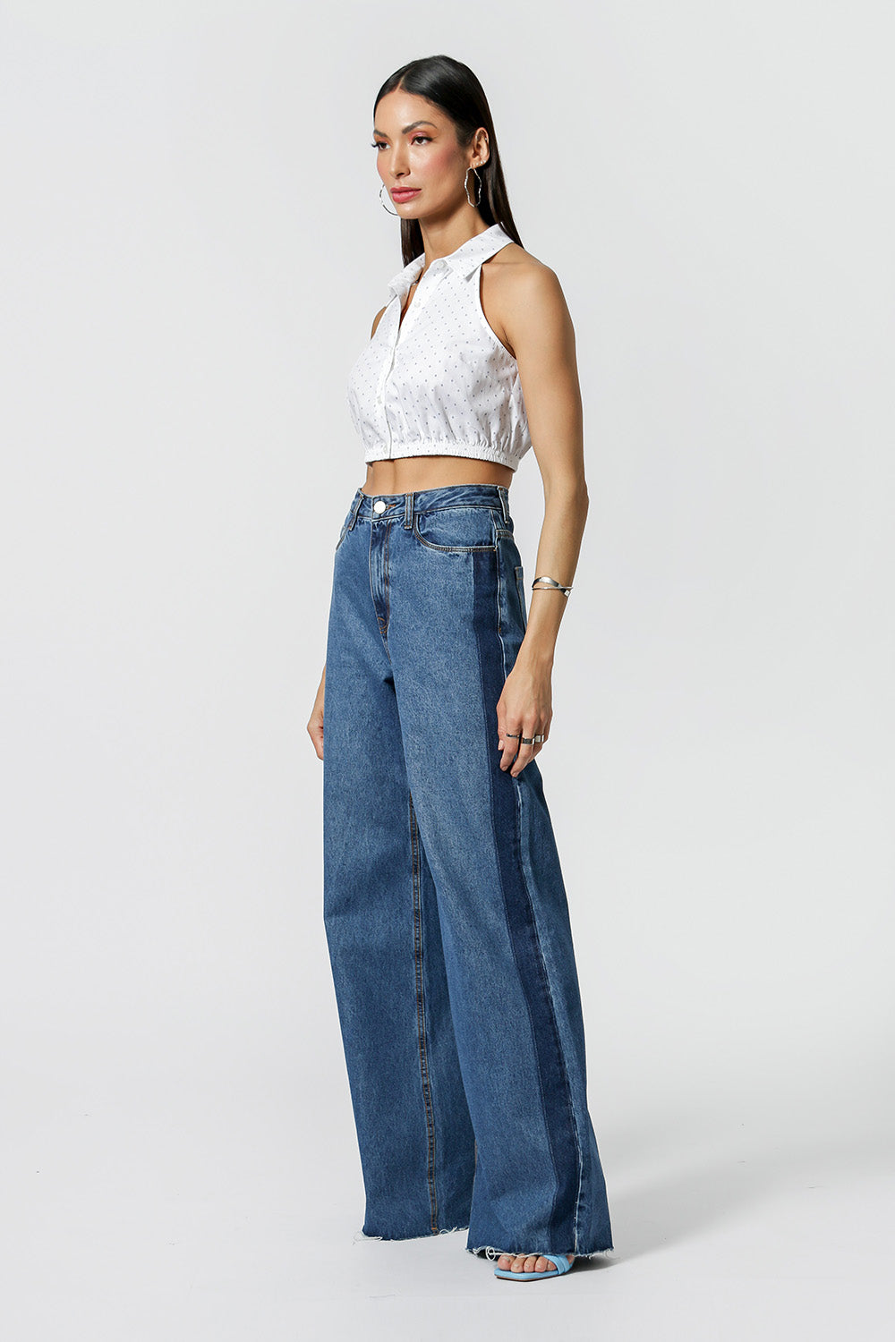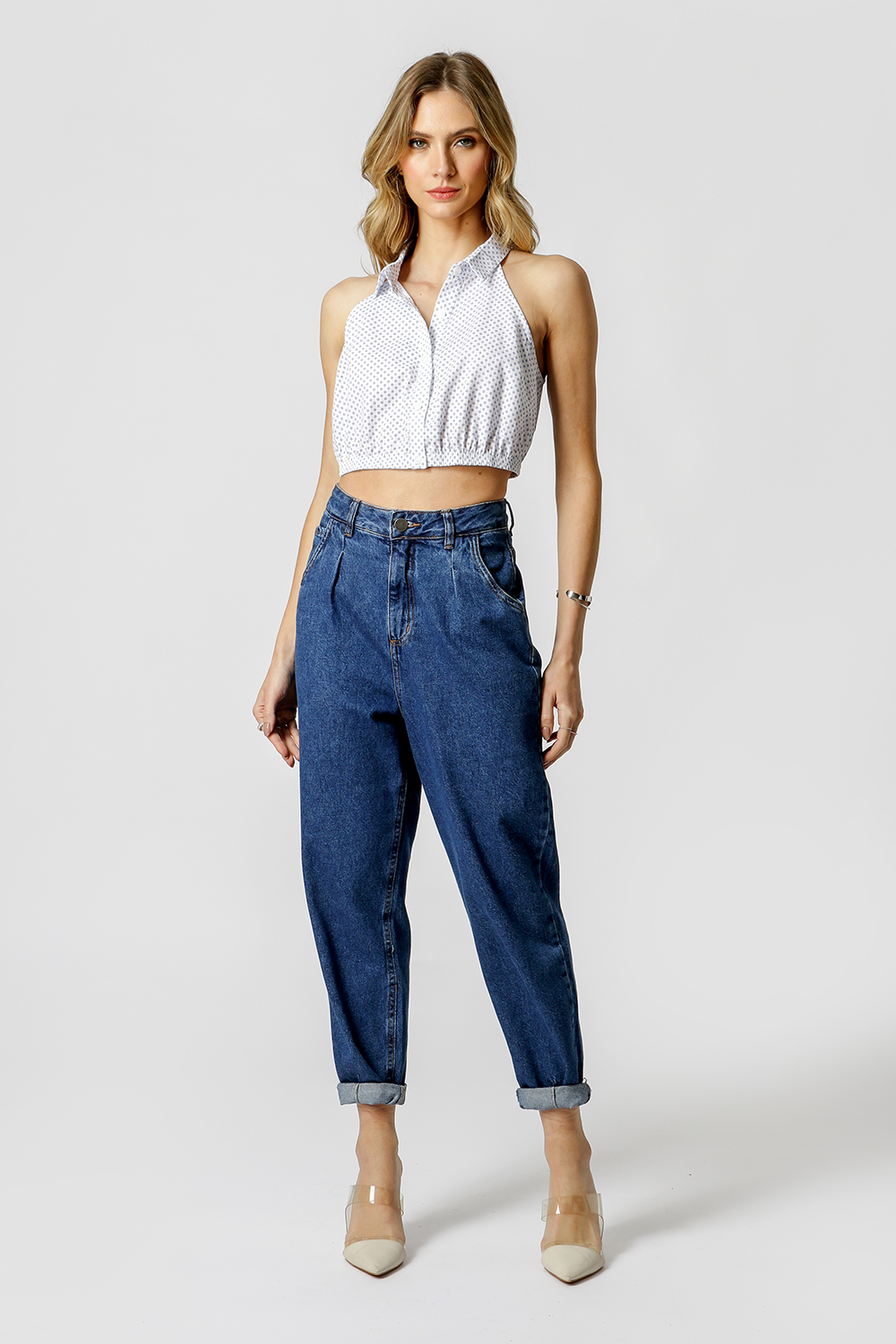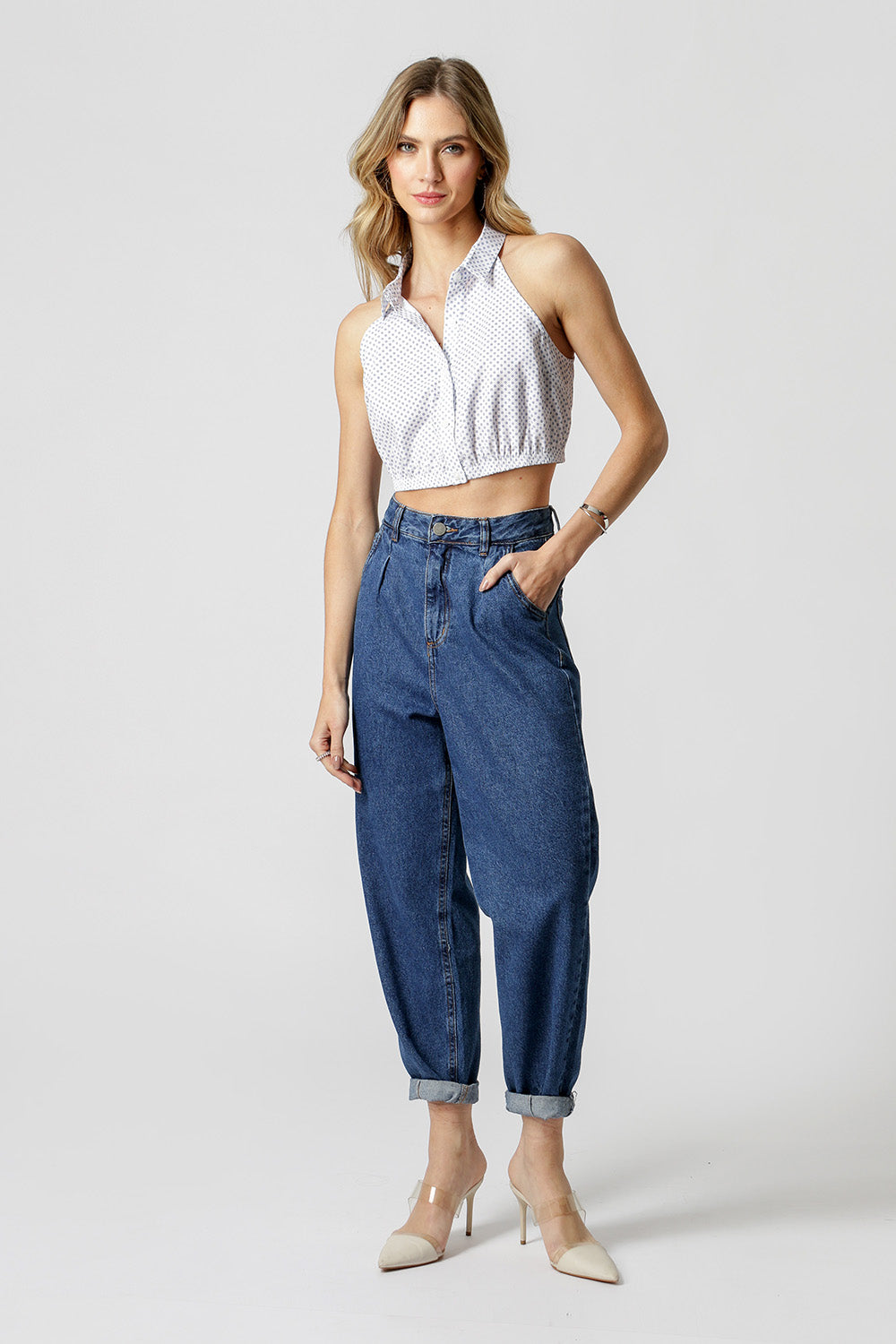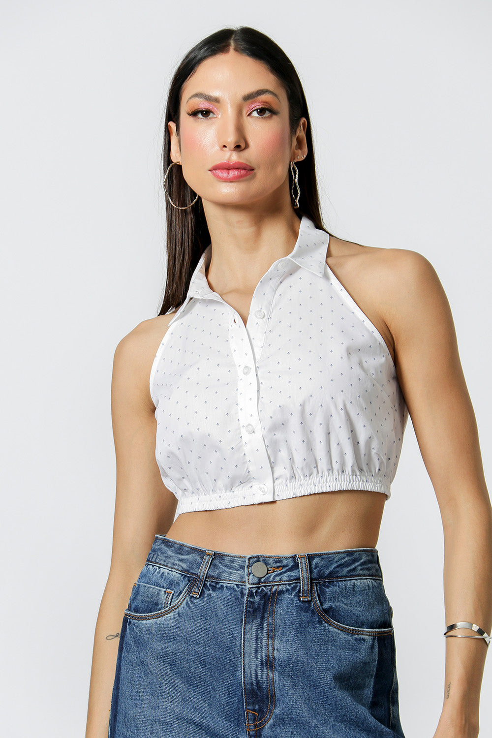 Camisa regata com comprimento cropped e detalhe de elástico na barra. Abotoamento frontal. Peça feita em tricoline estampada. Peça despojada ideal para um look ideal!