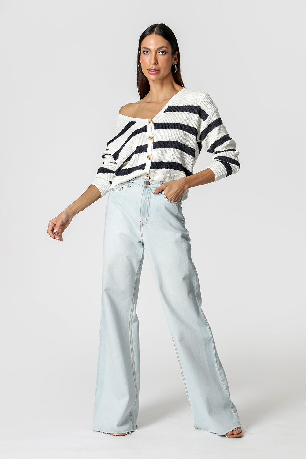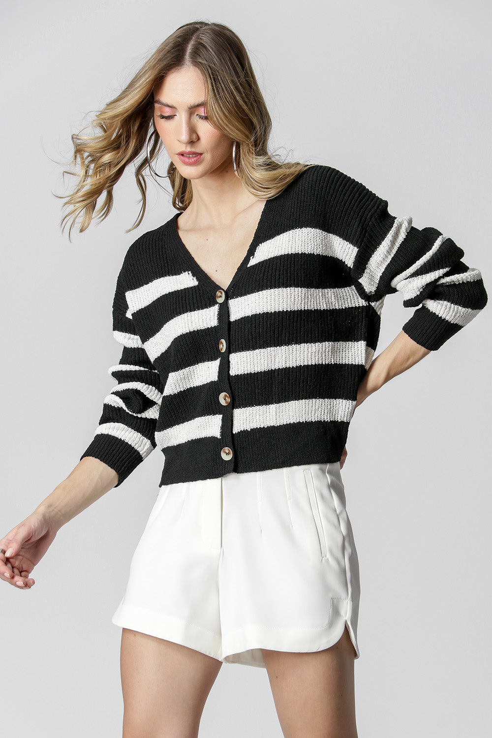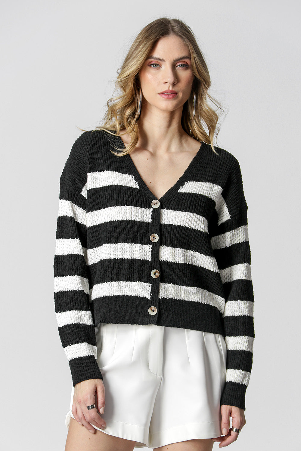 Cardigan listrado com decote em V e botões. Peça em tricô. Ideal para compor produções como terceira peça por ser uma peça versátil.