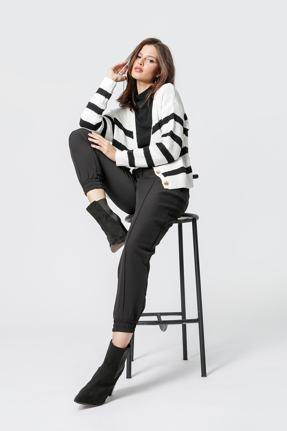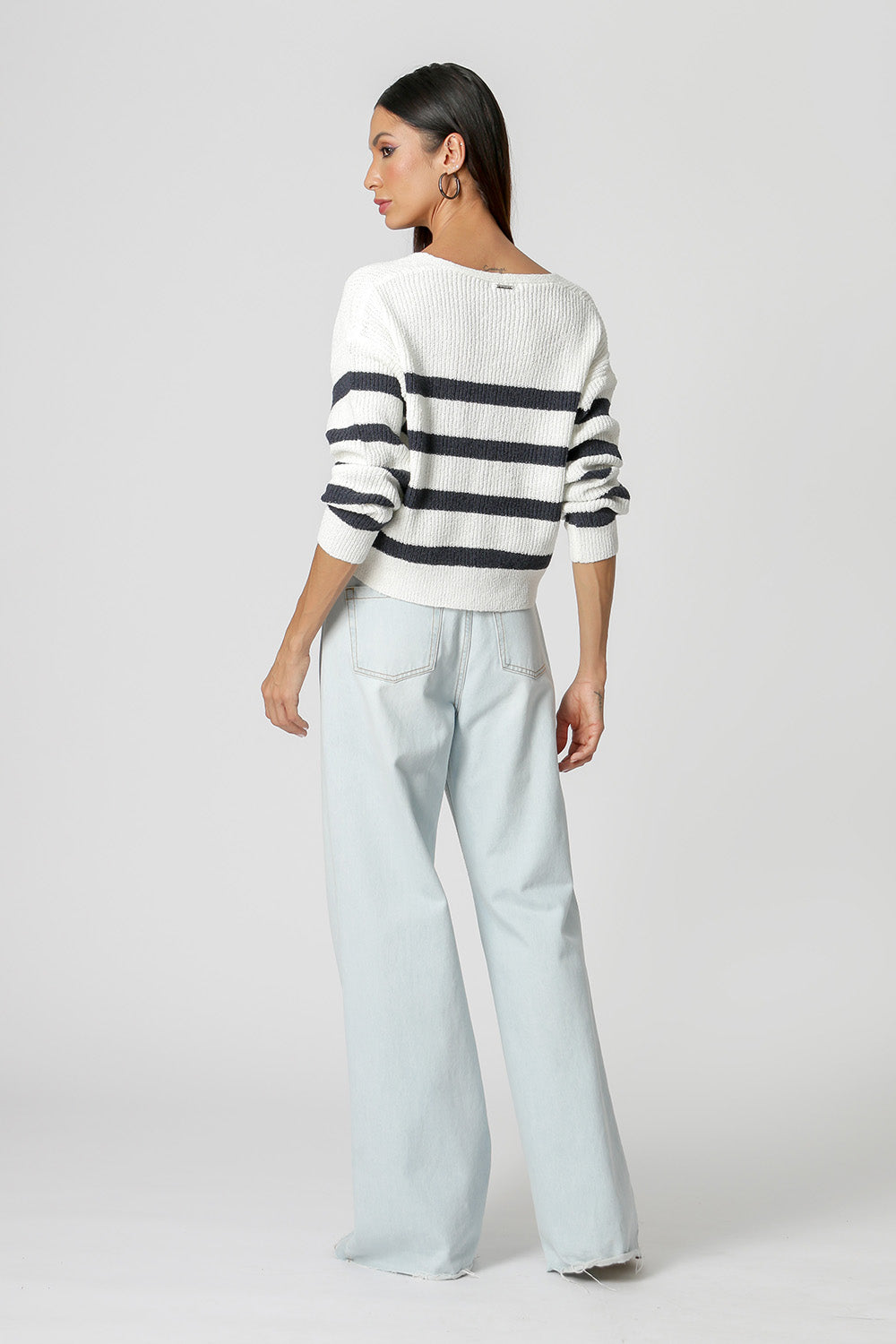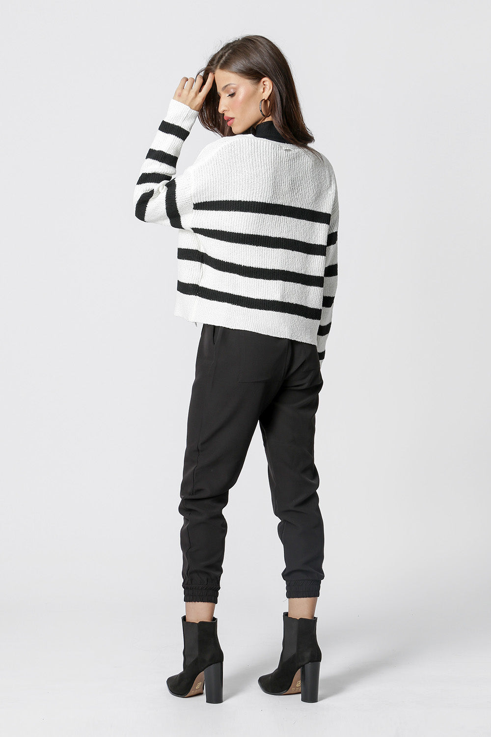 Cardigan listrado com decote em V e botões. Peça em tricô. Ideal para compor produções como terceira peça por ser uma peça versátil.