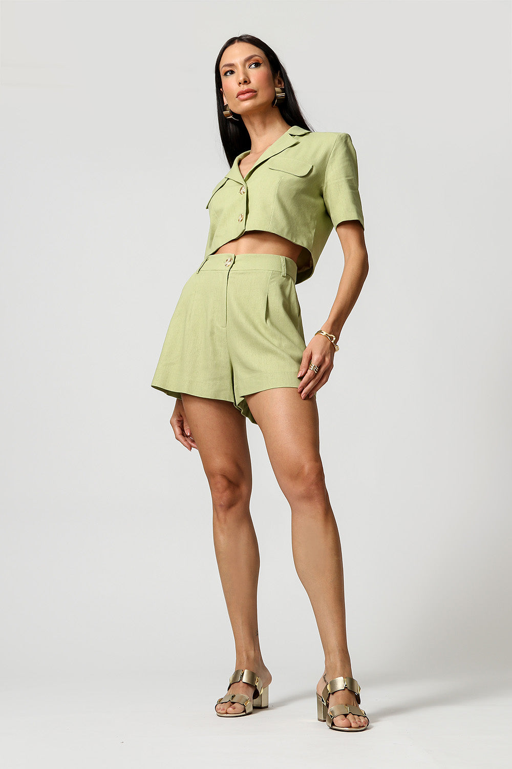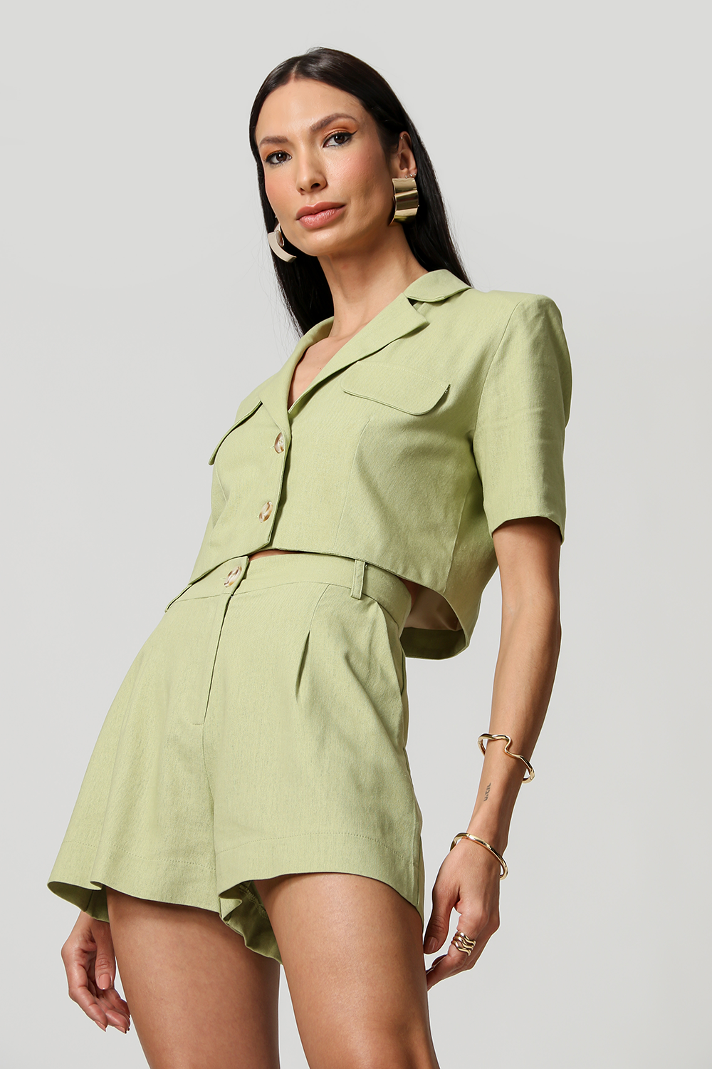 Casaqueto cropped de linho com lapelas frontais. Peça versátil, estilosa e cheia de tendência.