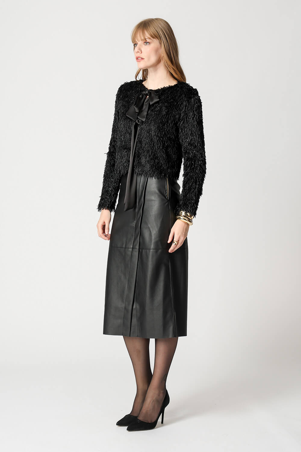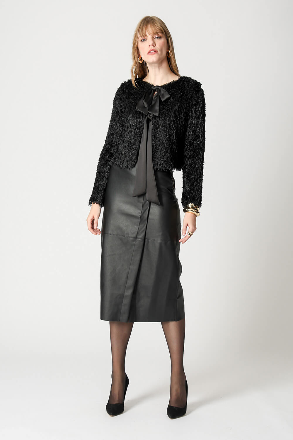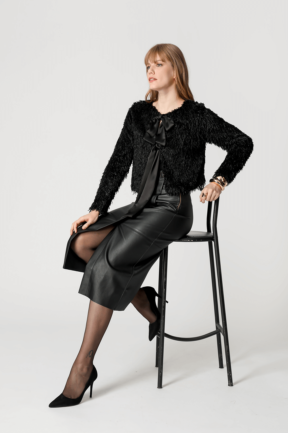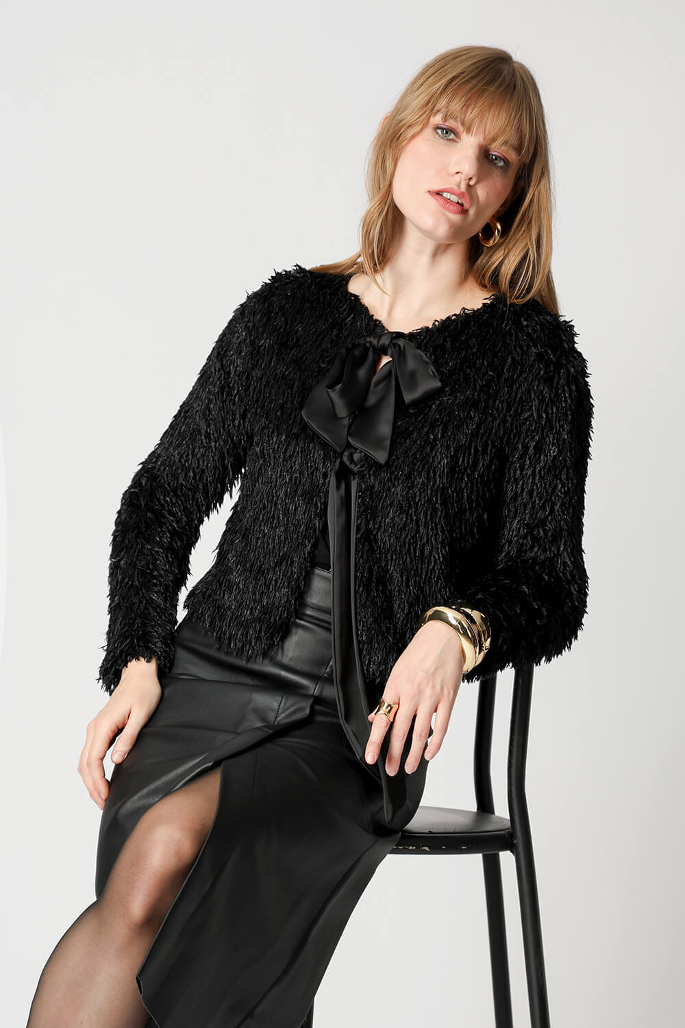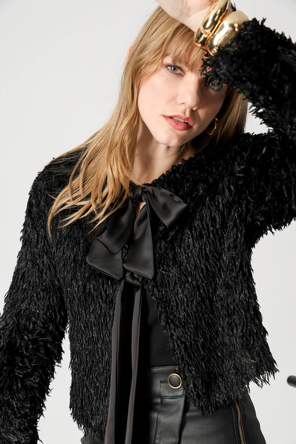 Casaqueto leve e estiloso, confeccionado em tecido de pluma. Possui ombreiras que estruturam a peça e laços delicados que trazem um toque feminino e sofisticado. Ideal para looks modernos e elegantes.