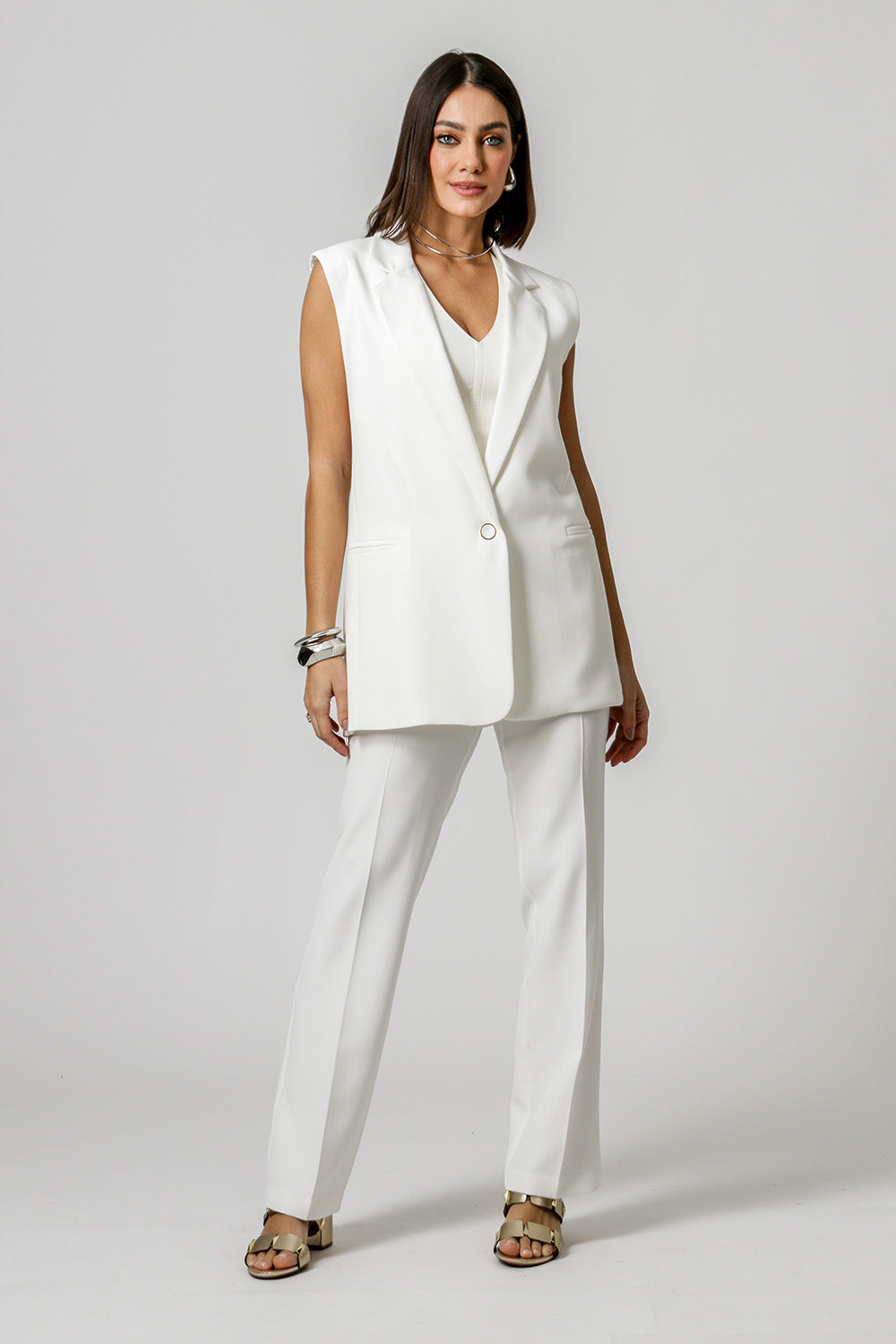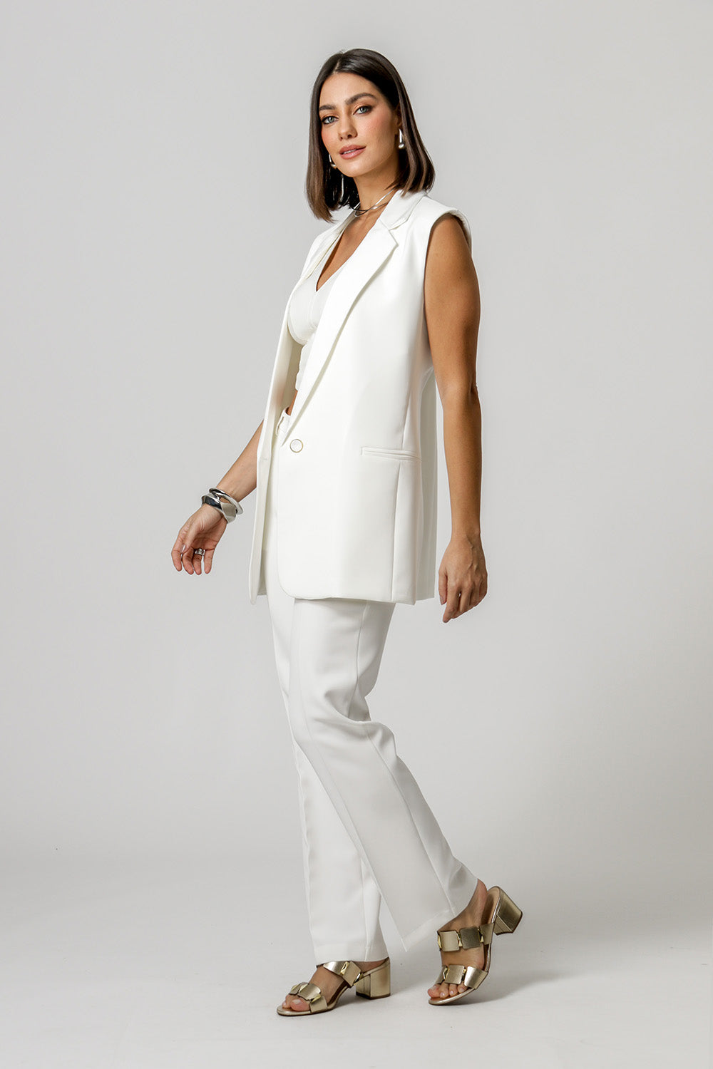 Colete Longline com botão em detalhe de metal e forrado do próprio tecido. Uma peça confeccionada em tecido alfaiataria, forrada. Modelo clássico e versátil que possibilita compor com vários looks.