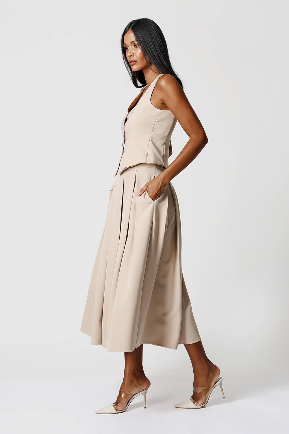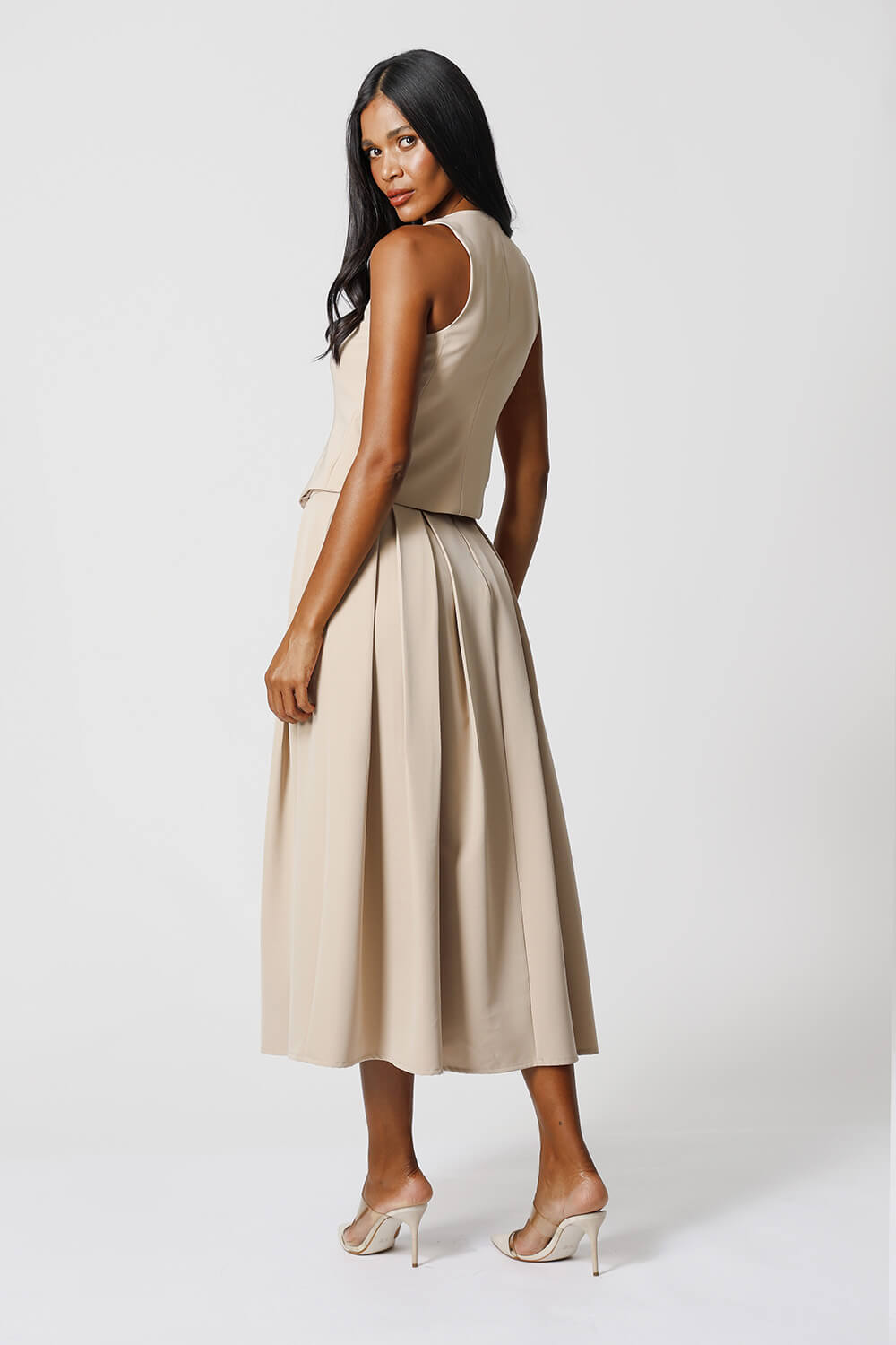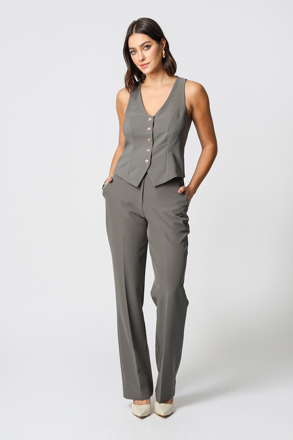 Colete com botões dourados em alfaiataria é uma peça-chave para um look refinado e atemporal. Perfeito para composições formais ou para um look moderno e elegante quando combinado com jeans e camisetas.