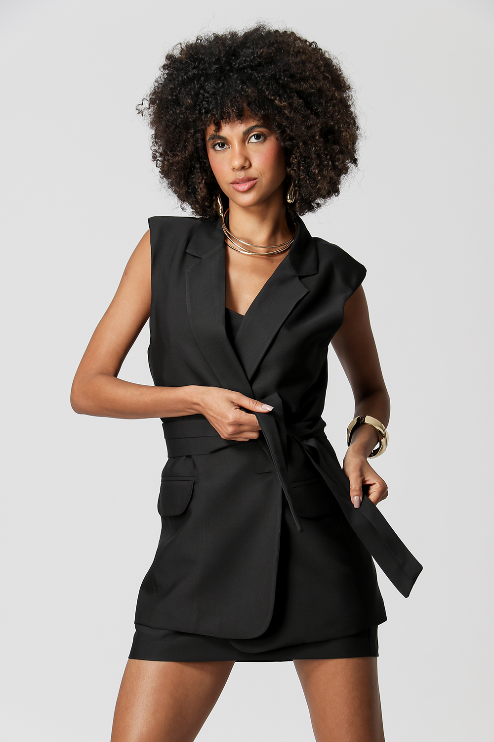 Colete alongado com faixa e forrado do próprio tecido. Uma peça confeccionada em tecido alfaiataria. Modelo clássico e versátil que possibilita compor com vários looks.