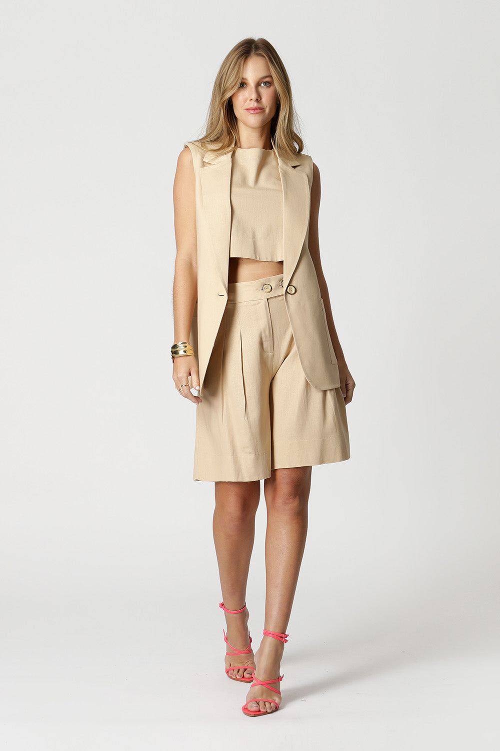 Colete de linho com shape longline. Possui bolsos e vem acompanhada de uma faixa para acinturar o look.