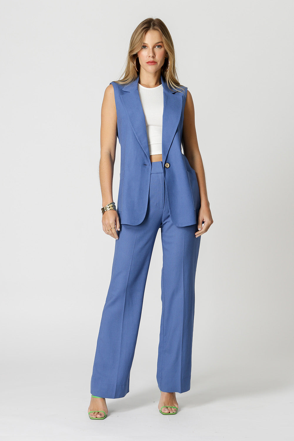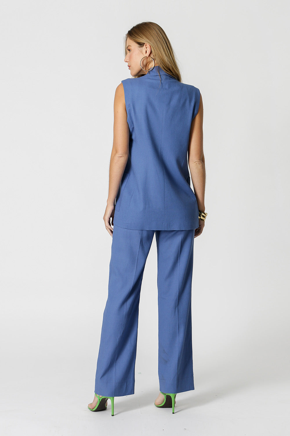 Colete de linho com shape longline. Possui bolsos e vem acompanhada de uma faixa para acinturar o look.