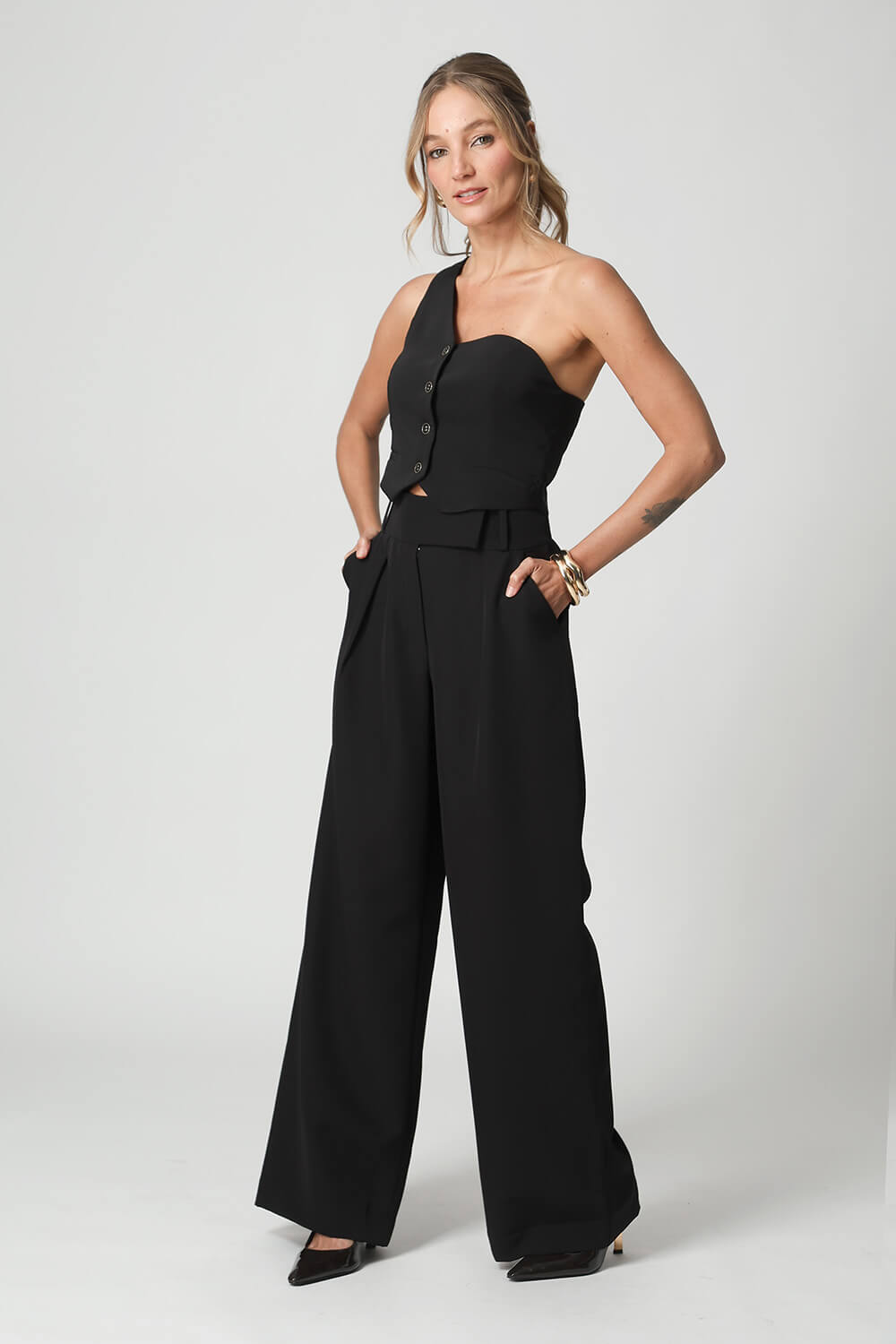 Colete ombro único. Uma peça em alfaiataria moderna com decote diferenciado é ideal para quem procura um look easy chic.