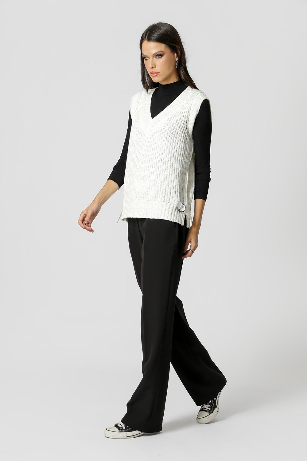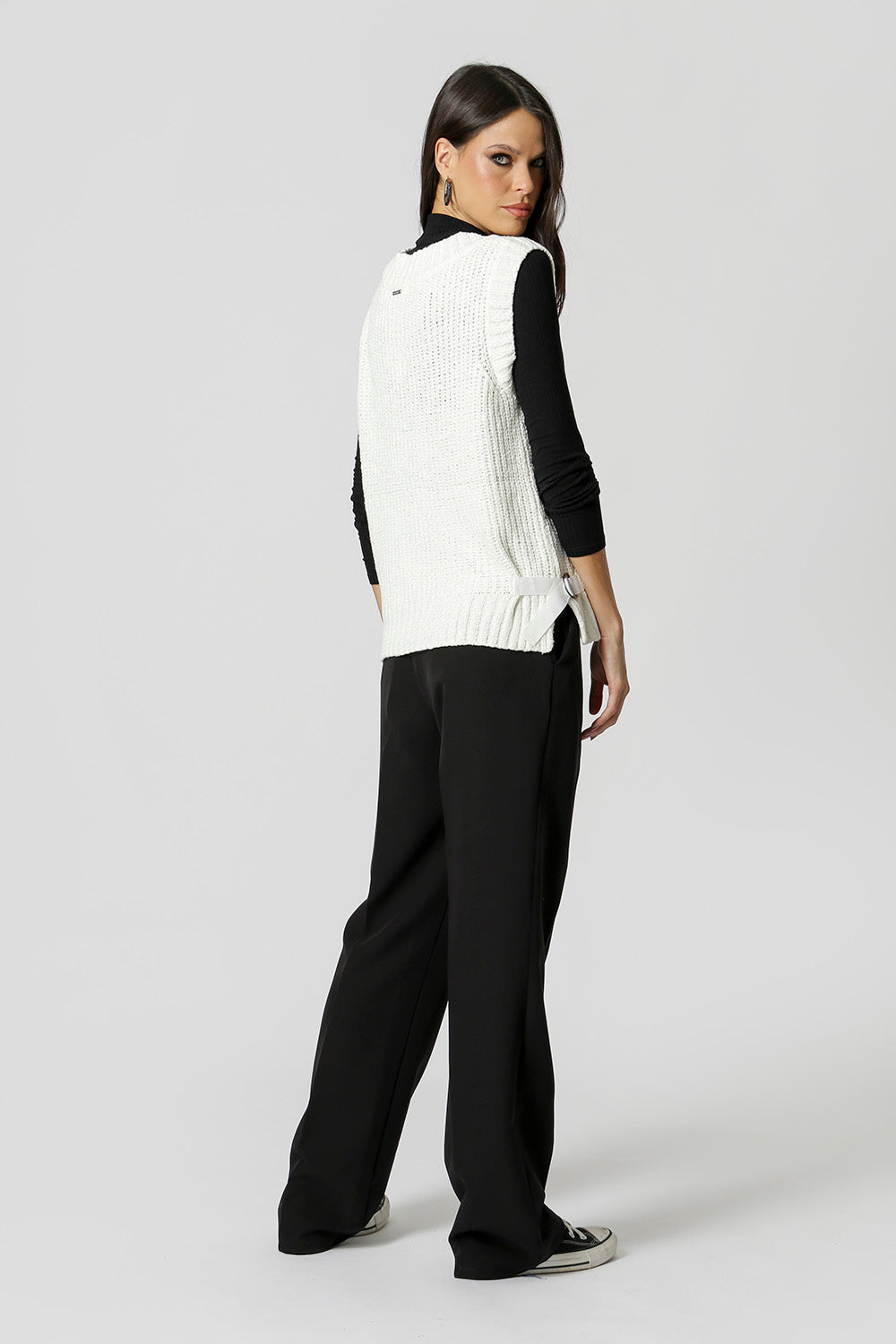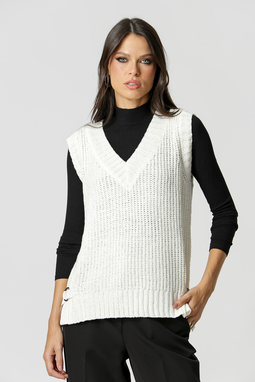 Colete tricô com detalhe na laterais com fivelas. Peça em viscose e poliamida. O colete é uma peça que pode ser usada por cima de uma camisa ou como uma blusa.