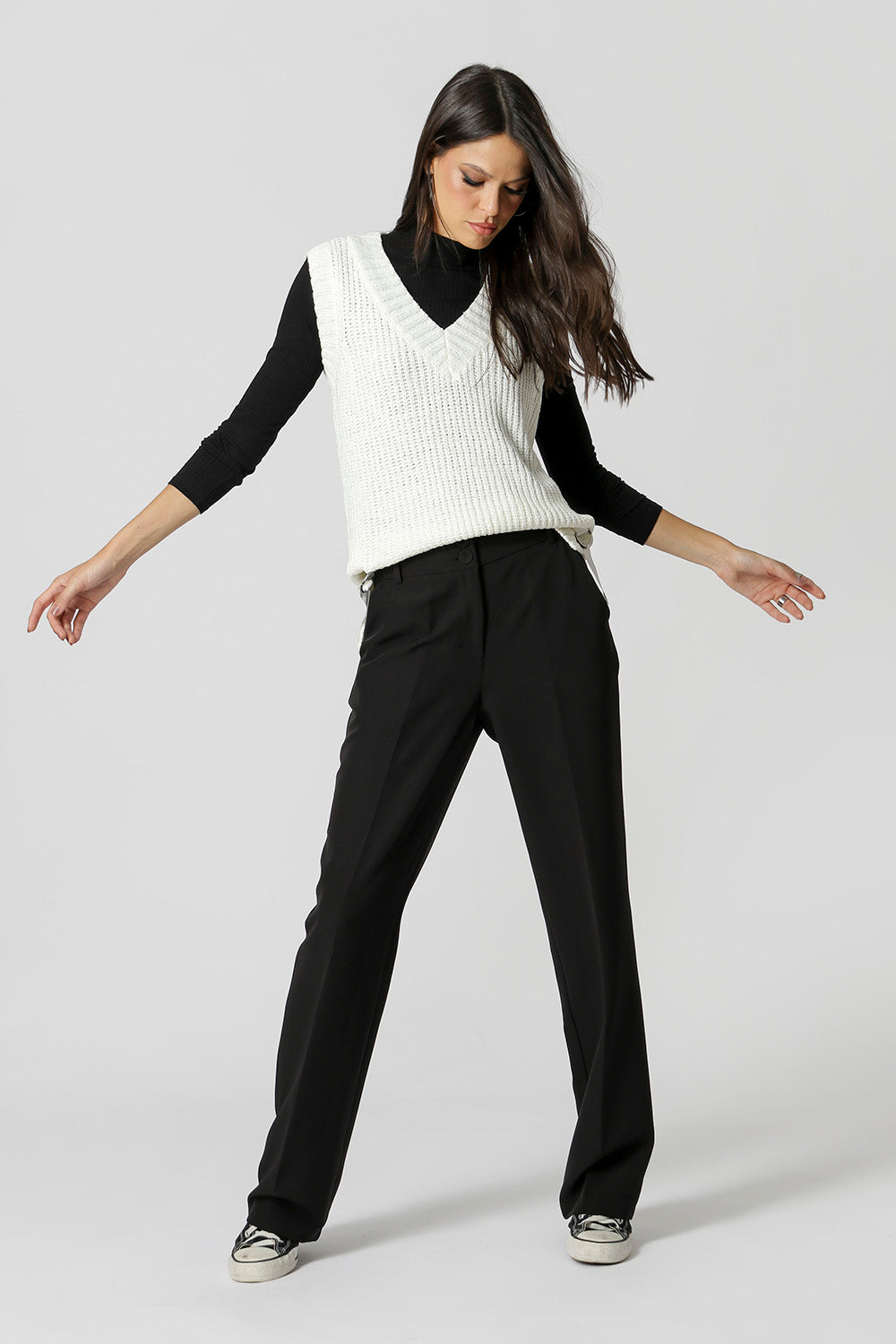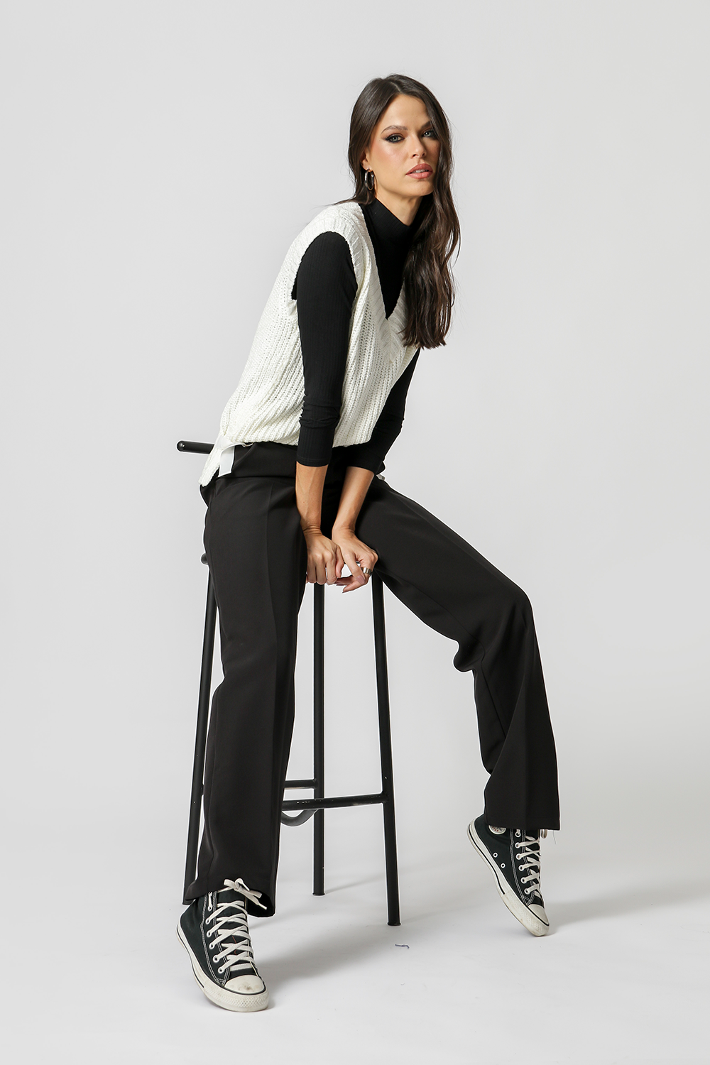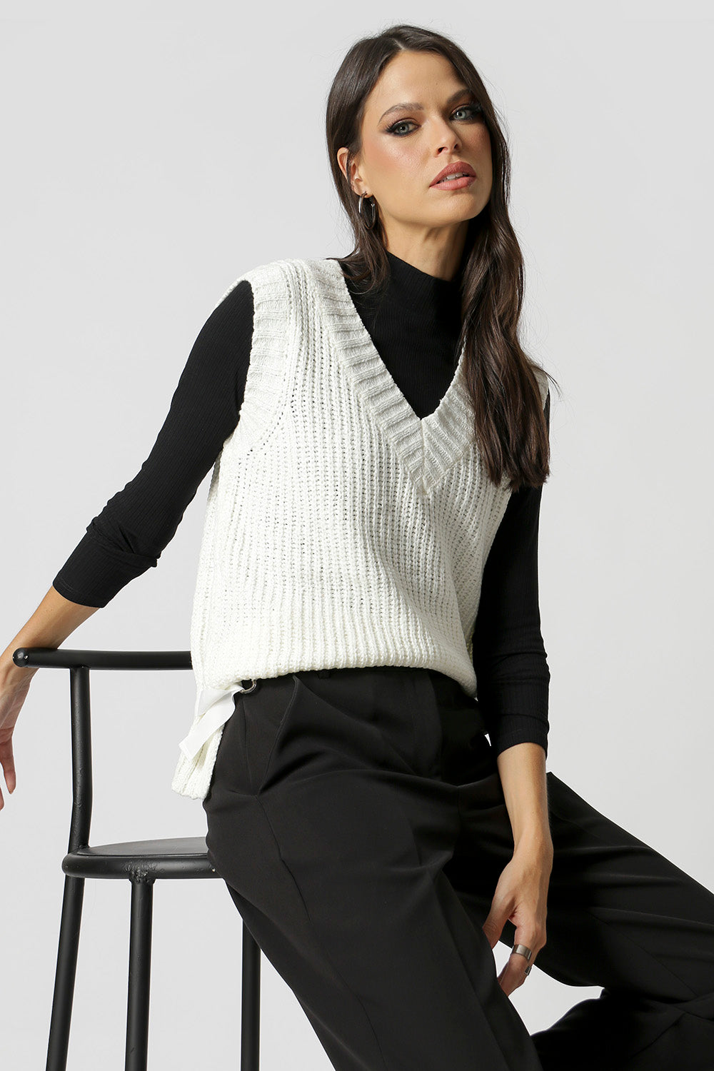 Colete tricô com detalhe na laterais com fivelas. Peça em viscose e poliamida. O colete é uma peça que pode ser usada por cima de uma camisa ou como uma blusa.