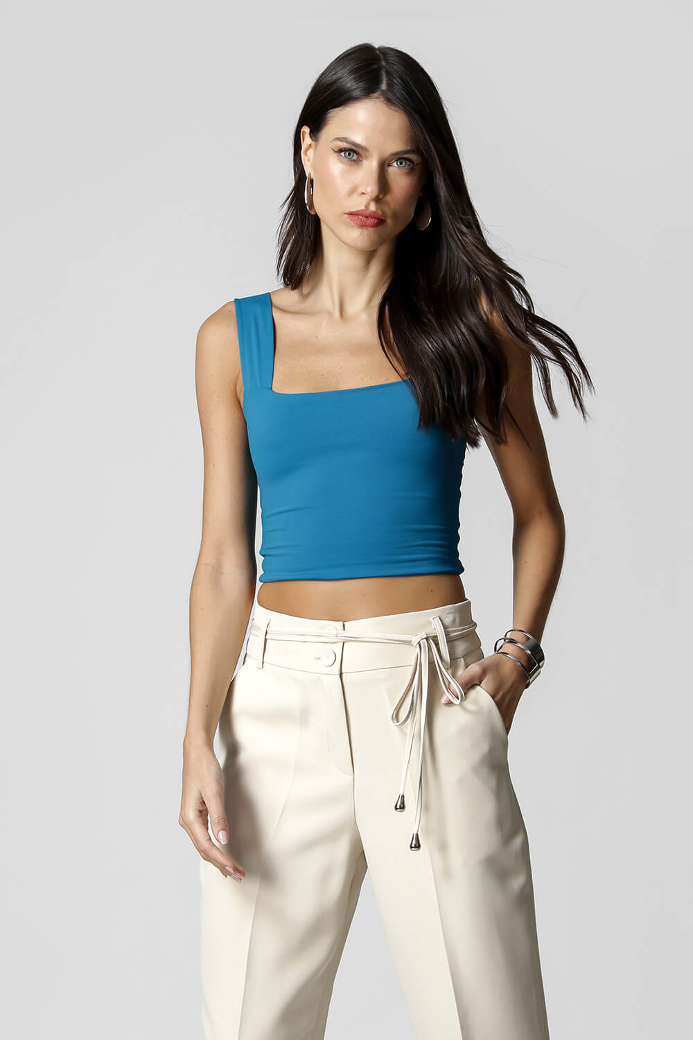 Cropped confeccionado em malha, com modelagem justa e alças largas. É uma peça básica que não pode faltar no seu guarda roupa.