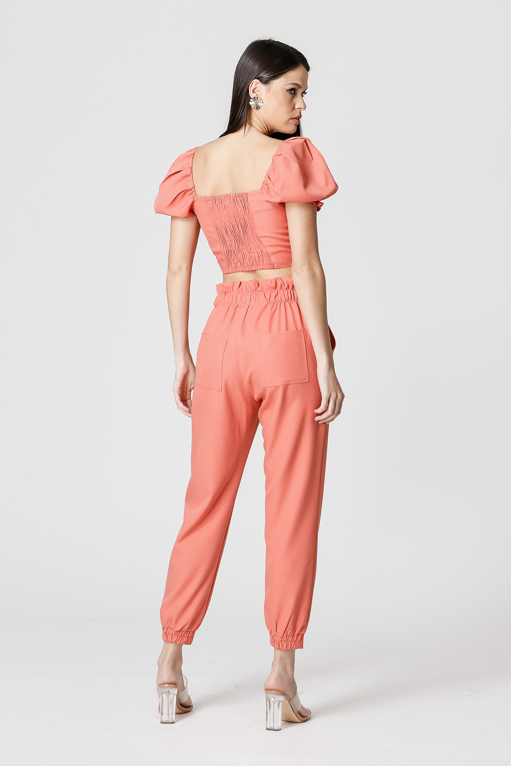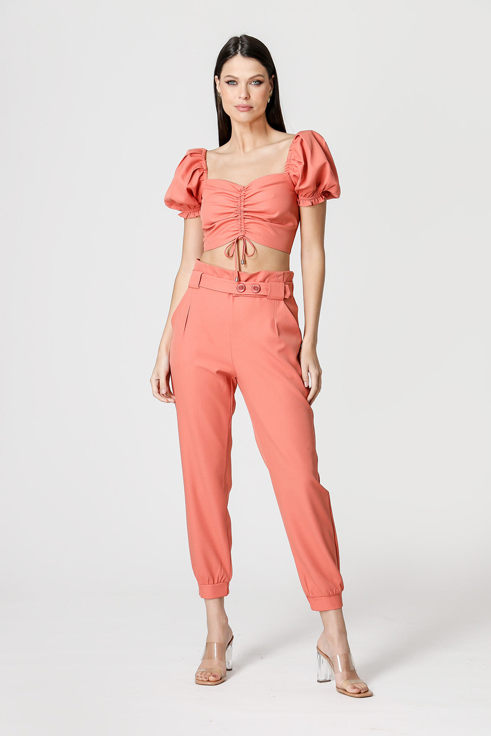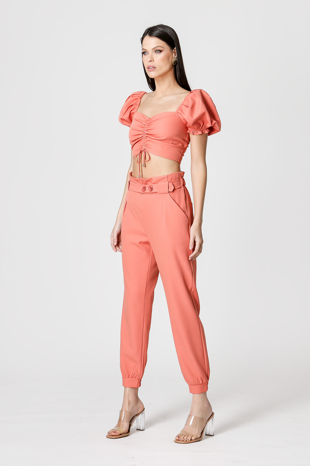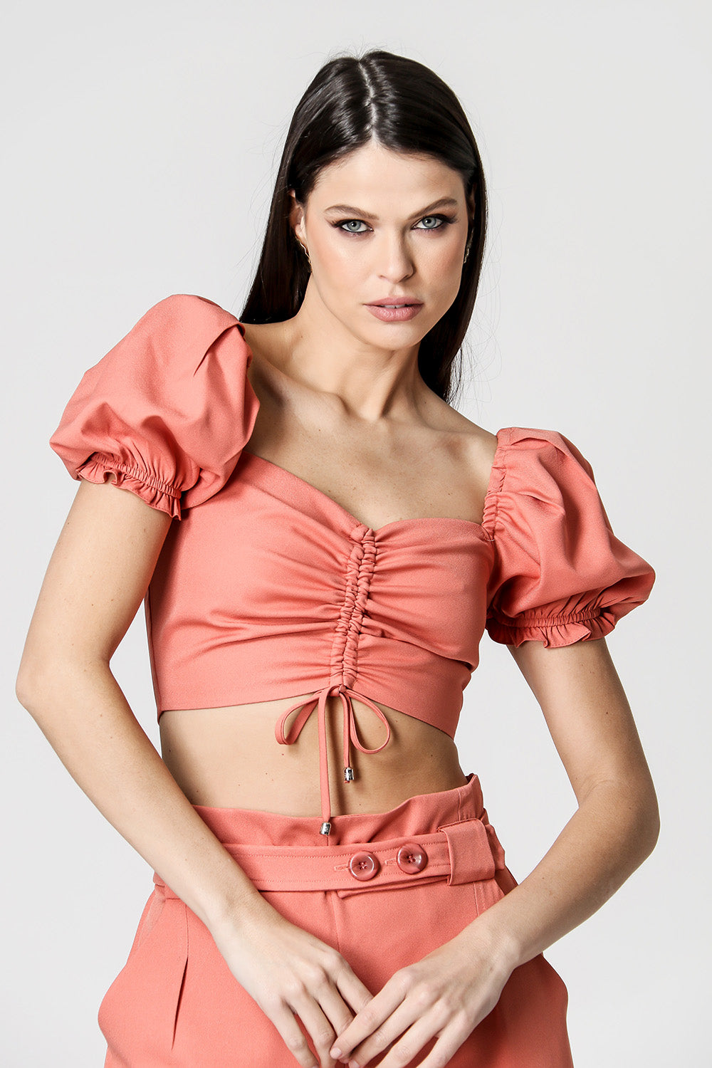 Blusa cropped de manga bufante feito em alfaiataria creponada. Detalhe de canalete e rolete para amarração e regulagem. Possui lastex nas costas para maior conforto. Peça com toque fashionista, para você arrasar nas suas produções.