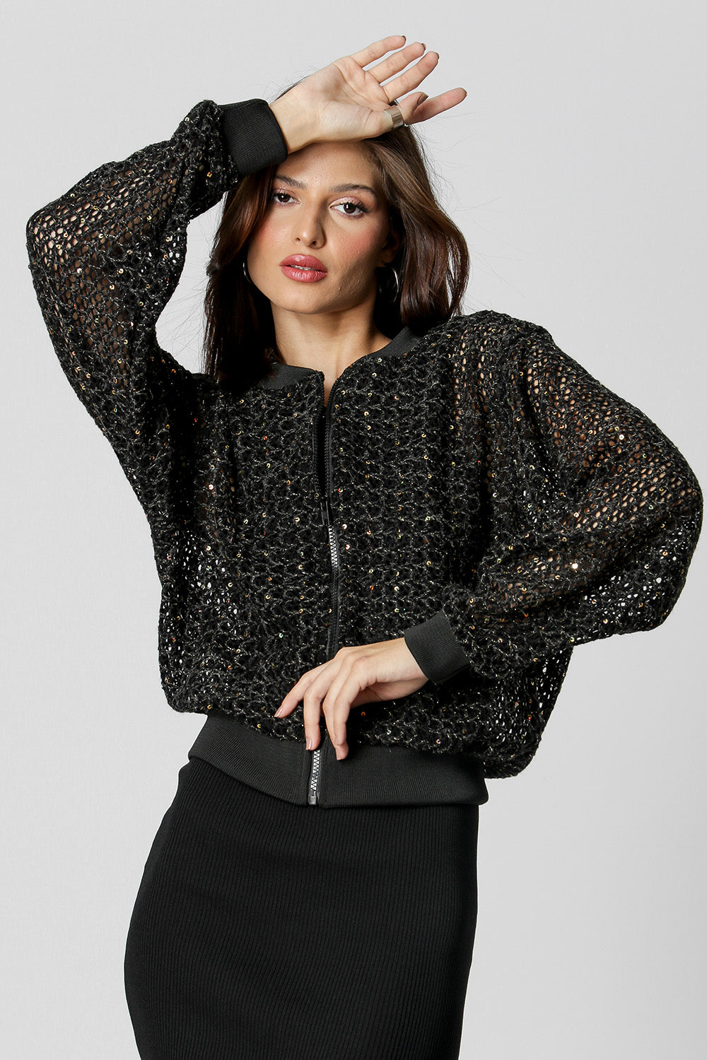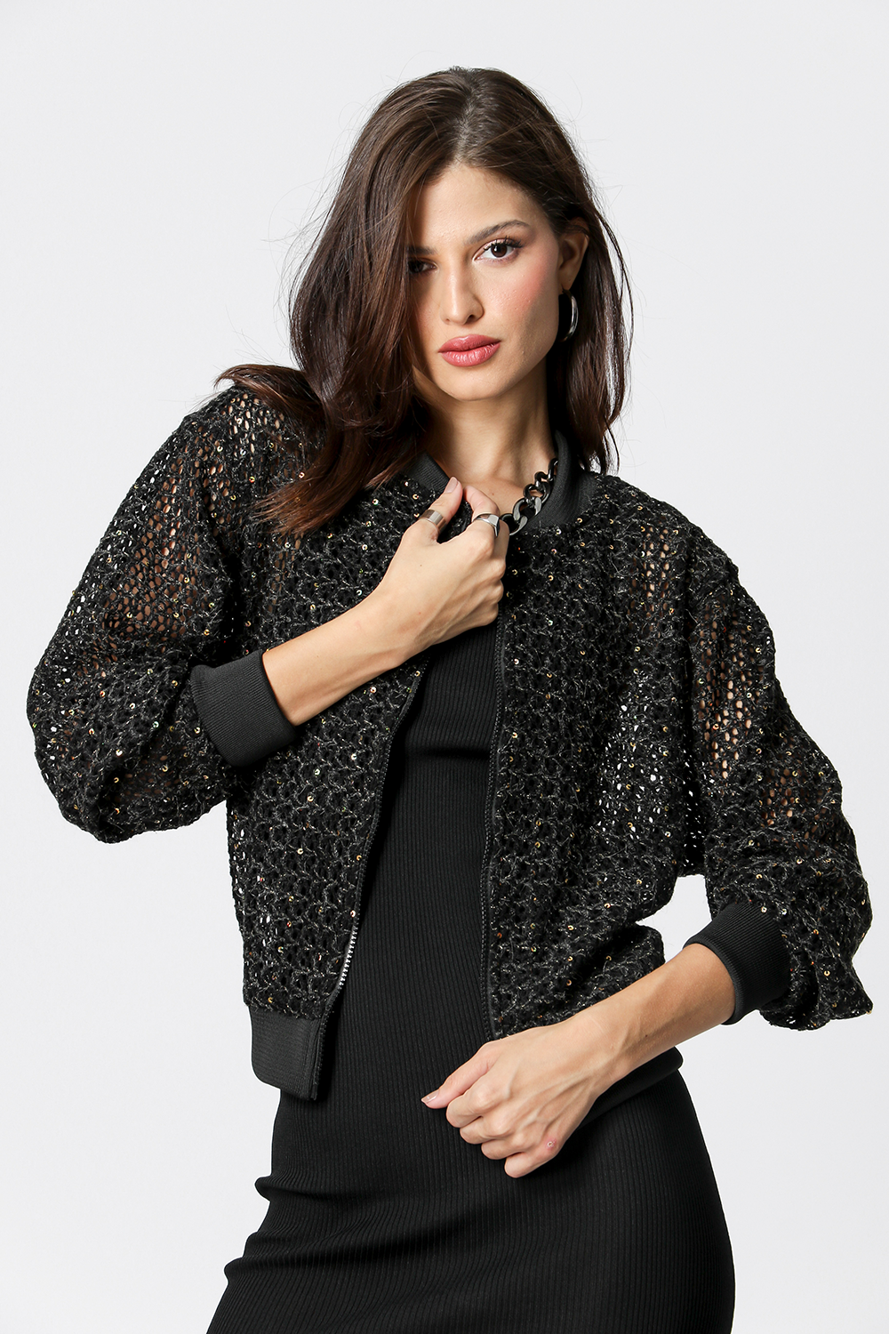 Jaqueta Bomber. Confeccionada em Tecido Malha crochê com detalhe de lantejoula. Peça confortável e cheia de estilo para compor looks Night.