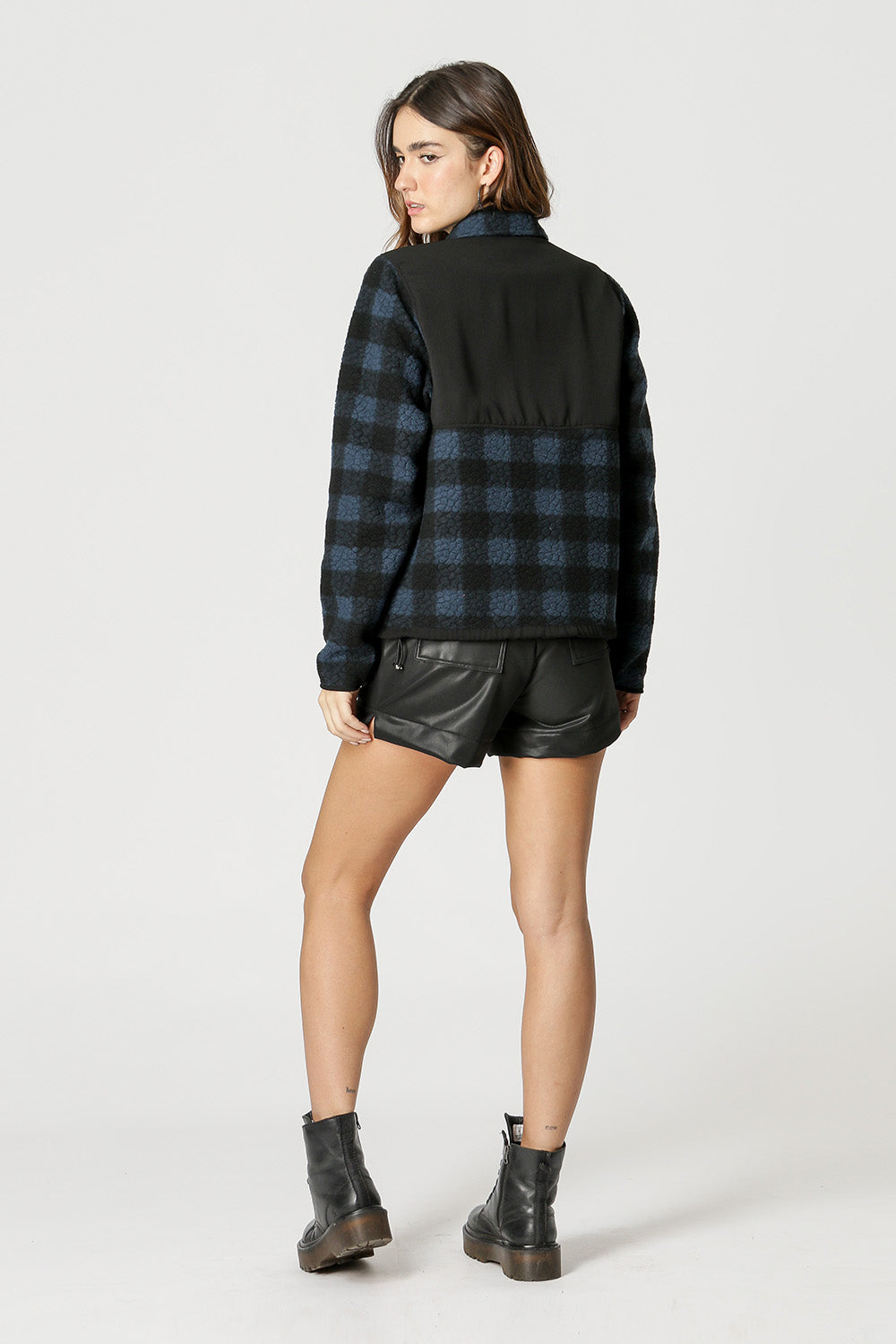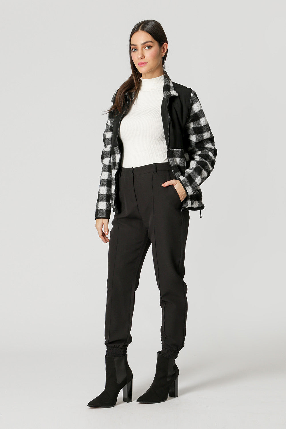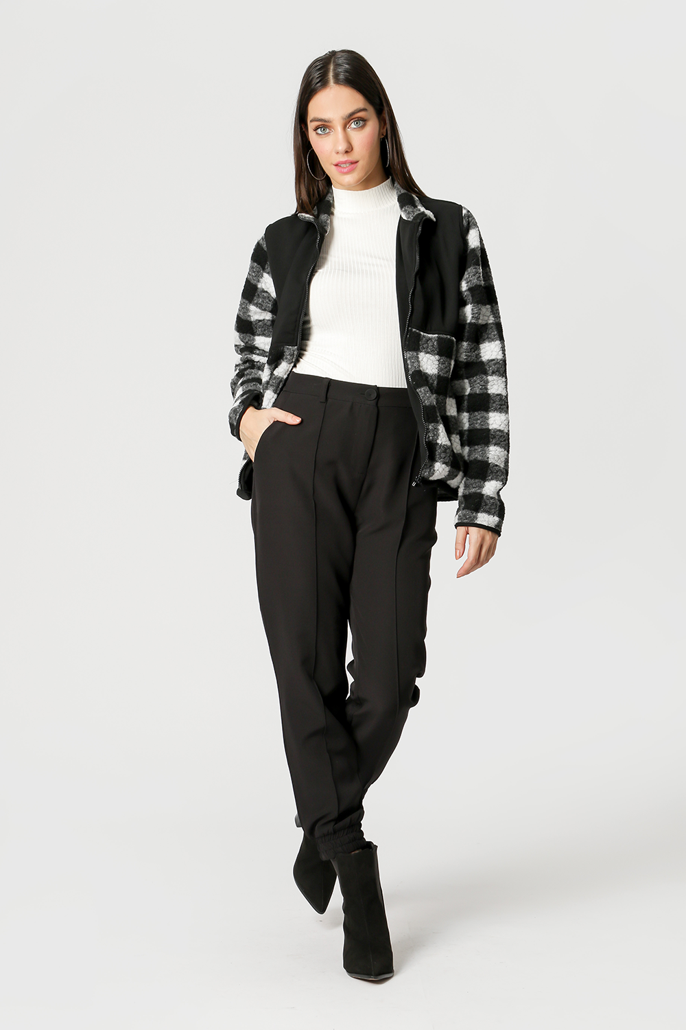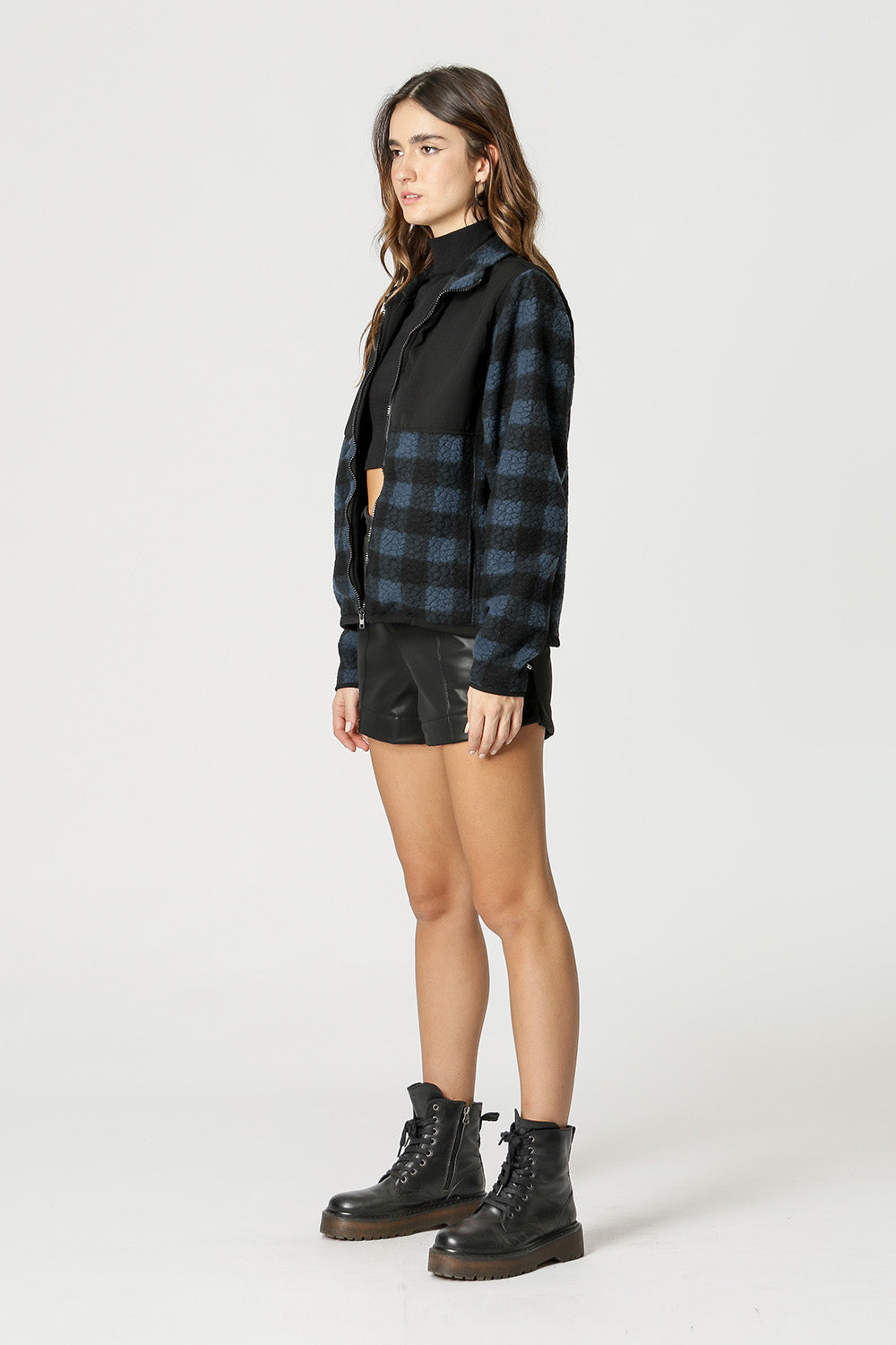 Jaqueta bomber xadrez com detalhe em elástico na barra junto com regulador de metal. Uma peça confeccionada em tecido camer fur, peça cheia de estilo e confortável, perfeito para arrasar nesse inverno.