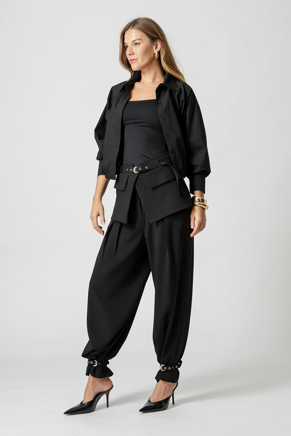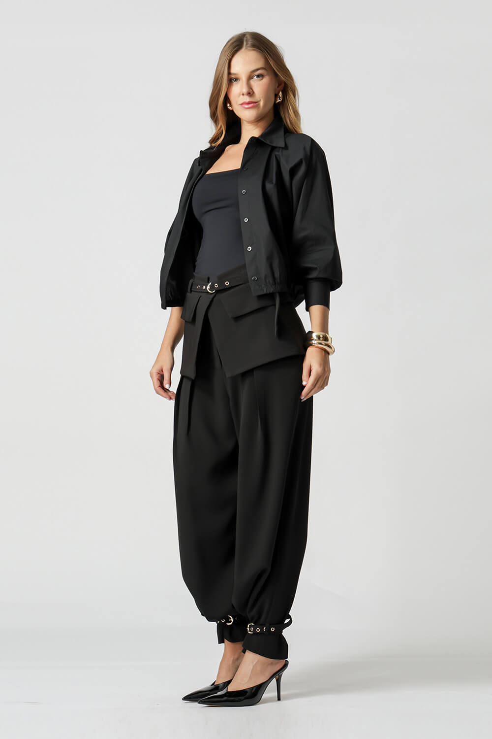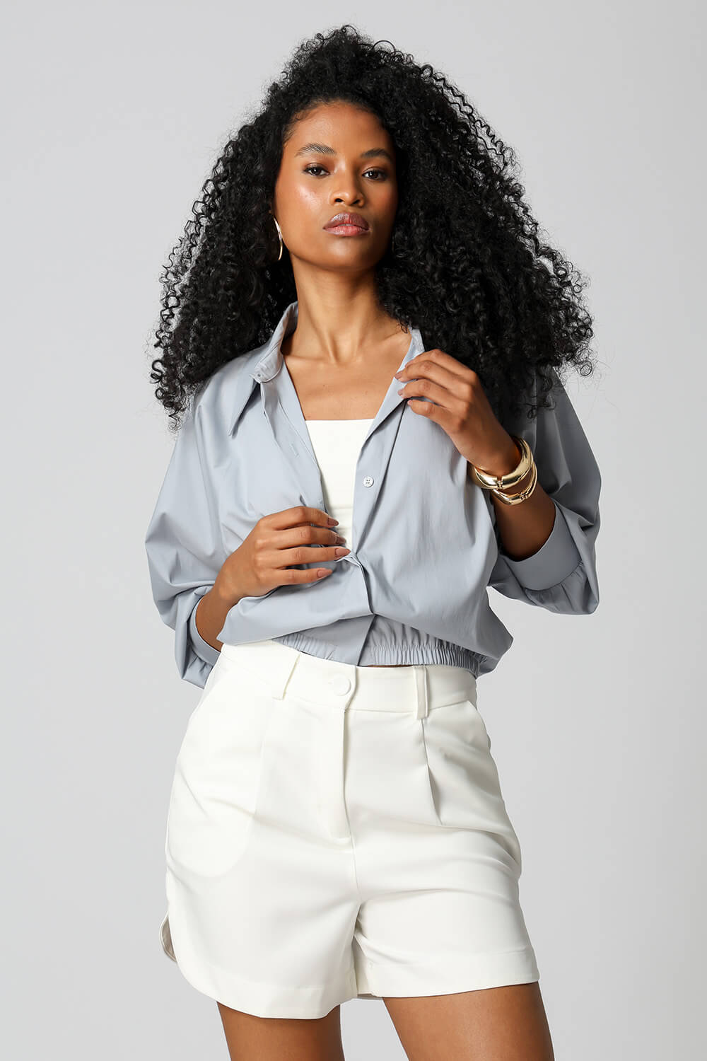 Com shape balonê moderno, esta jaqueta camisa traz punhos com lastex e vista dupla que esconde os botões, garantindo um visual sofisticado. Confeccionada em tricoline leve e estruturada, é perfeita para looks estilosos e versáteis.