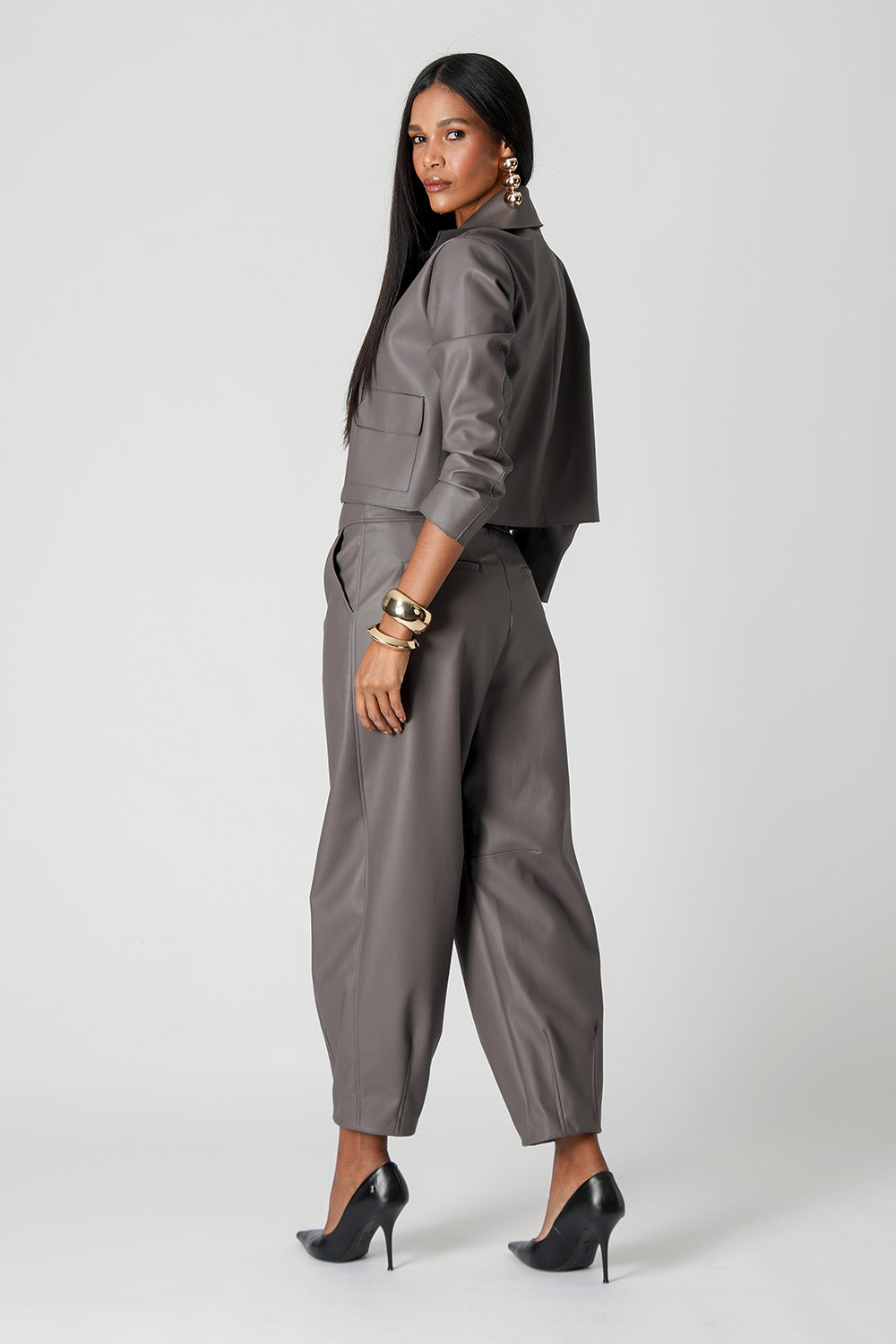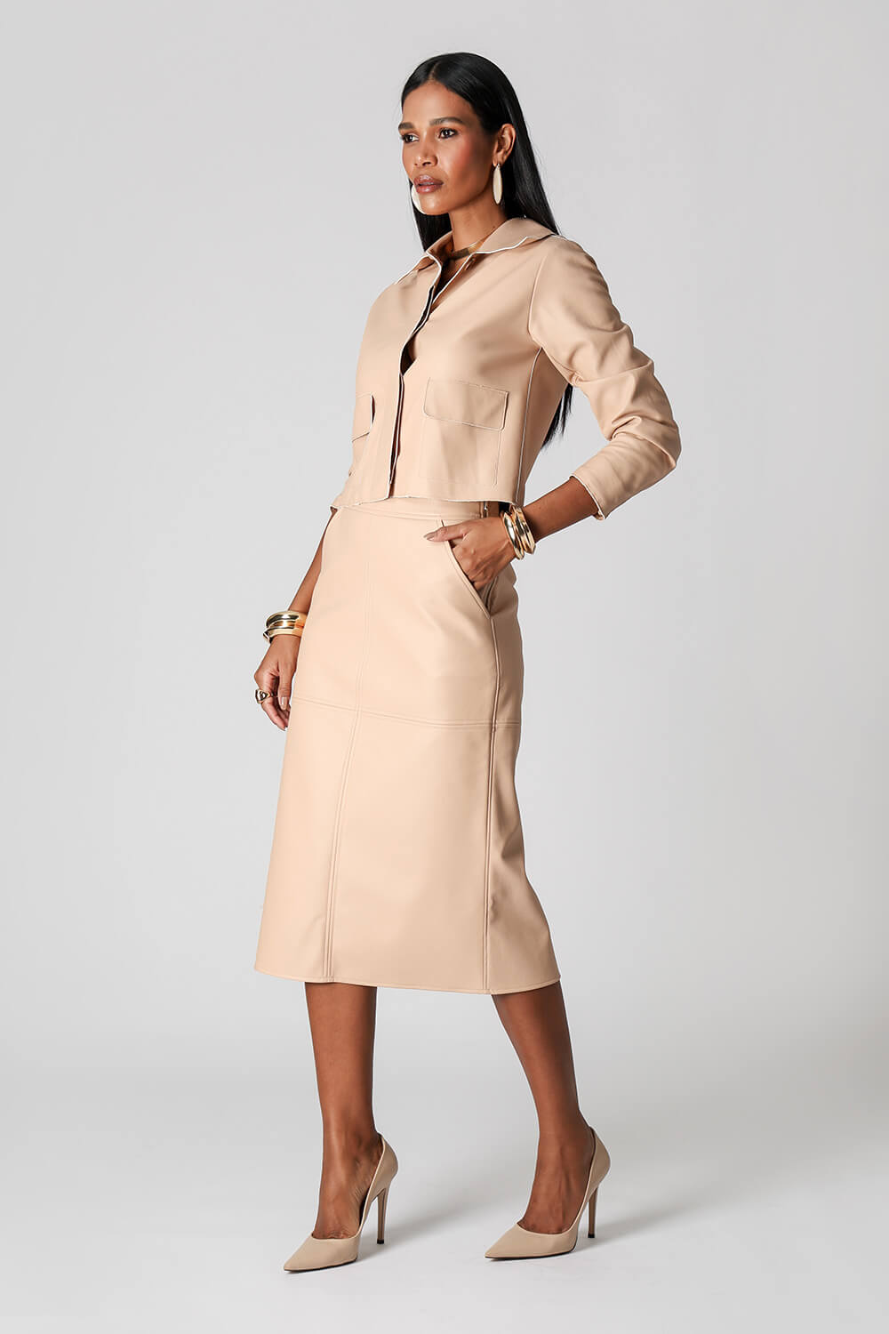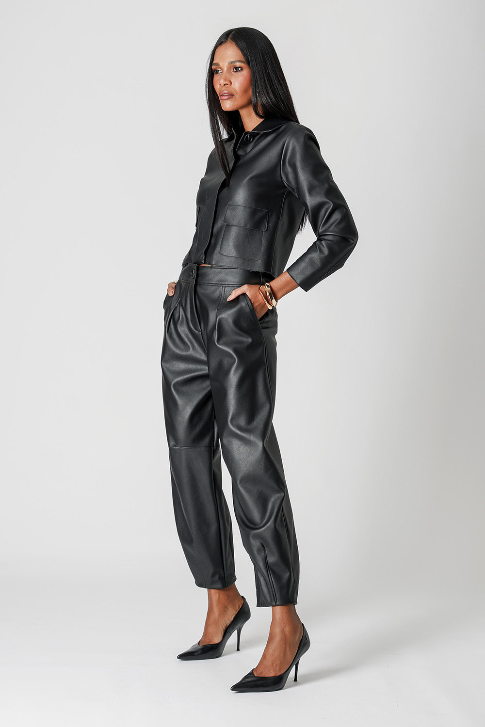 Jaqueta confeccionada em couro sintético, com vista frontal escondida que garante um visual clean. Possui bolso frontal funcional e acabamento moderno, perfeita para compor looks versáteis.
