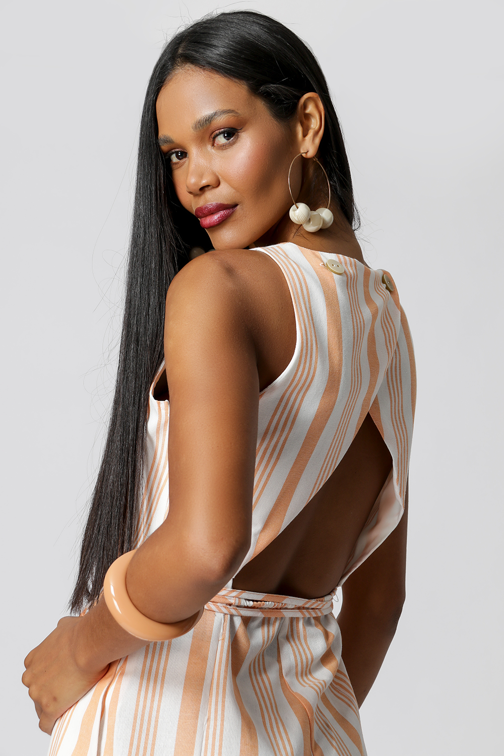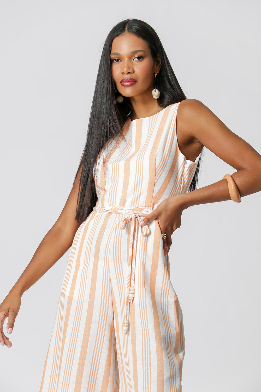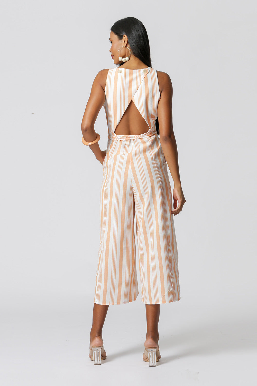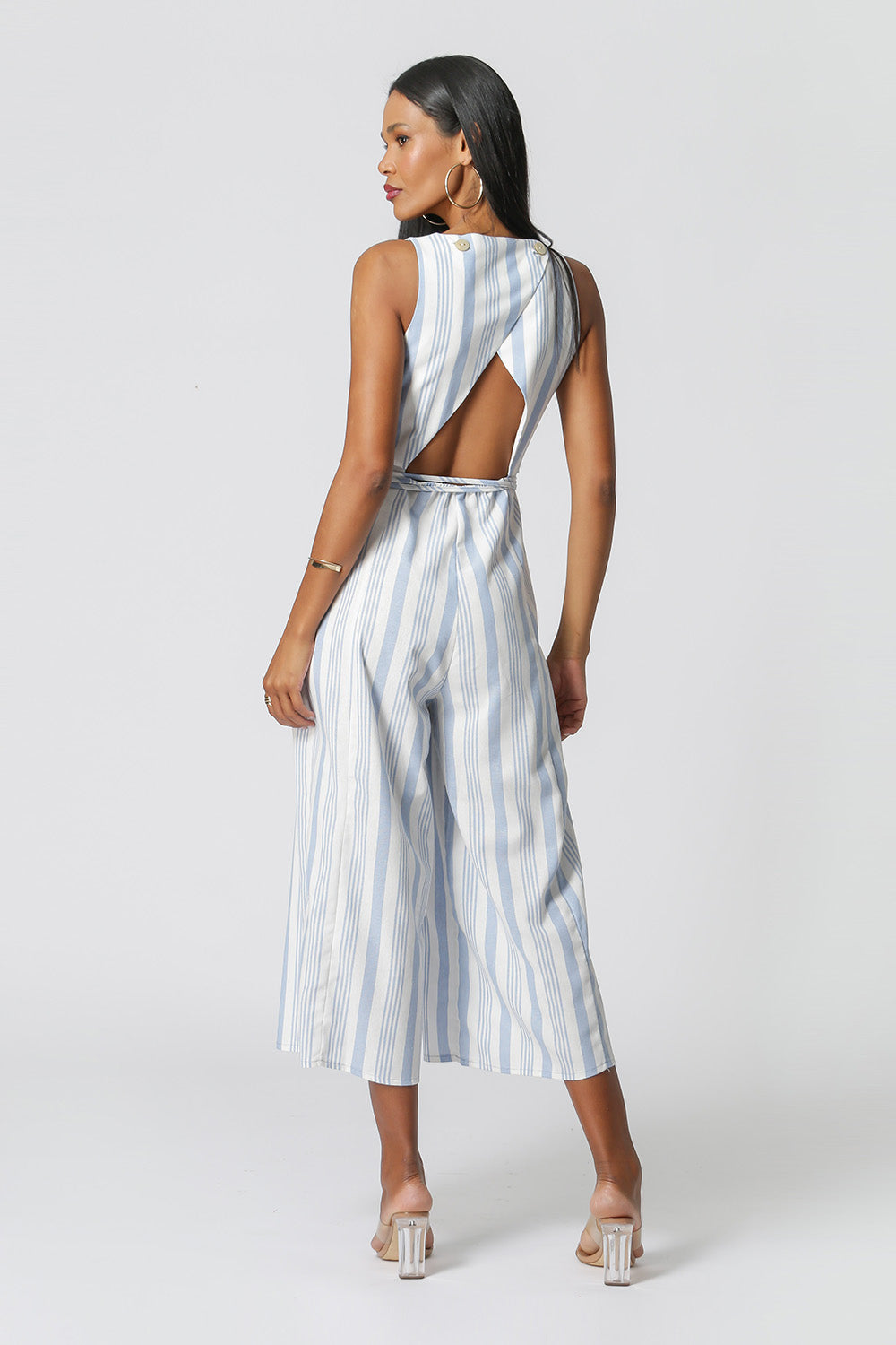 Macacão com abertura nas costas, tiras para amarração na cintura e botões. Peça confeccionada em tecido Linho Listrado. Um modelo superconfortável para mulheres criativas e que não dispensam elegância no look.