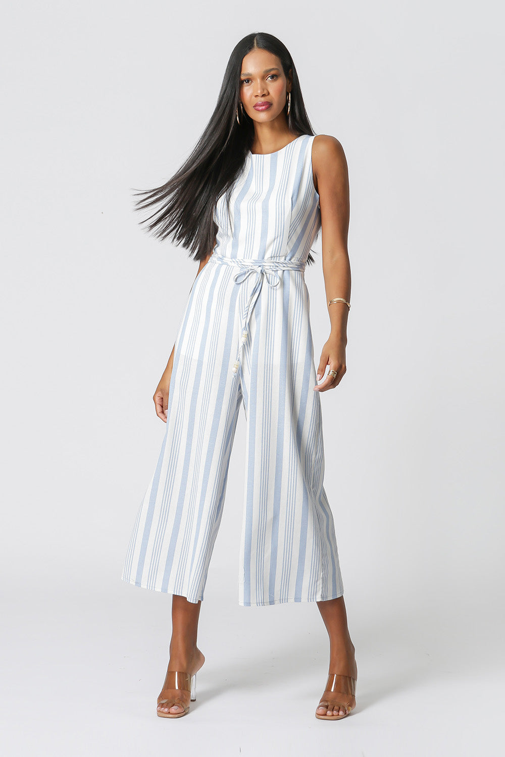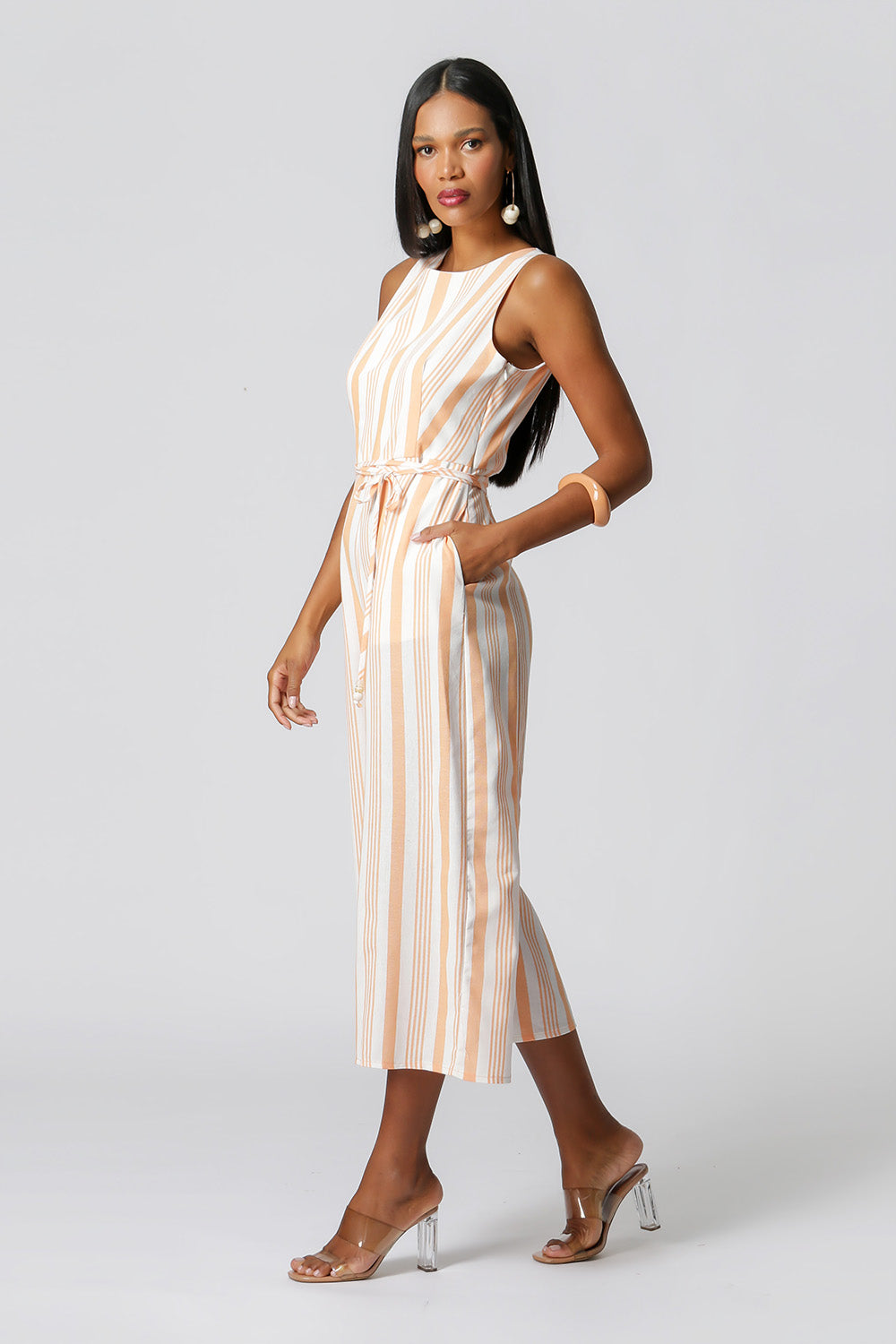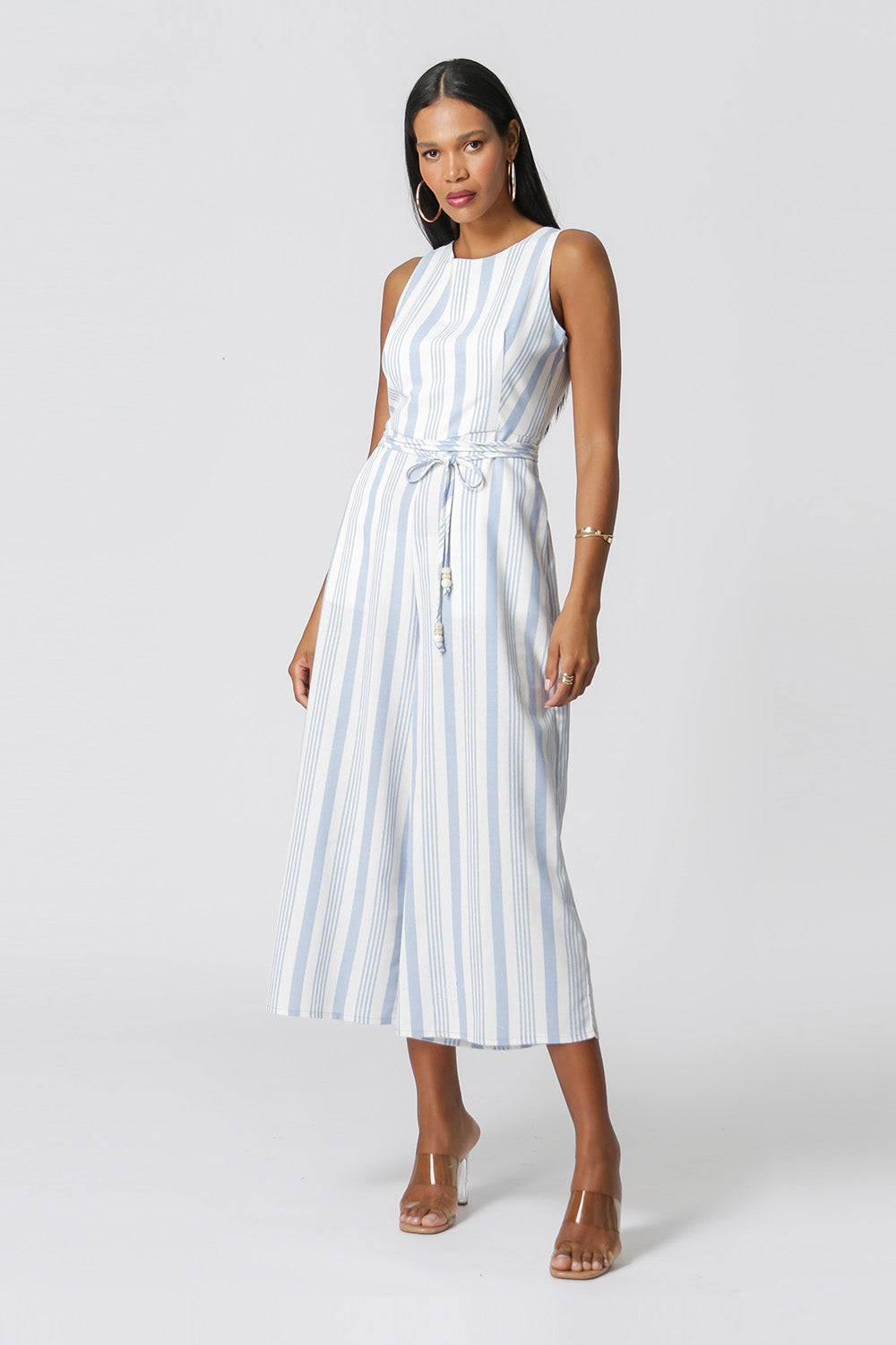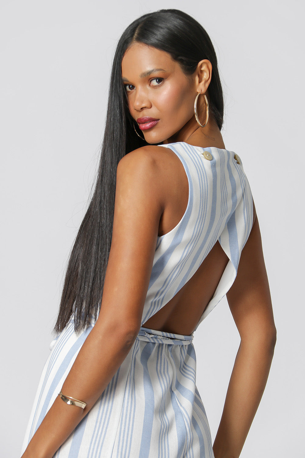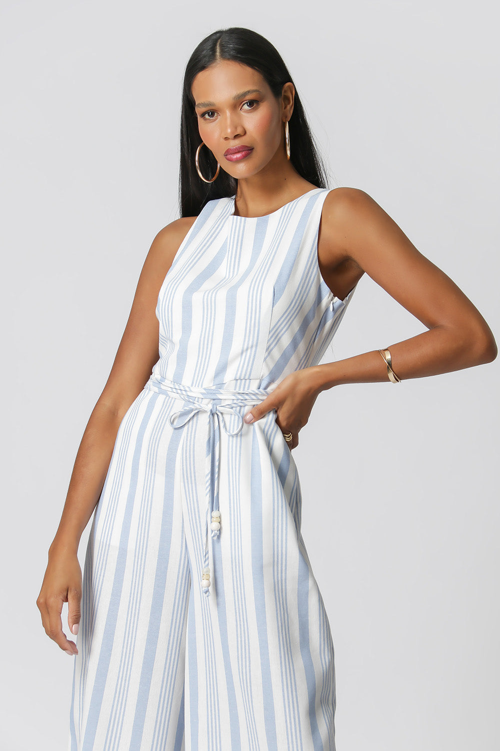 Macacão com abertura nas costas, tiras para amarração na cintura e botões. Peça confeccionada em tecido Linho Listrado. Um modelo superconfortável para mulheres criativas e que não dispensam elegância no look.