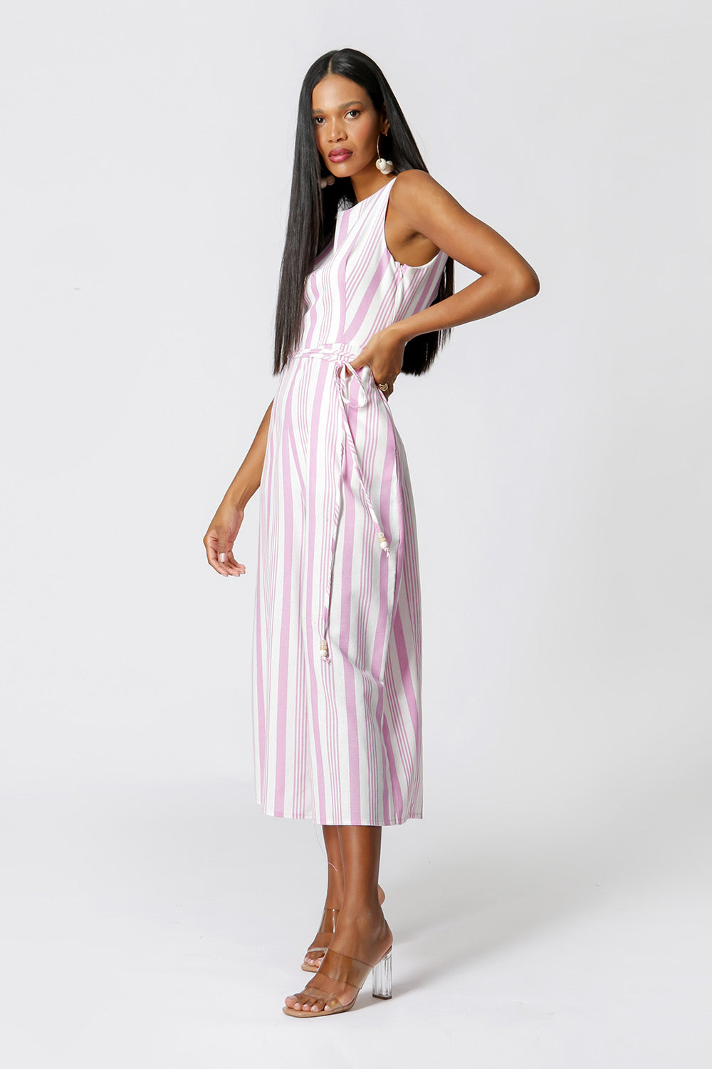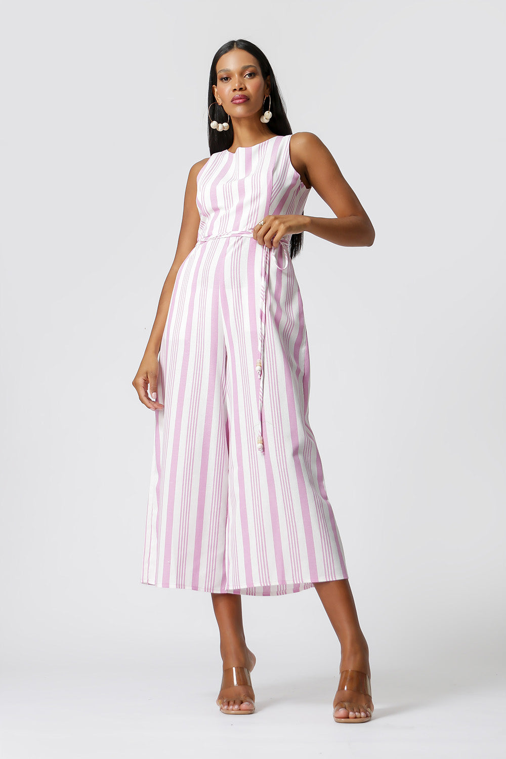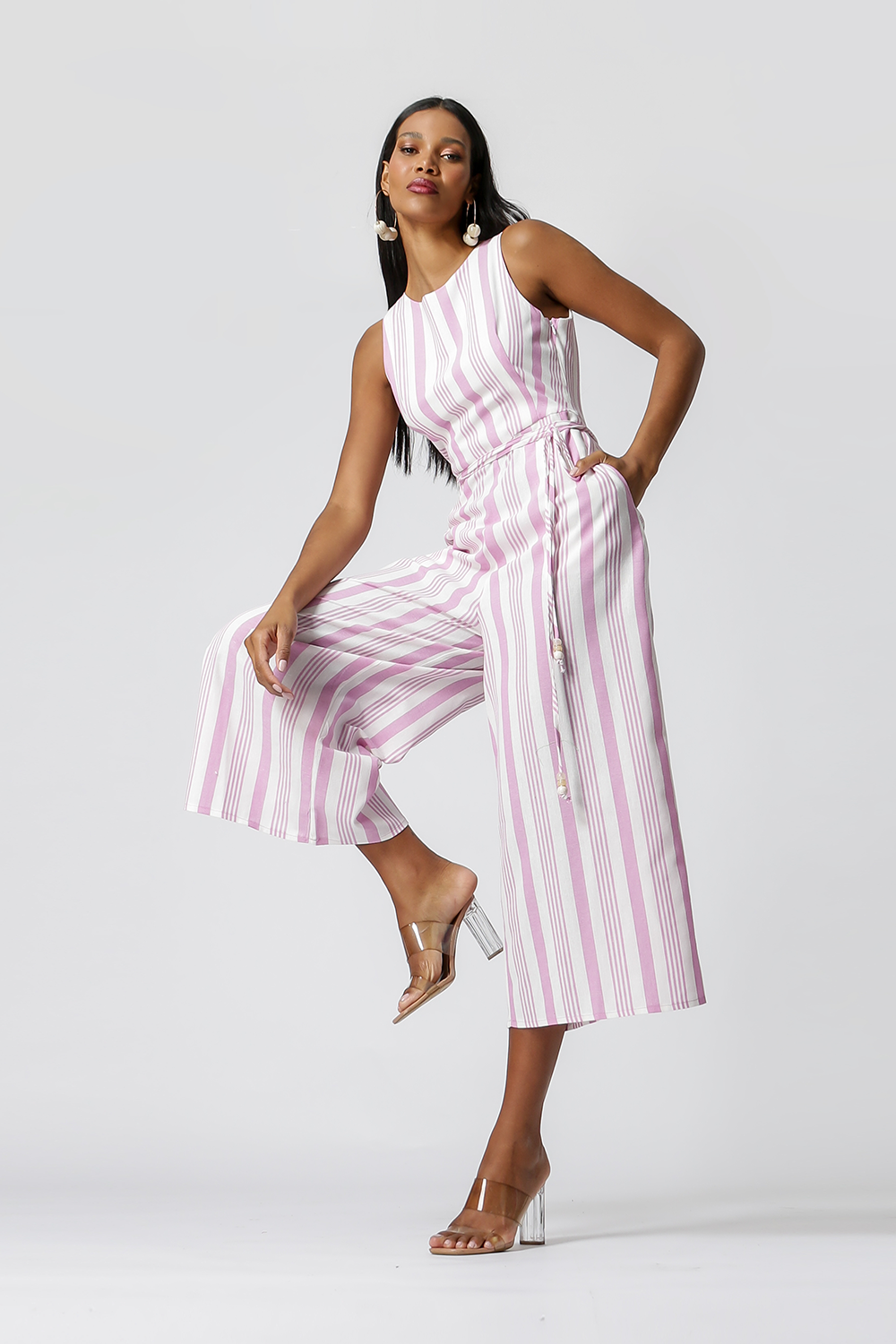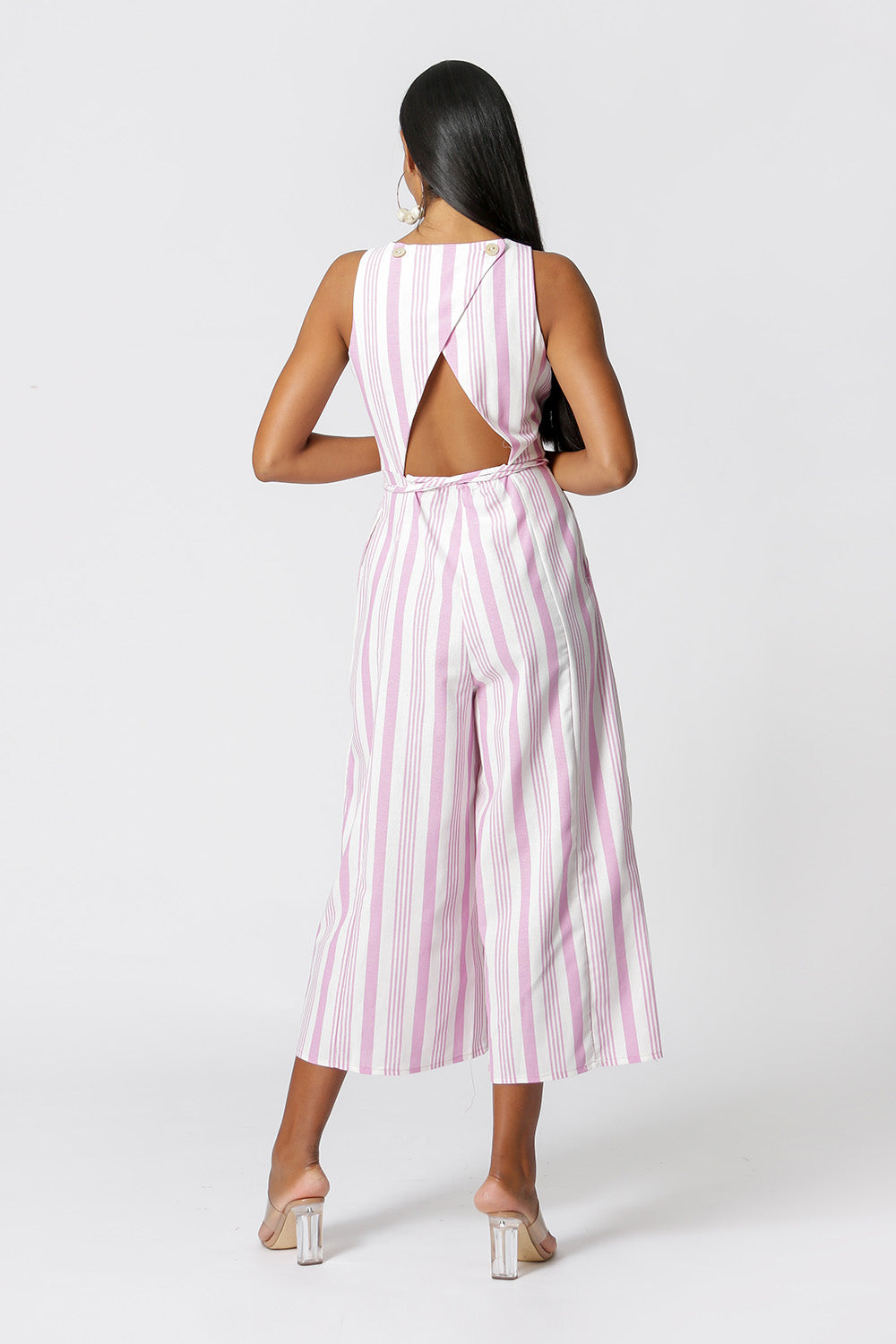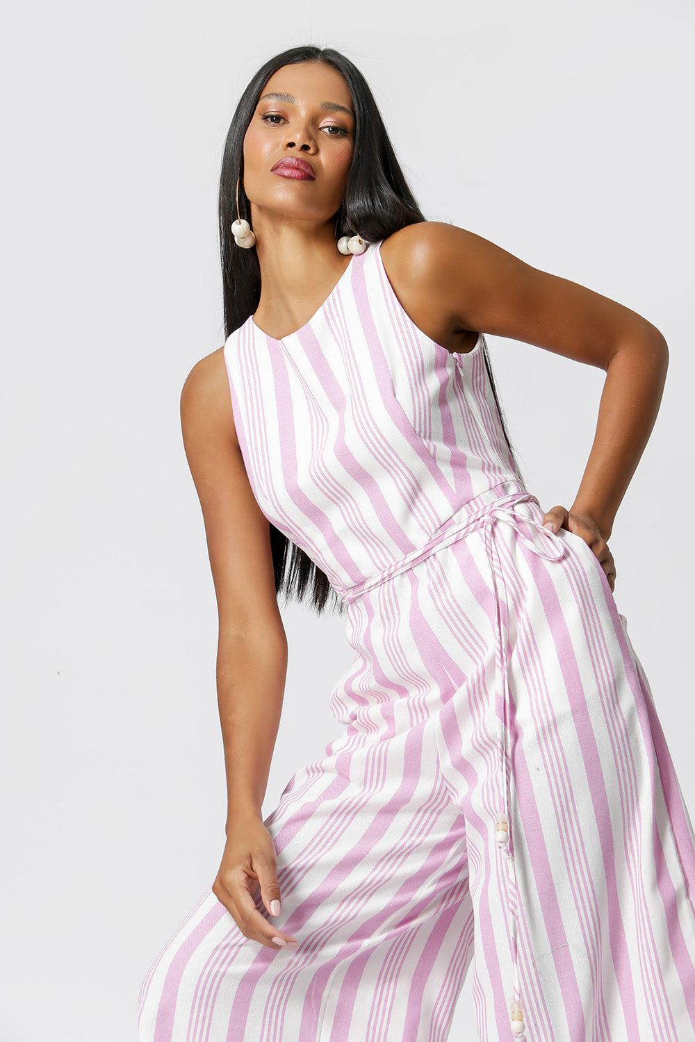 Macacão com abertura nas costas, tiras para amarração na cintura e botões. Peça confeccionada em tecido Linho Listrado. Um modelo superconfortável para mulheres criativas e que não dispensam elegância no look.