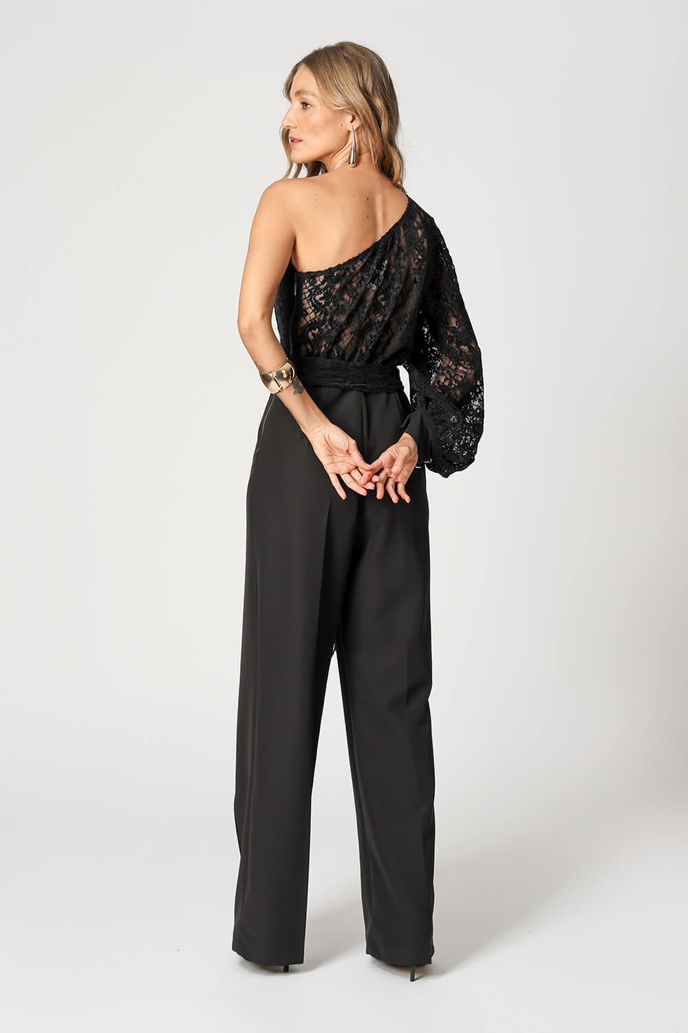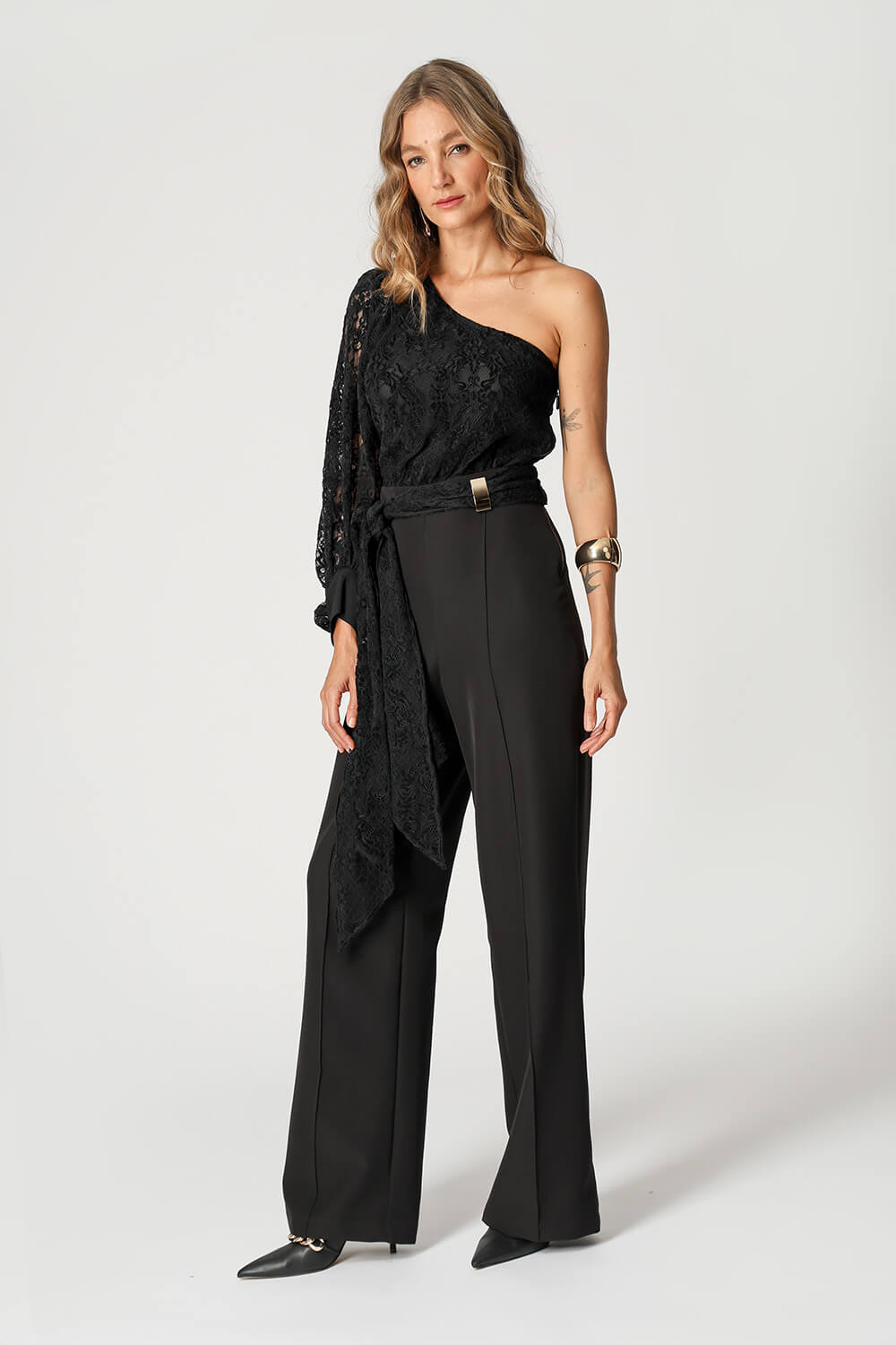 Com modelagem sofisticada e caimento impecável, este macacão ombro único une a elegância da alfaiataria à delicadeza da renda. A echarpe removível adiciona um toque versátil e feminino, ideal para compor looks marcantes em ocasiões especiais.
