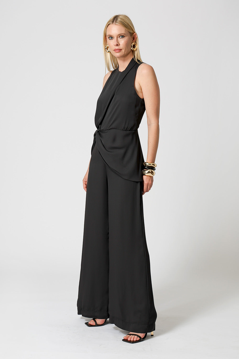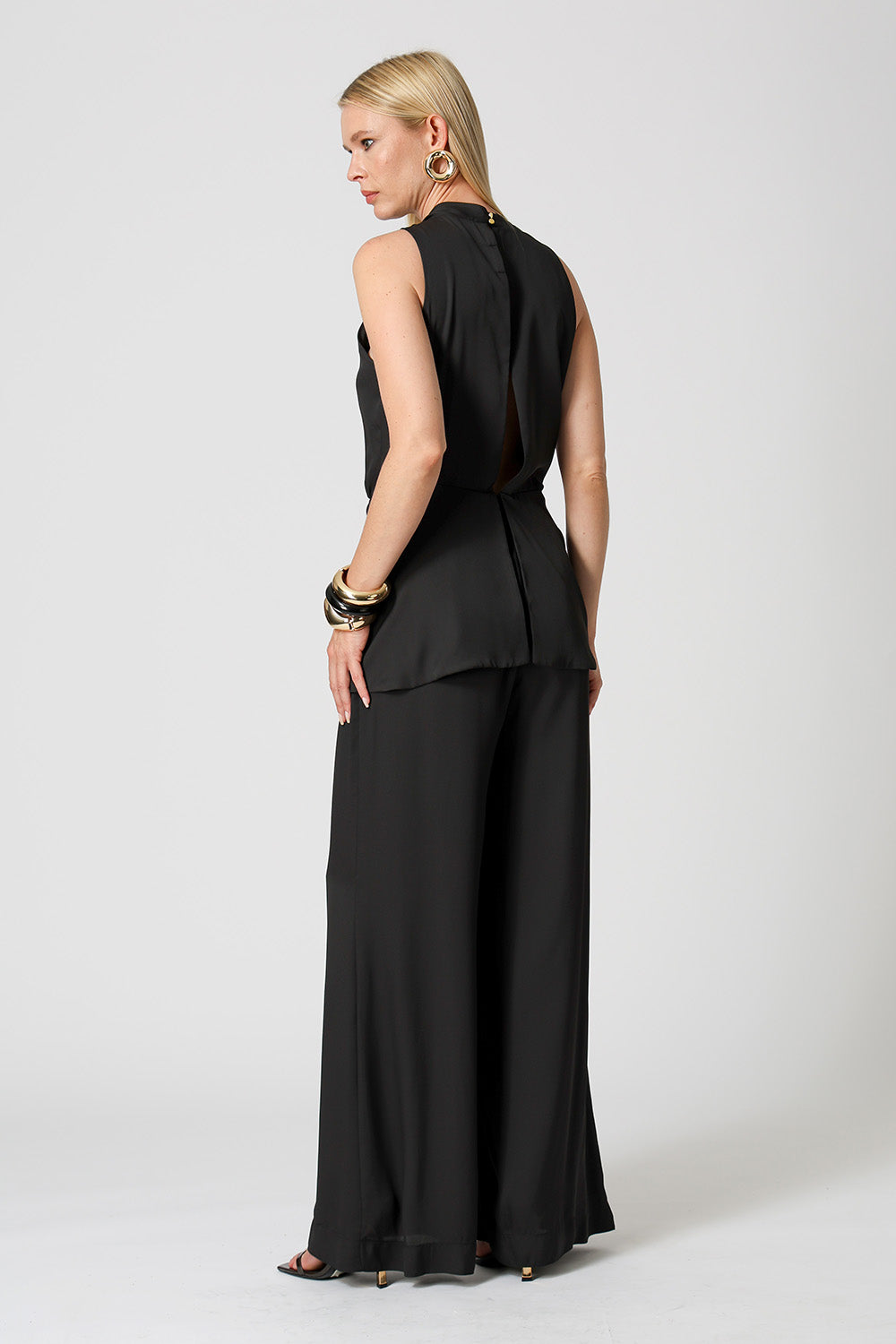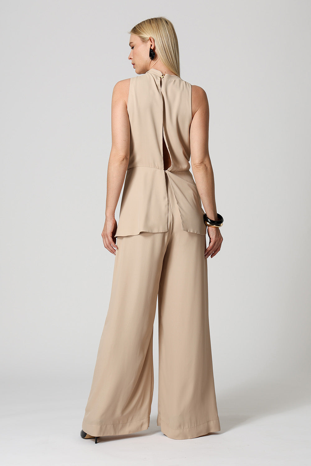 Macacão elegante em crepe Segall, com pala sobreposta, blusa de pregas no ombro e abertura nas costas. Caimento leve e sofisticado, ideal para ocasiões especiais.