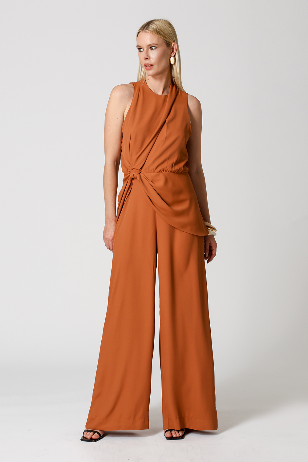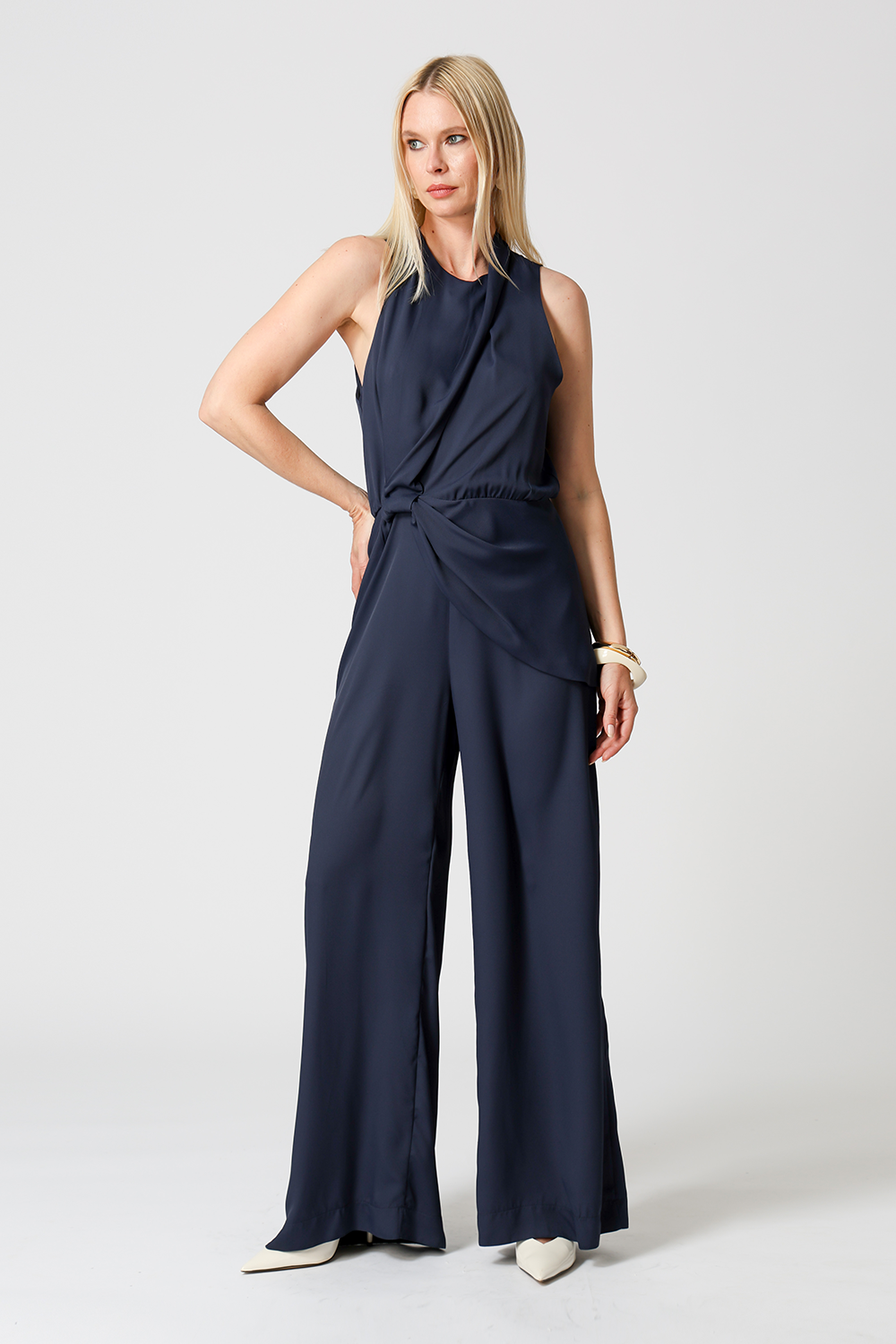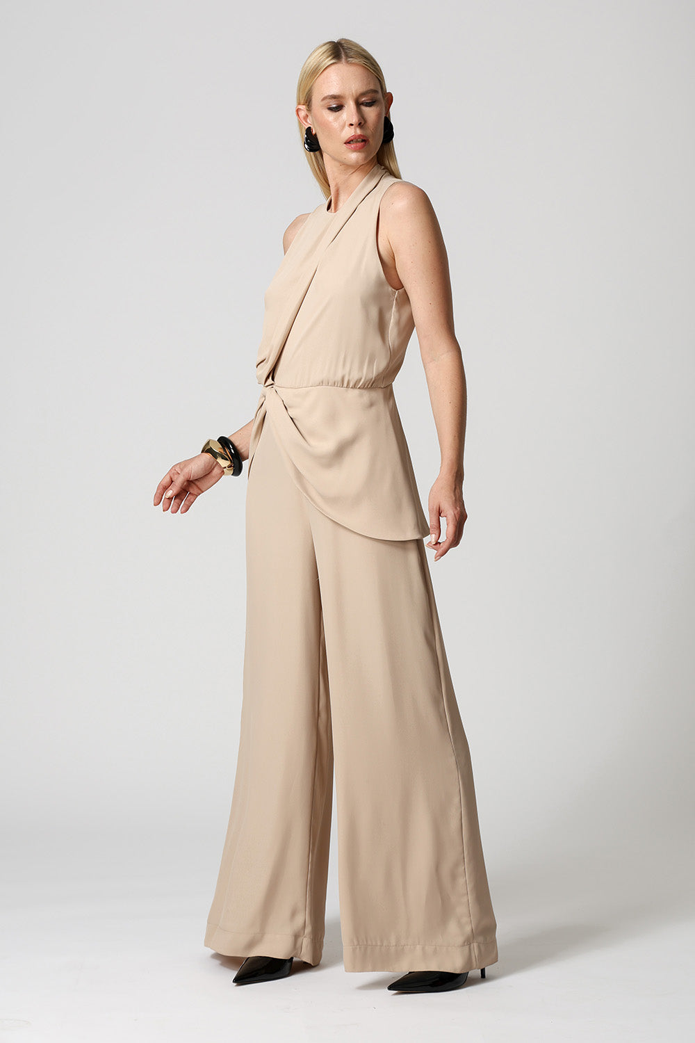 Macacão elegante em crepe Segall, com pala sobreposta, blusa de pregas no ombro e abertura nas costas. Caimento leve e sofisticado, ideal para ocasiões especiais.