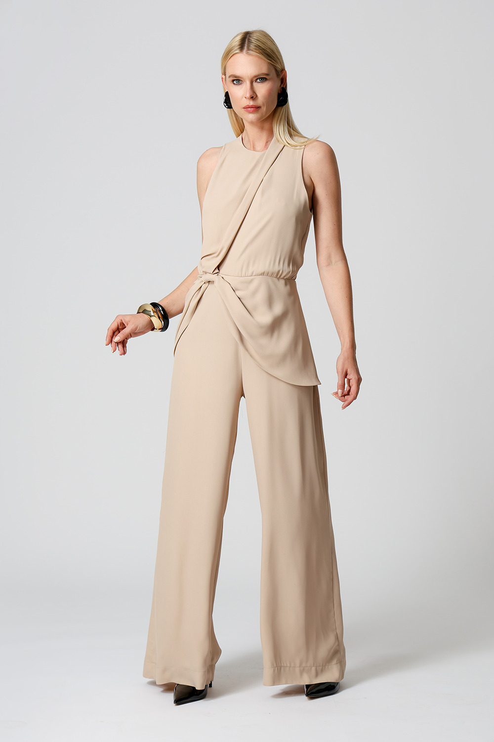 Macacão elegante em crepe Segall, com pala sobreposta, blusa de pregas no ombro e abertura nas costas. Caimento leve e sofisticado, ideal para ocasiões especiais.