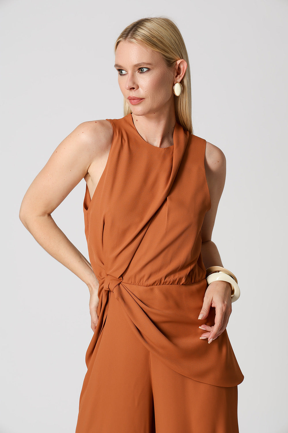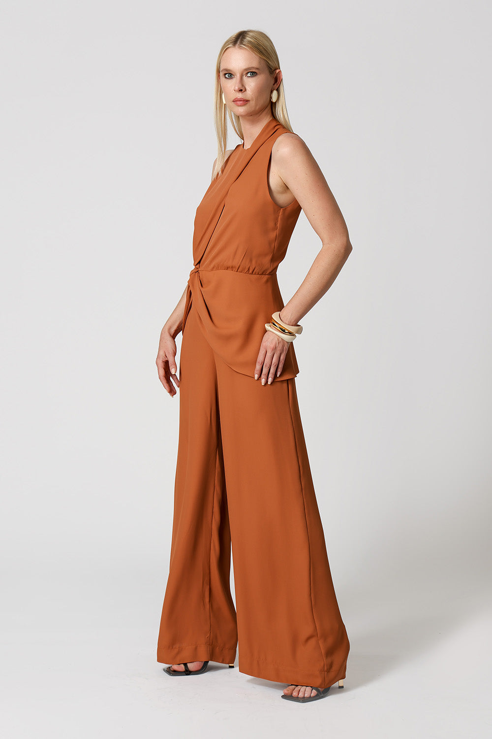 Detalhe de prega sobreposta no decote e pala sobreposta na calça