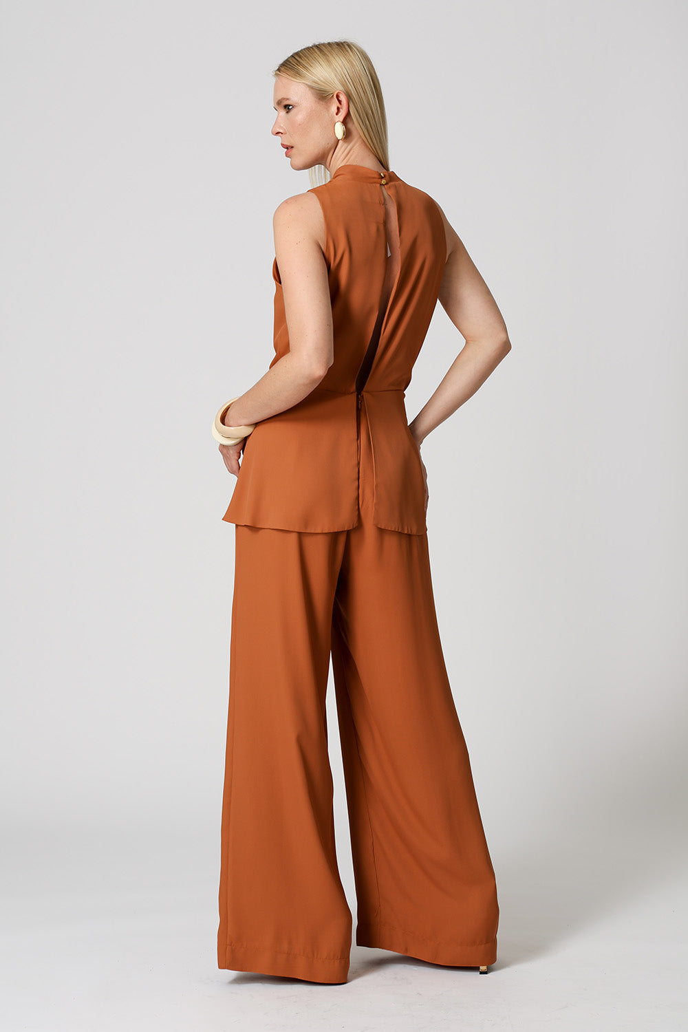 Macacão elegante em crepe Segall, com pala sobreposta, blusa de pregas no ombro e abertura nas costas. Caimento leve e sofisticado, ideal para ocasiões especiais.