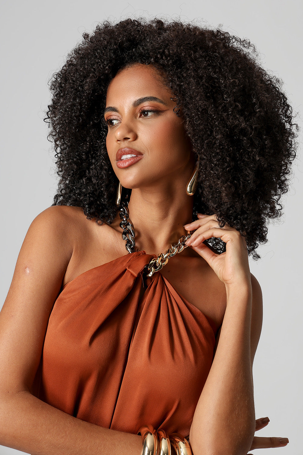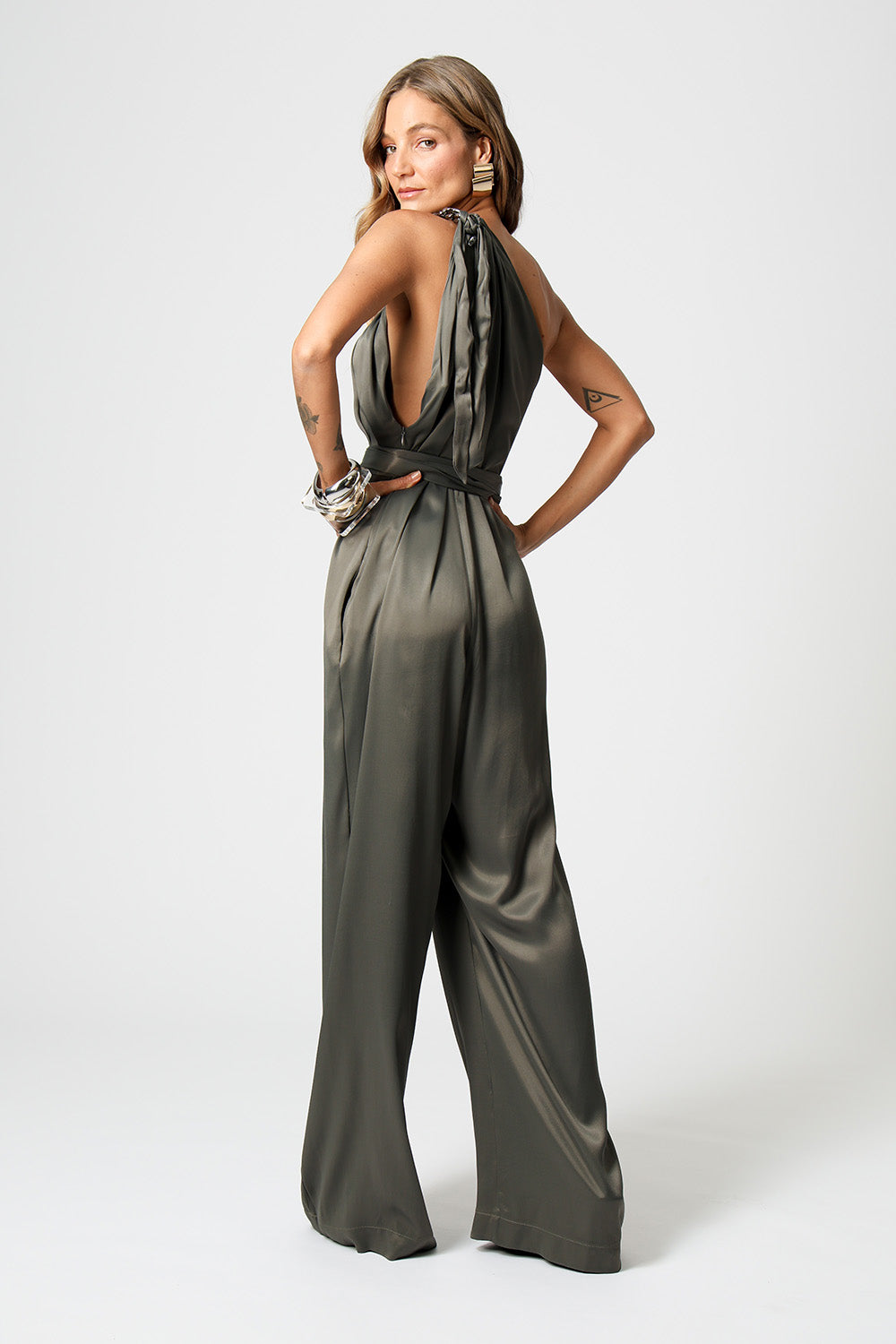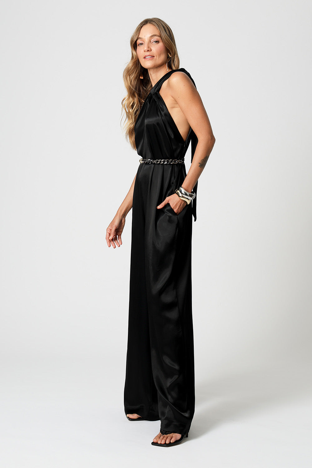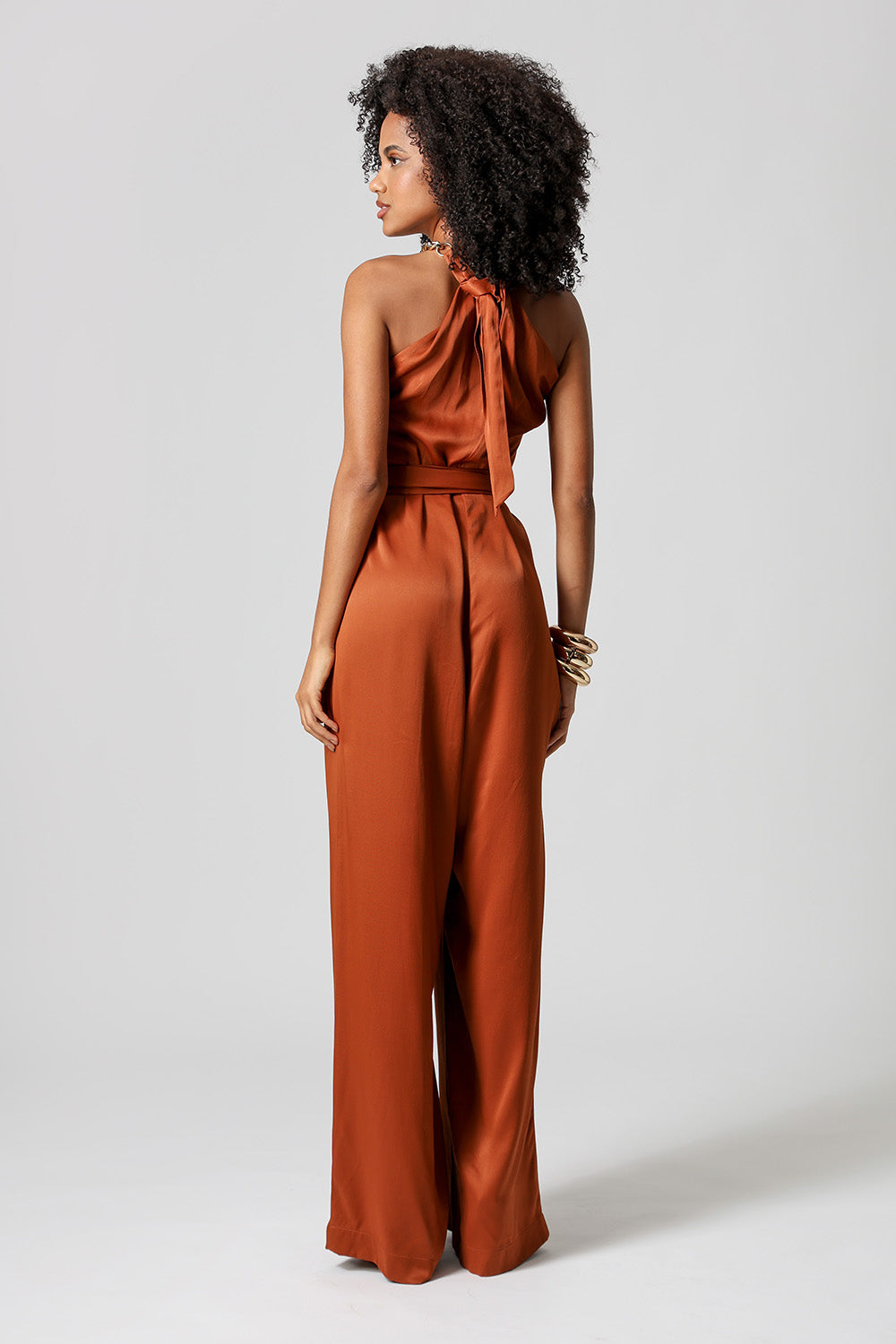 Macacão em crepe twill com detalhe torcido na gola e corrente aplicada na faixa de amarração. Sofisticado e moderno, ideal para ocasiões especiais.
