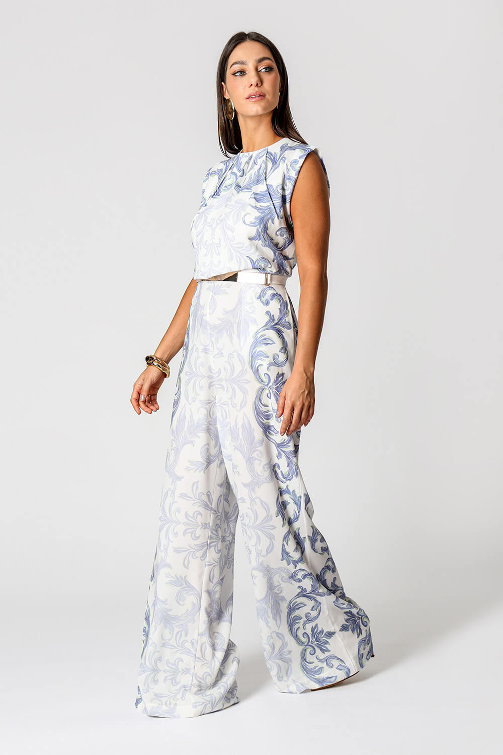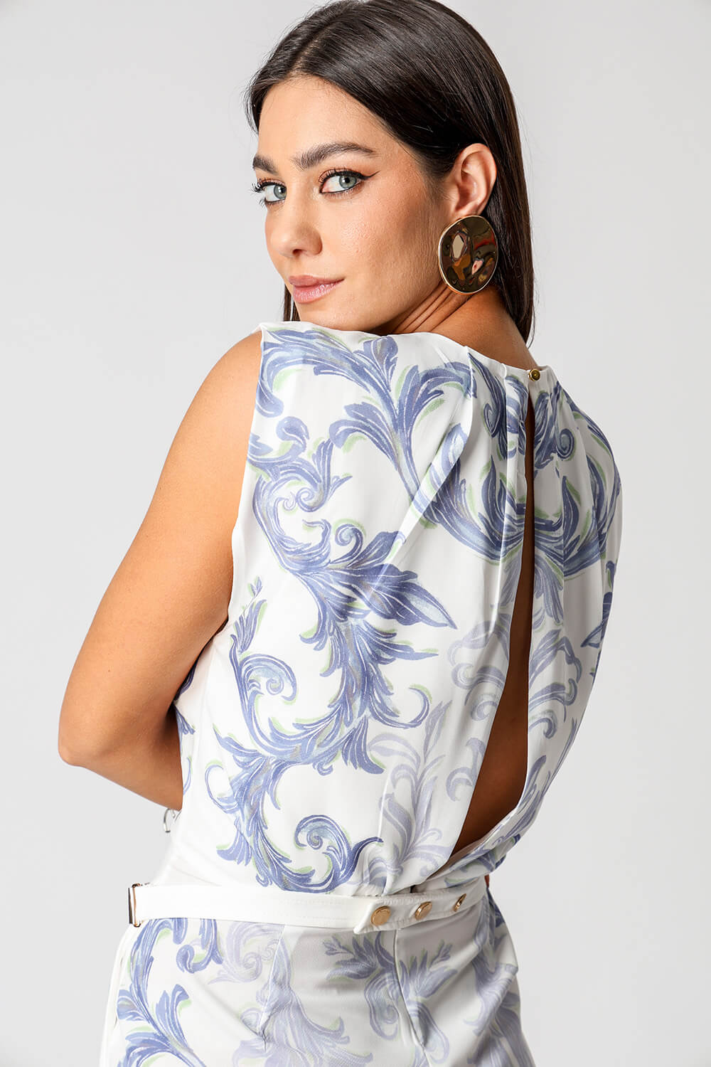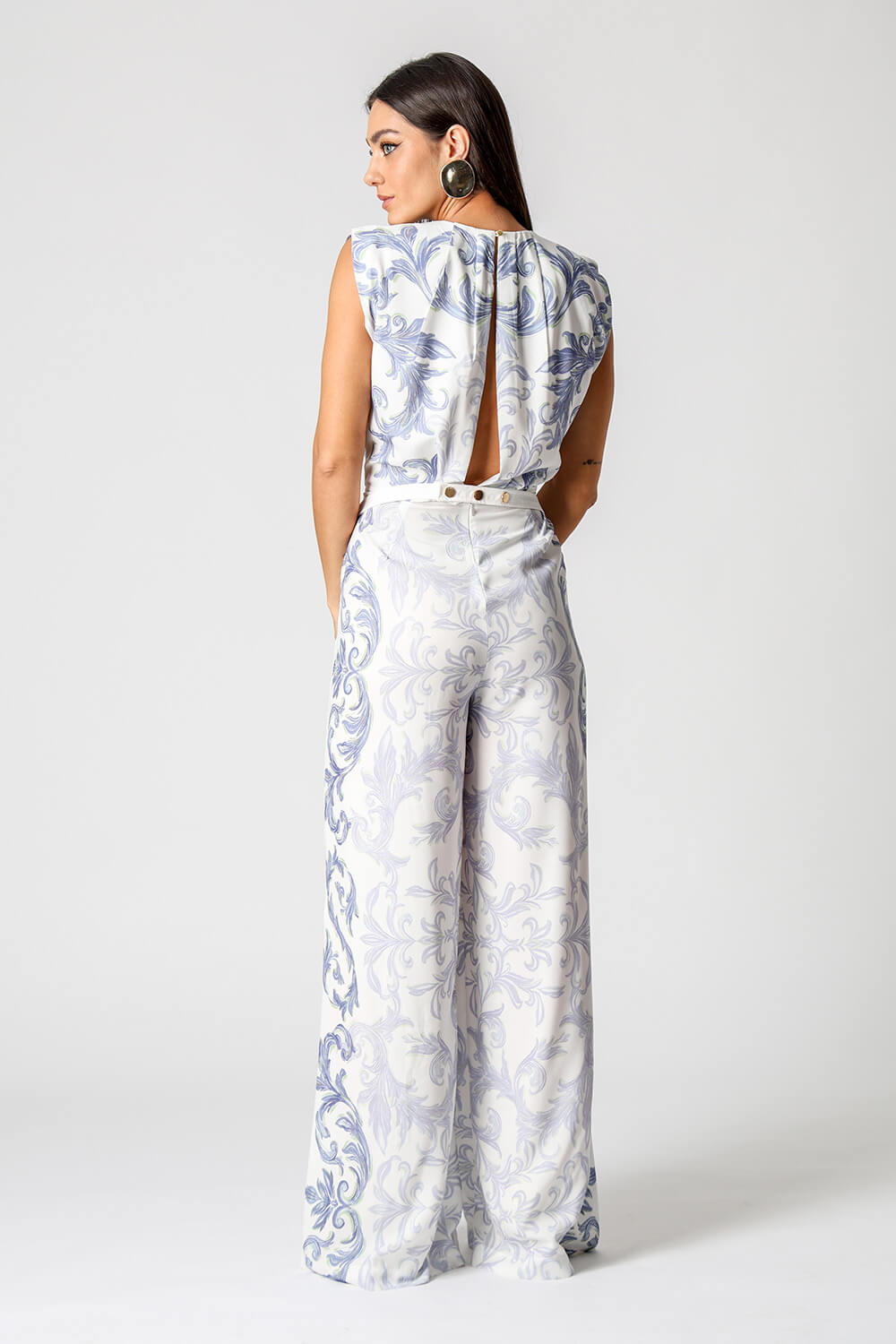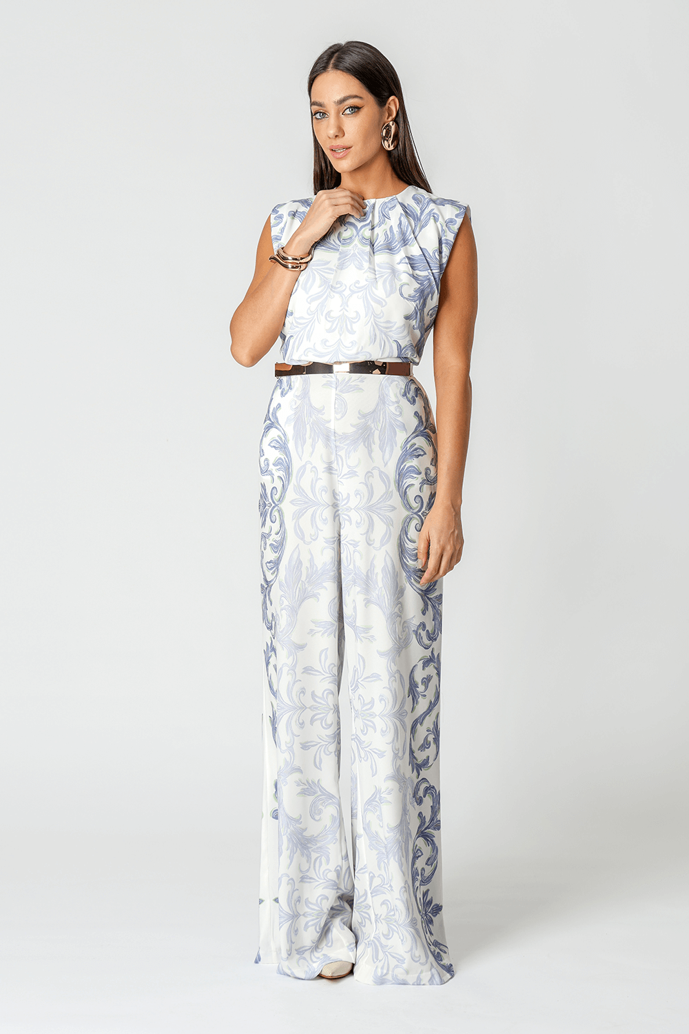 Macacão estampado em crepe twill com parte superior blusada, gola com pregas e abertura nas costas. Acompanha cinto de pala dourada, trazendo elegância e destaque ao look. Caimento leve e sofisticado para diversas ocasiões.
