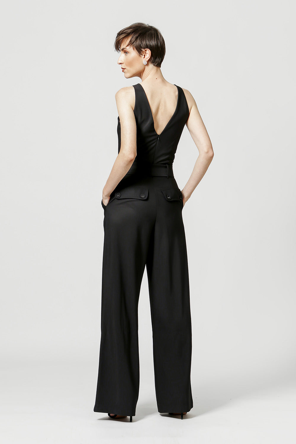 Macacão confeccionado em malha com shape mais justo na cintura, com cinto forrado e calça longa reta, decote V profundo nas costas, recortes na parte do busto, pences pespontadas na parte da calça e lapelas com botões não funcionais. É uma peça com uma pegada work, mas também pode ser usado para sair. Use e arrase!!