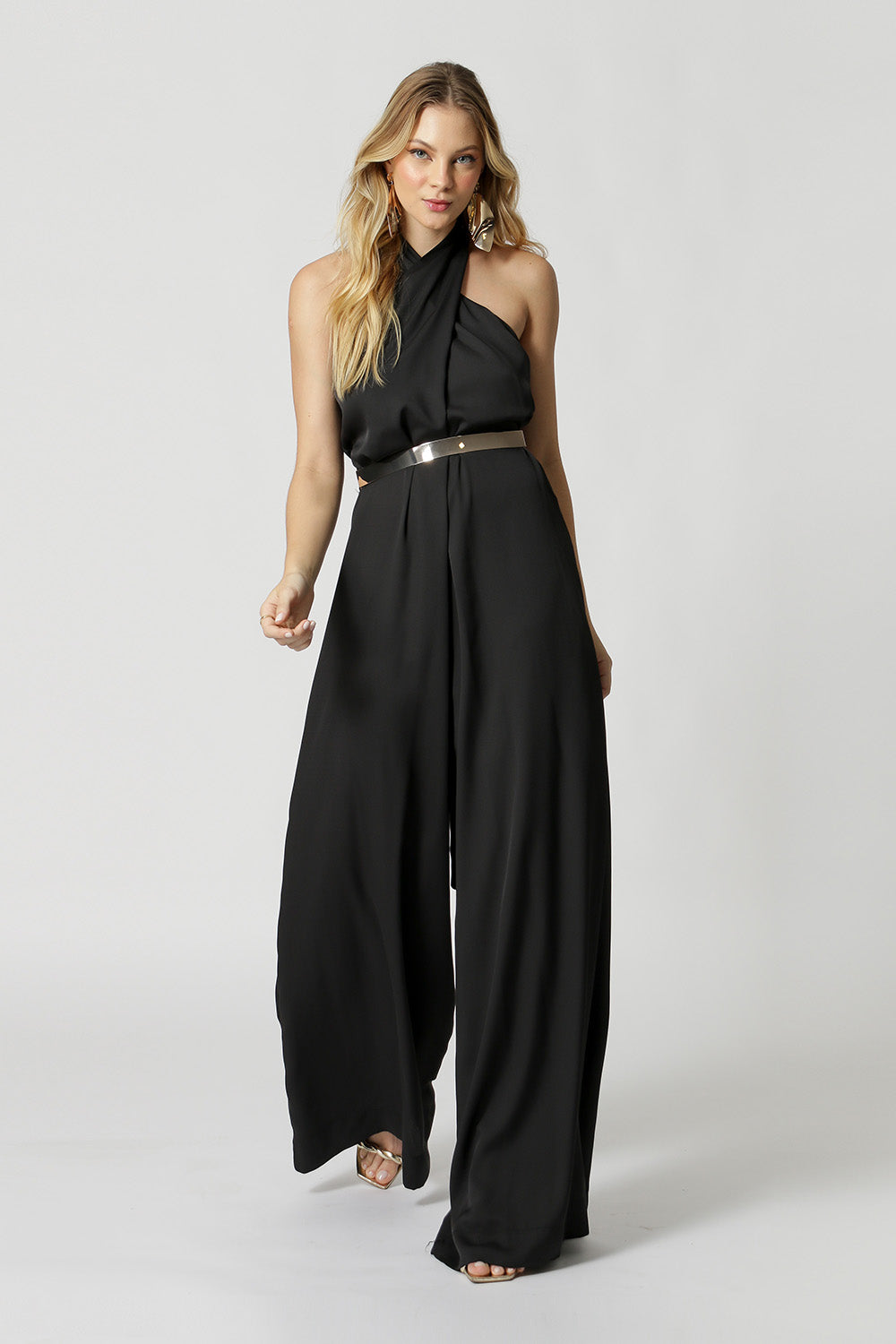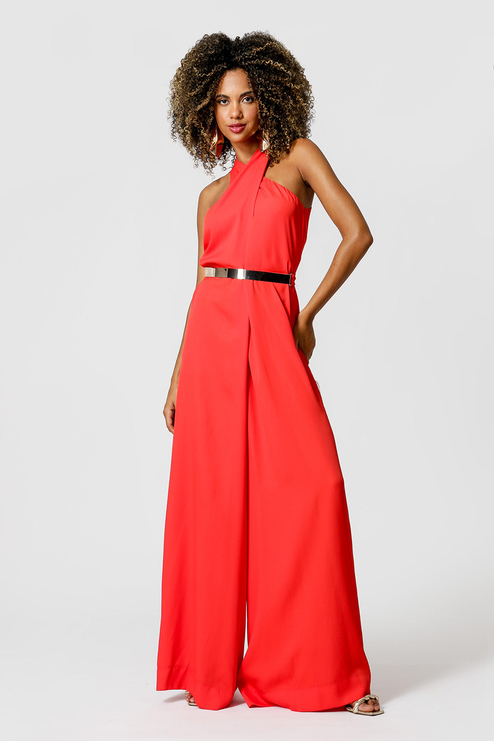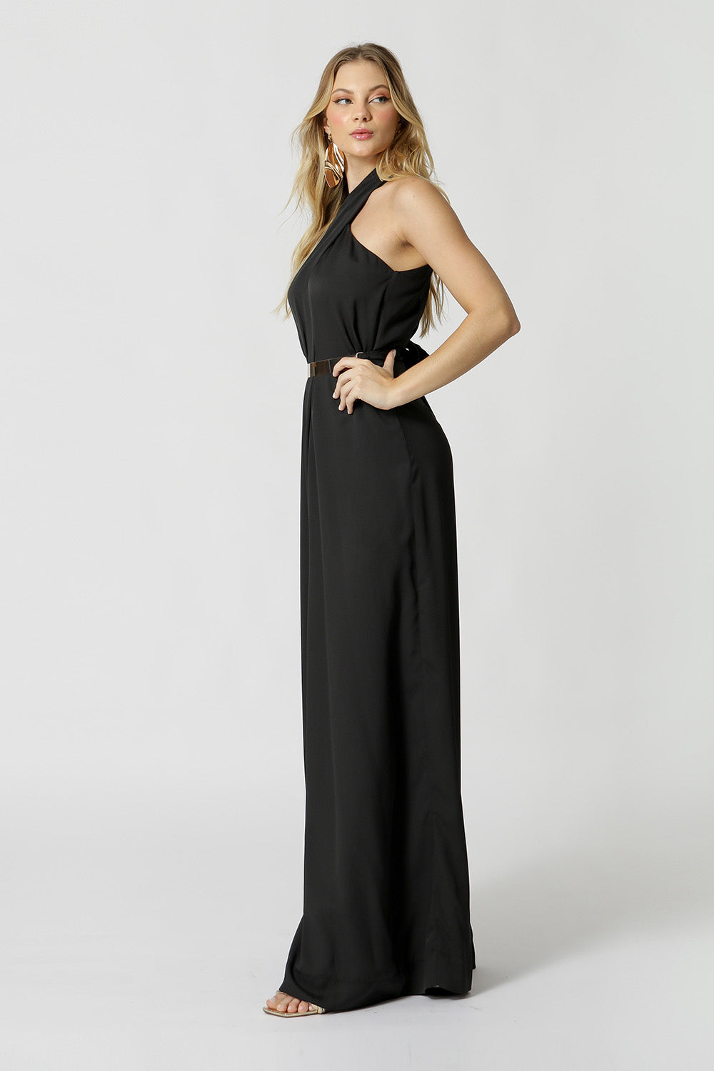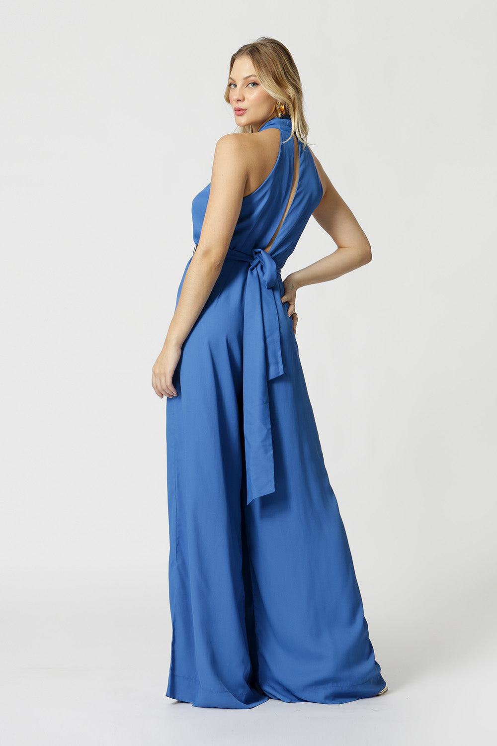 Macacão longo com decote transpassado e detalhe de faixa na cintura do próprio tecido junto com metal preso. Confeccionado em tecido crepe fluído. Um modelo super elegante, sofisticado e ideal para usar no mood night aposte.