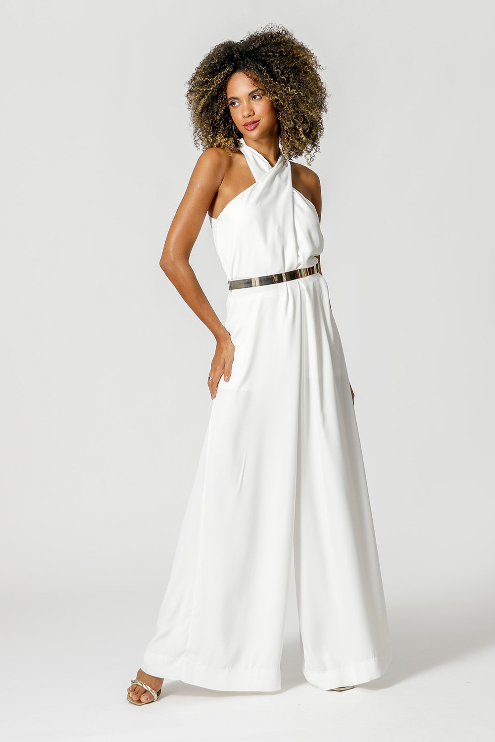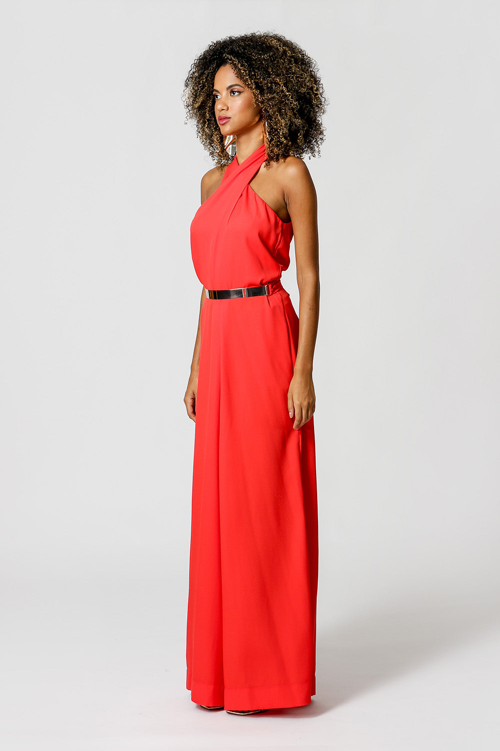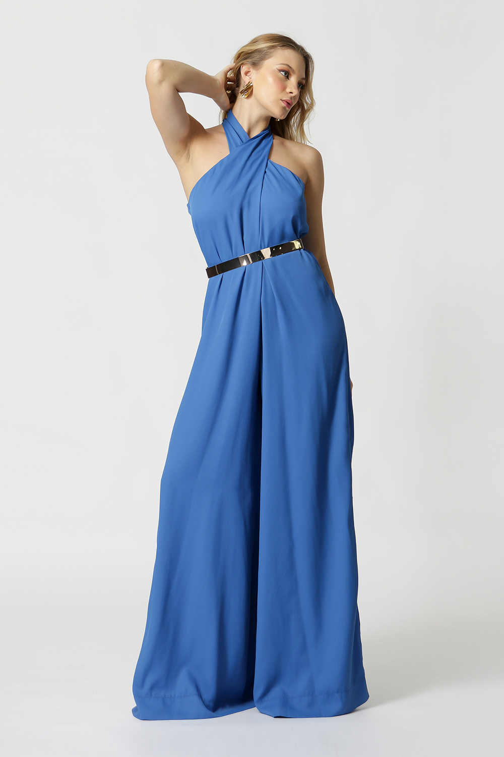 Macacão longo com decote transpassado e detalhe de faixa na cintura do próprio tecido junto com metal preso. Confeccionado em tecido crepe fluído. Um modelo super elegante, sofisticado e ideal para usar no mood night aposte.